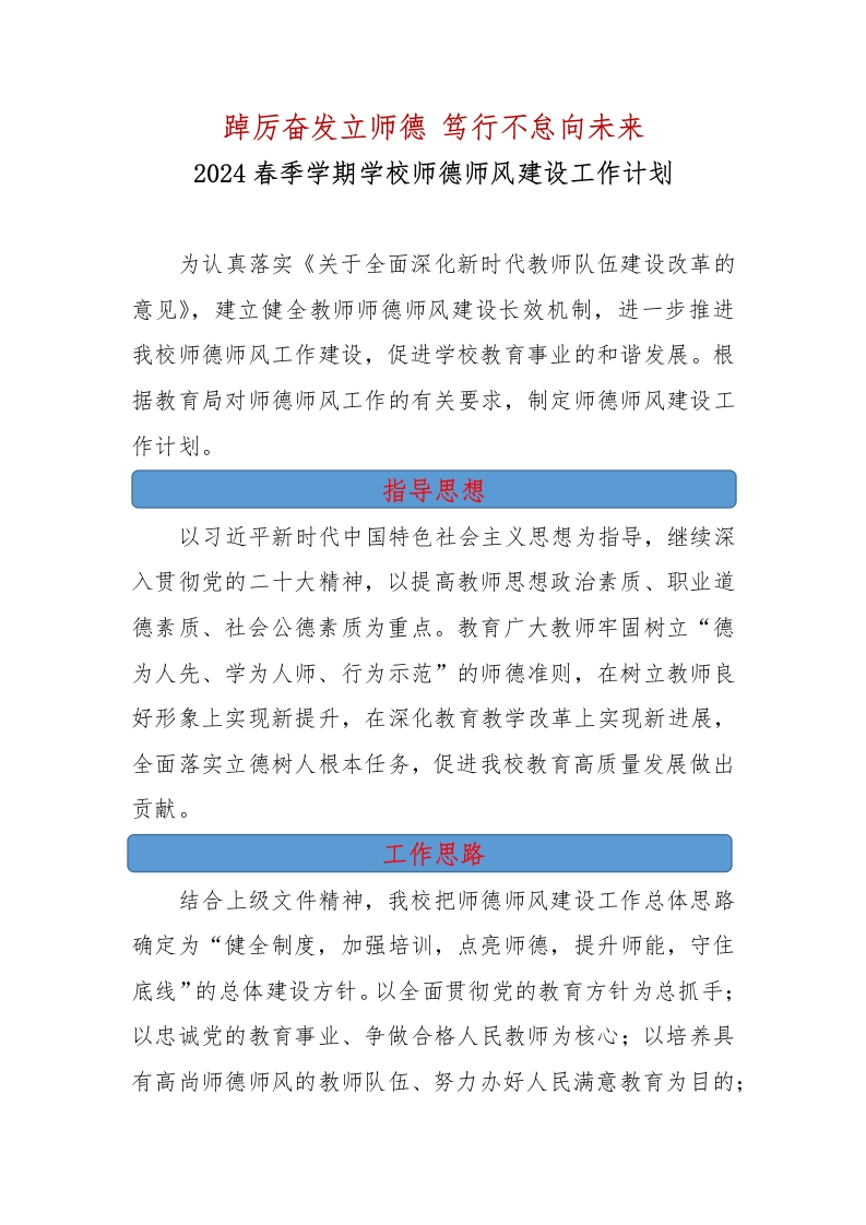 踔厉奋发立师德笃行不怠向未来2024春季学期学校师德师风建设工作计划为认真落实《关于全面深化新时代教师队伍建设改革的意见》,建立健全教师师德师风建设长效机制,进一步推进我校师德师风工作建设,促进学校教育事业的和谐发展。根据教育局对师德师风工作的有关要求,制定师德师风建设工作计划。指导思想以习近平新时代中国特色社会主义思想为指导,继续深入贯彻党的二十大精神,以提高教师思想政治素质、职业道德素质、社会公德素质为重点。教育广大教师牢固树立“德为人先、学为人师、行为示范”的师德准则,在树立教师良好形象上实现新提升,在深化教育教学改革上实现新进展,全面落实立德树人根本任务,促进我校教育高质量发展做出贡献。工作思路结合上级文件精神,我校把师德师风建设工作总体思路确定为“健全制度,加强培训,点亮师德,提升师能,守住底线”的总体建设方针。以全面贯彻党的教育方针为总抓手;以忠诚党的教育事业、争做合格人民教师为核心;以培养具有高尚师德师风的教师队伍、努力办好人民满意教育为目的: