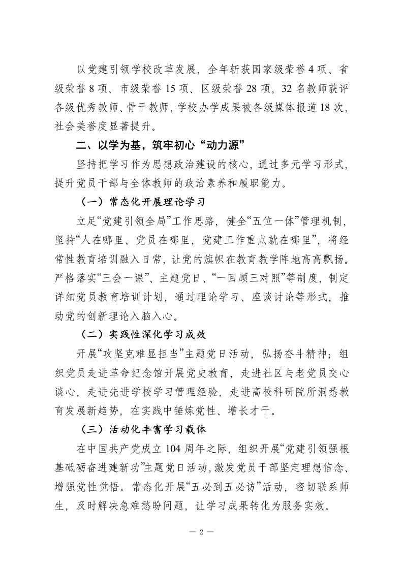 校长2025年度党建述职报告:以党建融合赋能学校教育高质量发展尊敬的各位领导、同志们:今年,学校党委深入贯彻落实中央及省市区委重大决策部署,牢牢把握“为党育人、为国育才”根本方向,以“党建与教育教学深度融合”为核心,扎实推进党风廉政建设与党组织建设,各项工作求真务实、成效显著。现将本人抓党建工作情况述职如下,请予评议。一、以责为先,把稳党建“方向盘”党建是学校发展的定海神针,我们始终将党的领导贯穿办学全过程,强化政治引领与组织保障。(一)强化思想引领深入学习贯彻党的二十大及二十届历次全会精神,聚焦立德树人根本任务,在制度设计、队伍建设、教育教学、品牌塑造等关键工作中,充分发挥党组织战斗堡垒作用和党员先锋模范作用,确保学校发展不偏航、不走样。(二)夯实组织基础结合党员教师队伍壮大实际,持续优化党委领导体制与工作机制,细化党员教育、管理、监督、服务全流程举措,打造政治过硬、业务精湛的骨干队伍。2025年承办区级党建竞进拉练转转会等活动3场,接待兄弟单位党建参观学习30余次,党建示范效应持续扩大。(三)推动创先争优一1