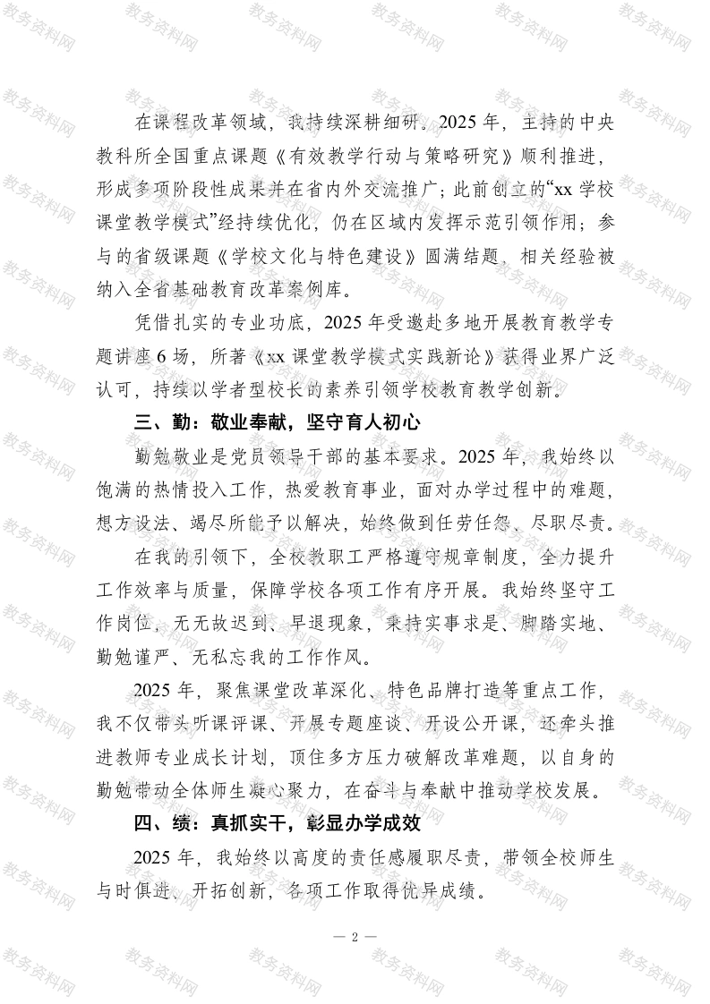 校长2025年度德能勤绩廉述职报告一年来,我始终秉持“认认真真学习、踏踏实实干事、清清白白为人”的准则,在上级领导的关心指导与全体师生的支持帮助下,认真履行校长职责,坚守教育初心,推动学校各项工作稳步前行。现将本年度德、能、勤、绩、廉五个方面的工作情况述职如下,请予评议。一、德:铸魂育人,筑牢思想根基理论学习是领导干部立身之本、成事之基。2025年,我持续深入学习党的二十大及二十届历次全会精神、习近平新时代中国特色社会主义思想,重点研读关于教育、社会主义核心价值观的重要论述,思想上、行动上始终与党中央保持高度一致。作为教育工作者,我深耕《深化新时代基础教育改革总体方案》等政策文件,深刻领会新时代教育发展方向,进一步坚定了推进教育教学改革的信念。工作中顾全大局、不争名夺利、不计较个人得失,始终以优秀共产党员的标准严格要求自己,在思想、政治、业务上不断完善自我,树立科学发展观、正确政绩观和牢固群众观,全心全意为学校发展、为师生成长尽职尽责。二、能:深耕实践,提升履职效能深耕教育战线30余年,我从一线教师到学校管理者,始终未脱离教学课堂,积累了丰富的教育教学与学校管理经验。2025年,我依然坚守教学一线,全年听课达45节,深入课堂与师生交流,精准把握教学动态。—1