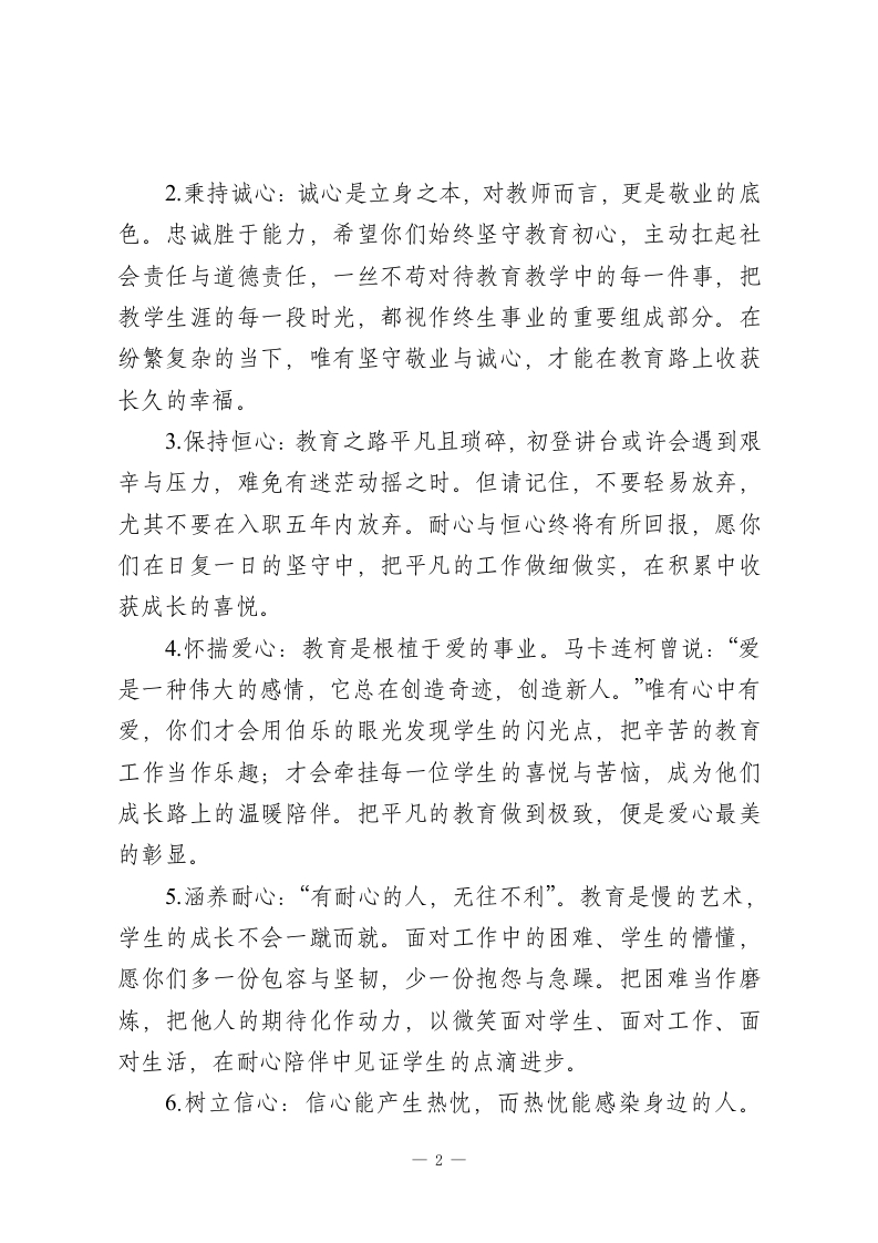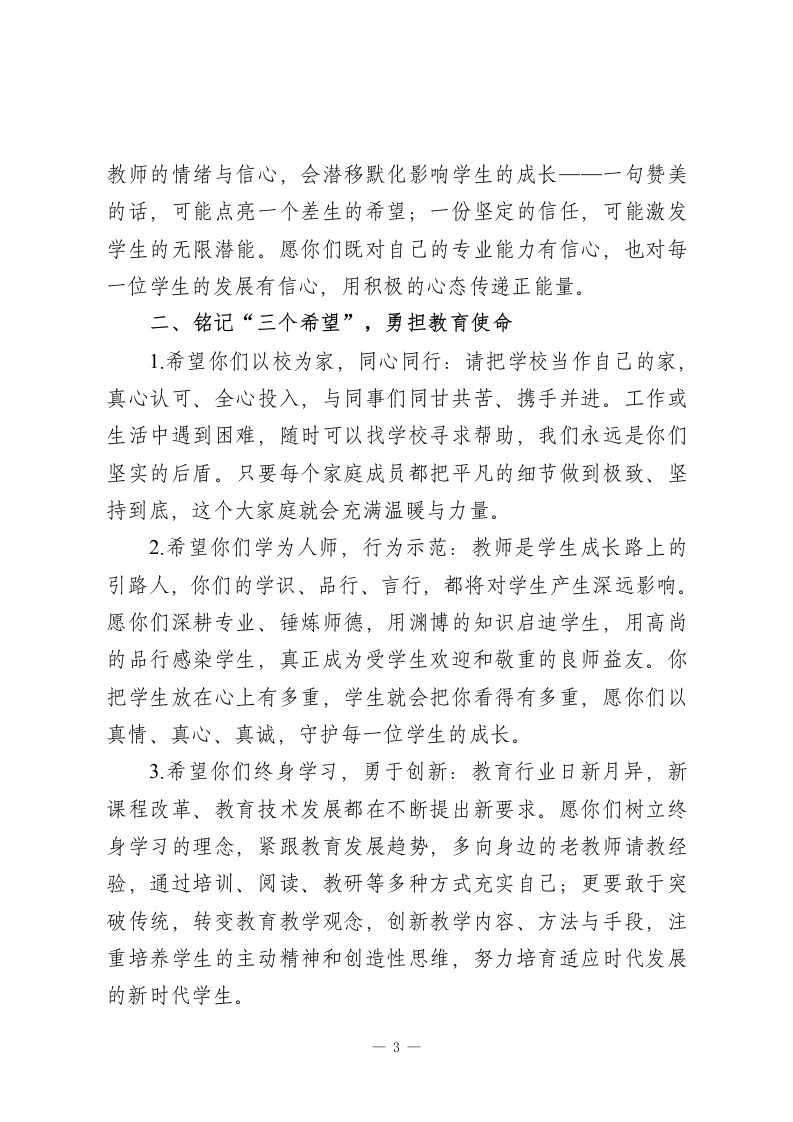校长对新教师讲话:以心育心,以行践远各位新老师:大家下午好!初次见面,你们身上的青春朝气、饱满激情和昂扬斗志,给我留下了深刻印象。在此,我代表学校全体师生,向你们正式加入XX学校这个大家庭,表示最热烈的欢迎!有了你们的到来,我们的校园将更具生机与活力,教育事业也将注入全新动能!当你们翻开教师生涯的崭新一页,不妨静下心思考一个问题:“成为一名教师,究竟意味着什么?”它或许不是世俗意义上的“铁饭碗”,更无关功名利禄的追逐,而应是一份沉甸甸的信仰一一把教育事业放在人生价值的核心位置。薪酬是生活的保障,外在的肯定是额外的奖赏,而那颗热爱教育的初心,才是我们永葆激情的源泉,是立足教育岗位的意义所在。下面,我想以“六个心”和“三个希望”,与大家共勉,愿你们在教育这片沃土上扎根生长、绽放光彩。一、坚守“六个心”,筑牢育人根基1锻造静心:“非淡泊无以明志,非宁静无以致远”。静心是教师职业精神的核心,愿你们远离浮躁,静下心备好每一堂课、批改每一本作业、与每一位学生真诚对话;静下心研究学问、读书学习、总结规律、反思言行,在沉淀中超越自我、精进成长。一1