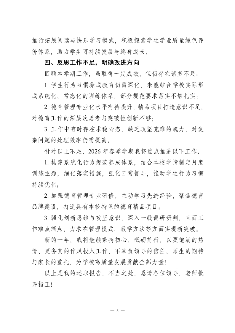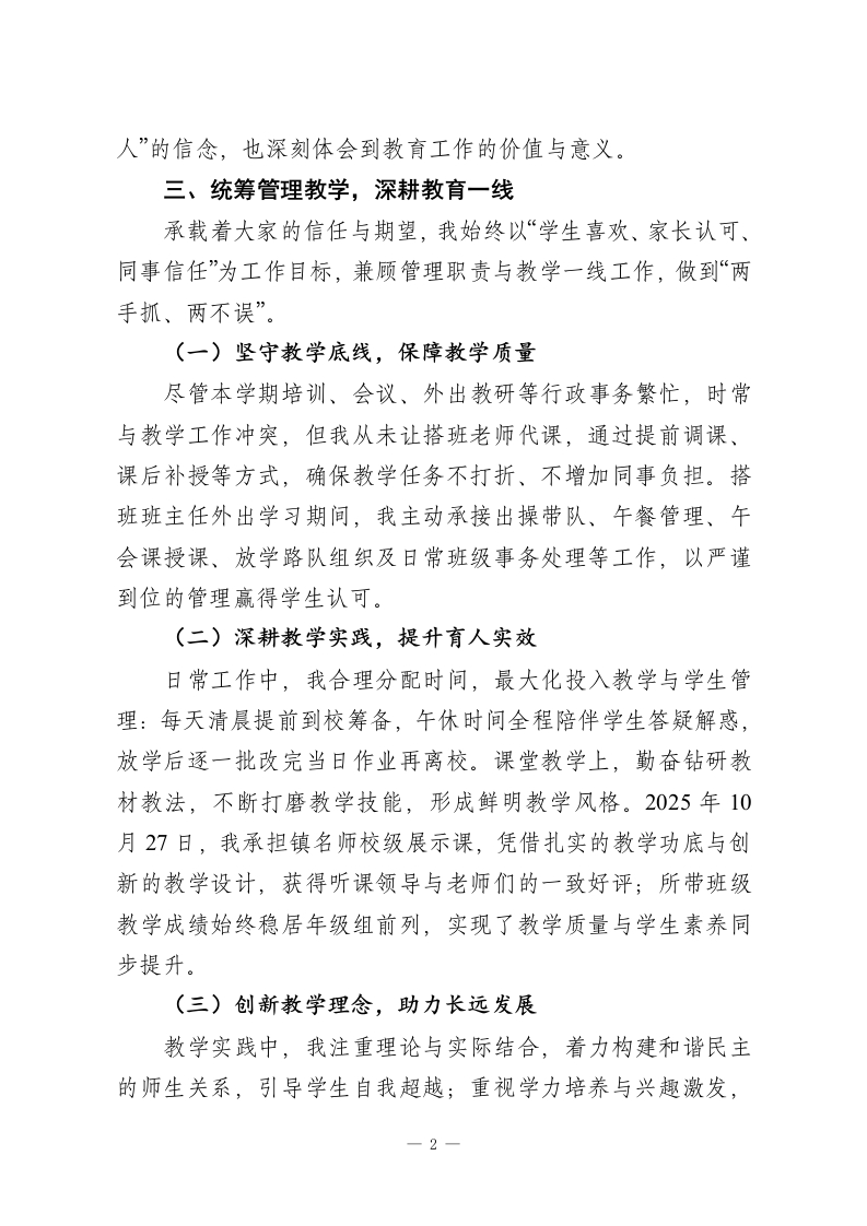 校长个人述职报告:聚焦育人实效,深耕教育一线尊敬的各位领导、老师们:大家好!本学期,在上级领导的悉心指导与全体教职工的鼎力支持、理解配合下,我始终坚守教育初心,聚焦育人根本,圆满完成了本学期各项工作任务。在此,向大家致以诚挚的感谢!现将本学期个人工作情况汇报如下:一、强化理论学习,筑牢履职根基“德为师之本”,作为学校管理者,我始终将师德修养与理论学习放在首位。工作生活中,以高标准约束自身言行,率先垂范,用人格魅力凝聚师生合力。本学期,我先后参加2025年市中小学校长暑期专题培训、市新优质项目暑期校长培训、区教育系统校级干部进阶培训班,坚持学思践悟、总结沉淀。日常保持每日半小时学习习惯,重点钻研学校管理、德育专业知识,不断优化知识结构,提升履职能力,确保工作方向不偏、力度不减。二、聚焦师生需求,提升服务效能师生满意、家长认可是教育工作的核心追求。本学期,我始终秉持“以人为本”理念,主动回应师生及家长诉求,积极化解各类矛盾纠纷。无论是教师工作中的困惑、家长育儿中的难题,还是学生成长中的烦恼,我都竭尽所能运用教育智慧耐心协调解决。每一份真诚的认可与感谢,都让我更加坚定“服务育一1