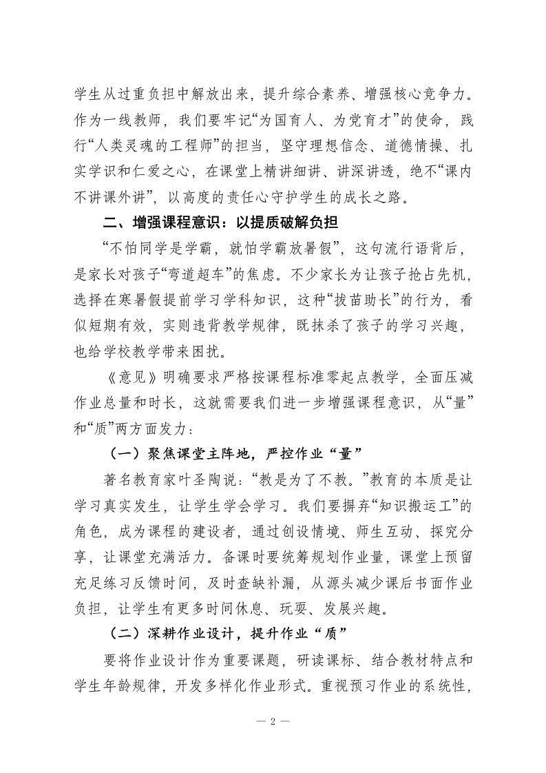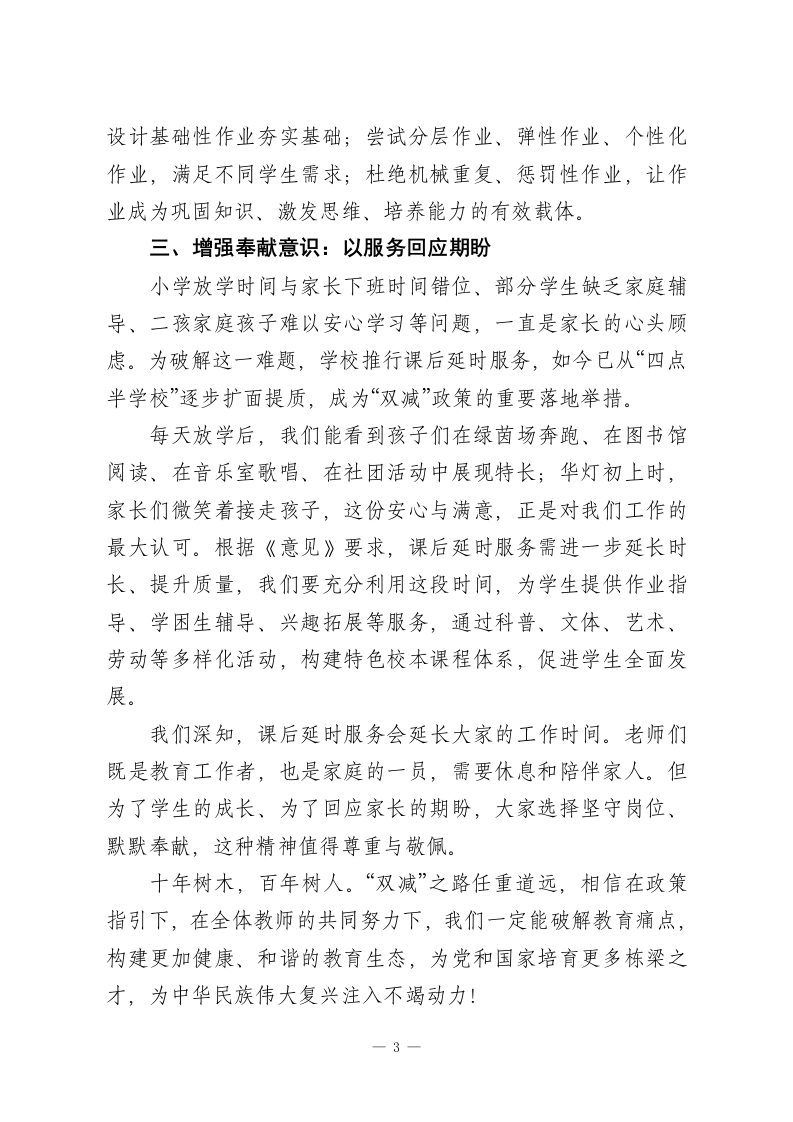 校长讲话:深化“双减”落实,筑牢育人根基各位老师:大家好!2021年7月24日,中共中央办公厅、国务院办公厅印发《关于进一步减轻义务教育阶段学生作业负担和校外培训负担的意见》(以下简称《意见》),明确要求全面贯彻党的教育方针,落实立德树人根本任务,构建良好教育生态,促进学生全面健康成长。如今,“双减”政策已进入深化落实的关键阶段,作为立德树人的中坚力量,我们更需进一步增强责任意识、课程意识、奉献意识,推动“双减”工作走深走实。一、增强责任意识:以初心护航成长“减负”并非新鲜话题,从1955年教育部首次印发减负指示至今,国家多次强调要减轻中小学生过重课业负担。但受社会竞争加剧、家长教育焦虑等因素影响,教育“内卷“鸡娃”现象曾愈演愈烈,出现“校内减负、校外增负”的恶性循环。想必大家都见过这样的场景:深夜里,孩子打着哈欠仍在堆积如山的作业本前奋笔疾书。节假日期间,孩子们的时间被各类培训班、兴趣班挤占,疲于应付多重作业,作业质量自然大打折扣。中小学生正处于生长发育关键期,过度的课业负担不仅会影响视力和身体健康,还可能导致心理脆弱,难以担当未来建设者和接班人的重任。此次“双减”政策的核心,是通过建设高质量教育体系,将-1