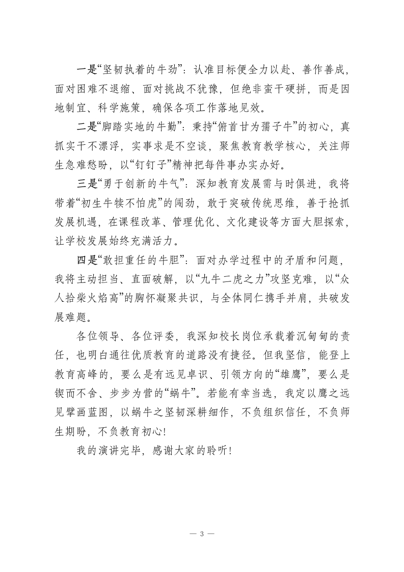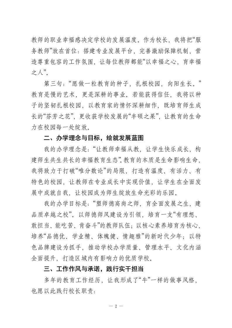 校长竞聘演讲:守好师生“三抹笑”,耕好教育“责任田”尊敬的各位领导、各位评委、各位教育同仁:大家好!首先,我谨向长期以来关心支持教育事业发展的各位领导、各位评委,致以最诚挚的问候!向为本次公开竞聘搭建公平平台的上级部门,表达最衷心的感谢!今天,我怀着对教育事业的无限赤诚,带着对办学治校的深入思考,站在这里竞聘校长岗位,愿以初心赴使命,以实干践承诺。我的演讲将围绕“办学信念、办学理念与目标、工作作风”三个维度展开,与各位同仁共勉:一、三句初心誓言,锚定办学方向作为教育人,我始终坚守三句信念,也愿以此作为校长履职的根本遵循:第一句:“捧着一颗热心来,不带半根杂草去。”这颗“热心”是对祖国教育事业的绝对忠诚,是对学校发展的全力担当,是对教职工的真心关爱,是对学生成长的全程守护。若能履职,我不求功名利禄,唯愿离任之时,能带走三份珍贵的“礼物”一一领导与家长的放心之笑、教职工的幸福之笑、学生们的纯真之笑。第二句:“一切为了学校,一切为了教师,一切为了学生。”这“三个一切”中,我始终坚信“教师是学校发展的核心动力”。古人云“教之兴,在于师”,教师的专业成长决定学生的未来高度,一1