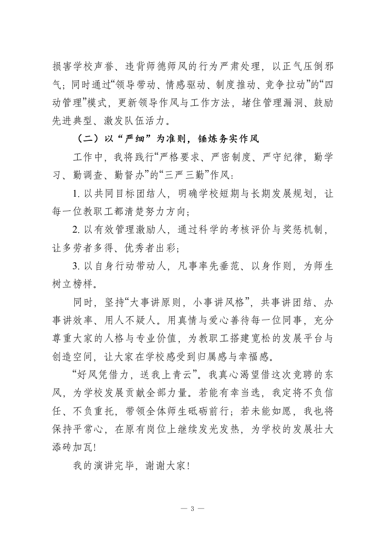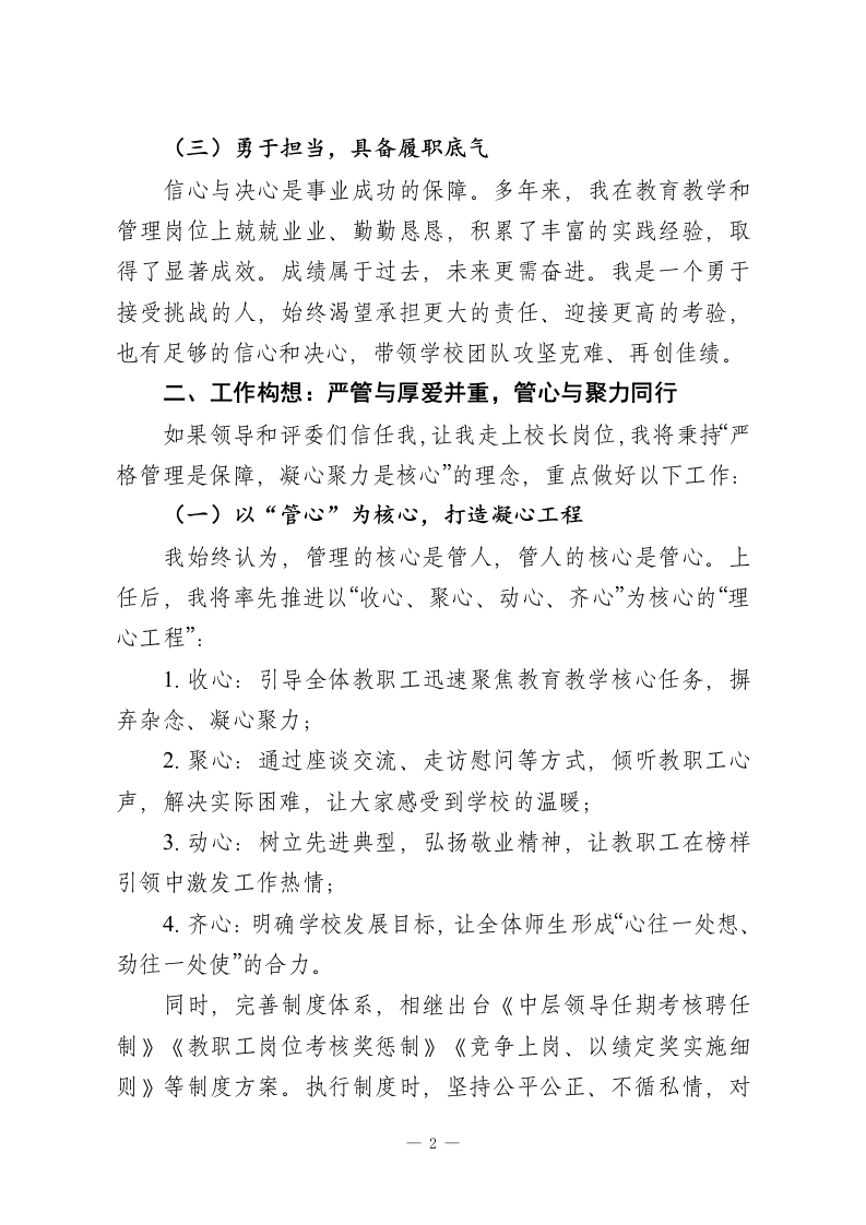 校长竞聘演讲稿:严管筑基,管心聚力各位领导、各位评委:大家好!今天,能够站在这个庄严的讲台上,参与校长岗位竞聘,既是组织给予我的考验,更是宝贵的成长机会。我深知校长岗位肩负着引领学校发展、培育时代新人的重任,也坚信凭借自身积累的素养与能力,能够胜任这一职责。现将我的竞聘优势与工作构想汇报如下:一、竞聘优势:以素养立身,以初心践行(一)坚守初心,筑牢思想根基从事教育工作十几年,我始终注重加强政治修养,坚定拥护党的教育方针、路线和政策,在思想上、行动上与党中央保持高度一致。秉持爱岗敬业、廉洁奉公、吃苦耐劳的精神,做事坚持原则、生活作风正派,严守教育行业廉洁自律准则,深受师生信任与爱戴,始终以“为人师表,教书育人”为根本遵循。(二)团结协作,凝聚发展合力我始终坚信,团队的力量远胜于个人。从小接受的传统教育,让我养成了光明磊落、正直友善、乐于助人的品格。工作中,我胸怀坦荡,有意见当面沟通,不搞小动作、不结小团伙,既能团结志同道合的同事,也能包容不同意见的伙伴。既讲大局、守原则,说话办事不看风向、不看来头,敢于表达真实想法;又能服从上级决策、顾全学校整体利益,无论在哪个岗位,都能与领导、同事友好相处、协同共进。1
