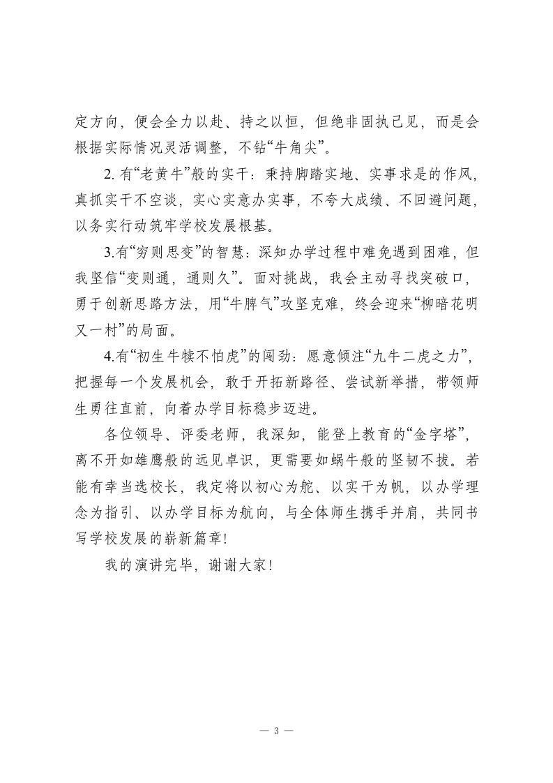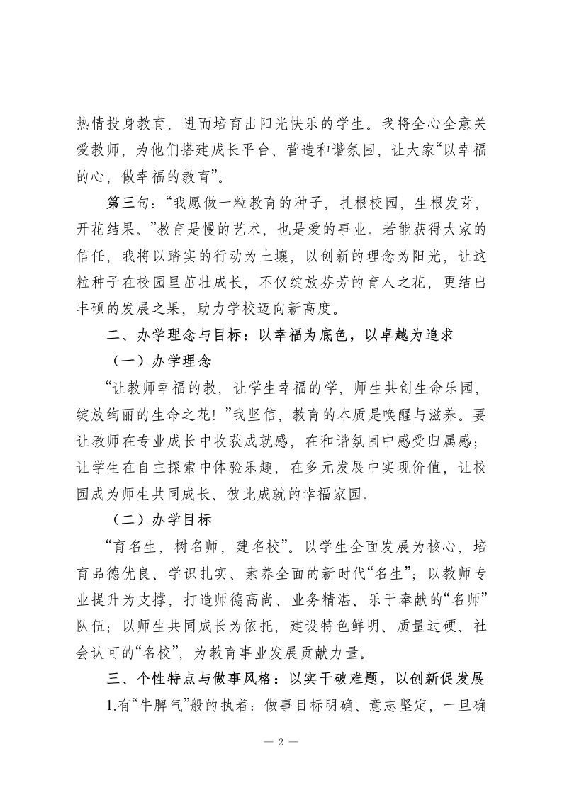 校长竞聘演讲稿:以初心育桃李,以实干建名校尊敬的各位领导、各位评委老师:大家好!首先,向各位领导、评委老师致以最诚挚的问候,你们辛苦了!也衷心感谢学校提供这样公开、公平、公正的竞职机会,让我能够站在这里,倾诉对教育事业的热忱与对学校发展的构想。我今天的演讲分为三个部分,与大家分享我的办学信念、理念目标和做事风格:一、办学信念:以初心践使命,以热爱赴征程我想用三句话,表达对办学的坚定信念与决心:第一句:“捧着一颗热心来,不带半根杂草去。”这颗热心,是对祖国教育事业的无限忠诚,是对学校发展的炽热期盼,是对教师群体的春天般关爱,是对学生成长的慈母般呵护。若能有幸履职,我期盼离任之时,能带走三样最珍贵的“礼物”一领导与家长满意的笑容、教师幸福的笑容、学生开心的笑容。第二句:“一切为了学校,一切为了教师,一切为了学生。”这“三个一切”是我办学的核心准则,而我将率先践行“一切为了教师”。古人云“教之兴,在于教师”,教师是学校发展的主力军,教师的素养决定学生的素质,教师的幸福感影响教育的温度。唯有让老师们感受到职业的价值与幸福,才能让他们以饱满的1
