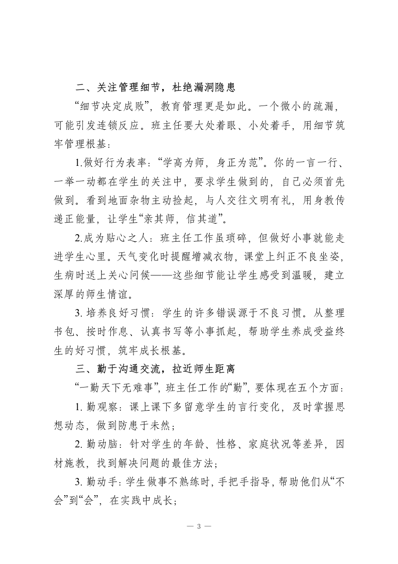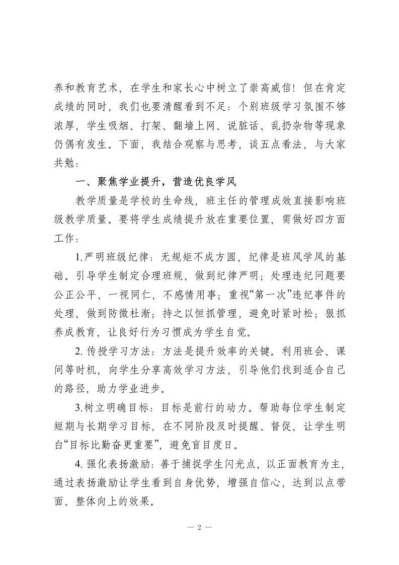 校长在班主任工作会议上的讲话:深耕细作育桃李,凝心聚力筑班风各位班主任:大家好!时光飞逝,这学期已然过半。在过去两个半月里,全体班主任任劳任怨、精诚合作,深入推进养成教育、文明礼仪教育与安全教育,学校育人成效显著:学生着装规范整齐,公开使用手机现象基本杜绝,教室窗明几净,课堂与两操秩序井然,学生自律意识和集体观念持续增强。这些成绩的取得,离不开各位的辛勤付出一一是你们身体力行的关爱引导、事无巨细的教育管理,换来了校园的向好变化。在此,我想对所有班主任说一声:大家辛苦了!这段时间,班主任队伍中涌现出许多爱岗敬业的先进典型。九年级五位班主任天天早出晚归,贴班紧、管理严,尤其是XX老师和XX老师,将办公桌搬到教室前走廊,随时随地为学生答疑解惑、疏导思想,综合楼五楼南北两头深夜亮着的灯光,已成为校园里最动人的风景;七八年级的XX、XX、XX等老师,每天总能在学生到班前就守候在教室,用陪伴筑牢班级根基;还有XX、XX等老师,即便身患疾病,也坚守岗位不请假,用实际行动诠释了教育的责任与担当。前几日,学校组织学生代表问卷调查,不少班主任的好评率达到100%。这充分说明,你们已用自身的人格魅力、学识修1