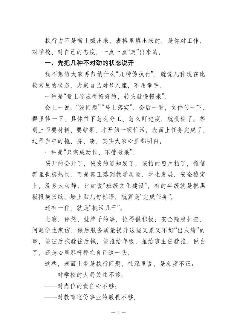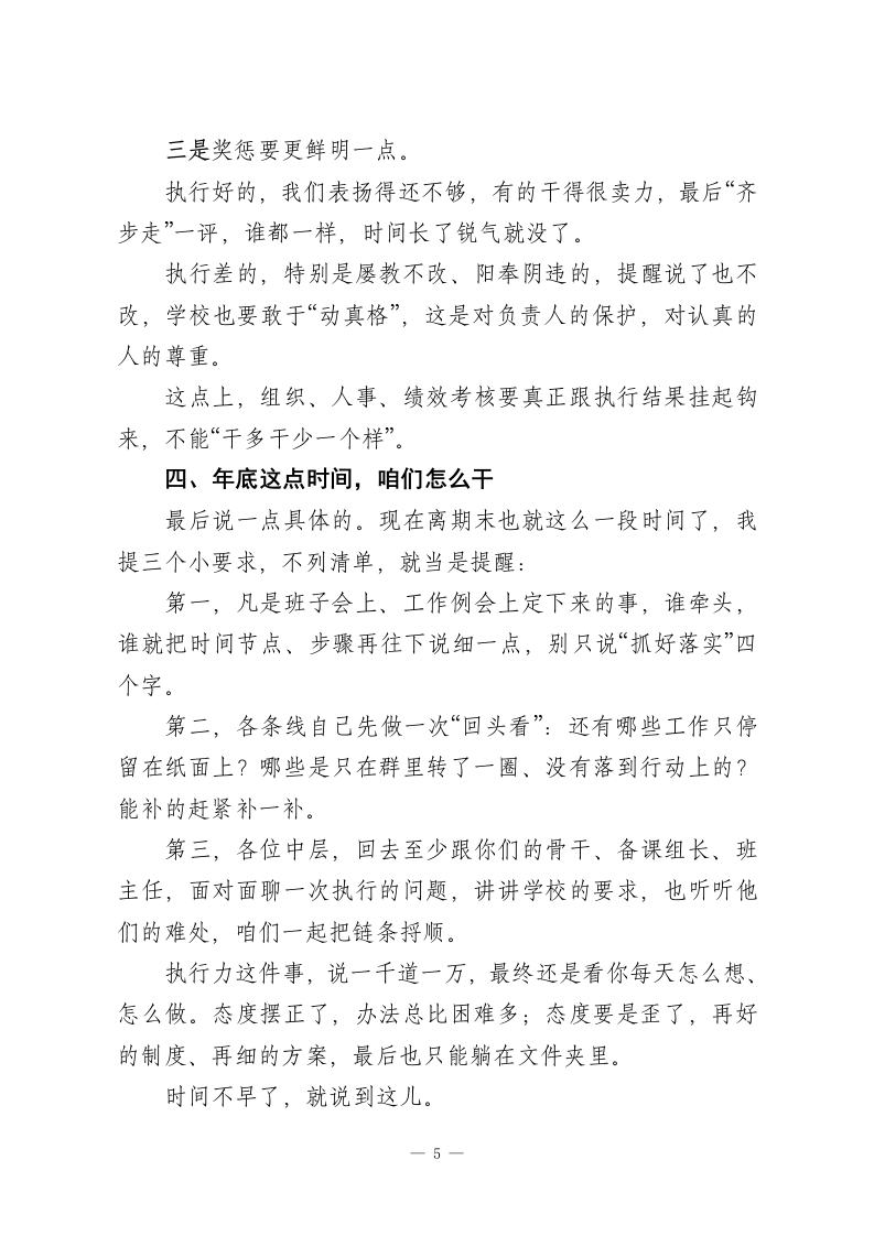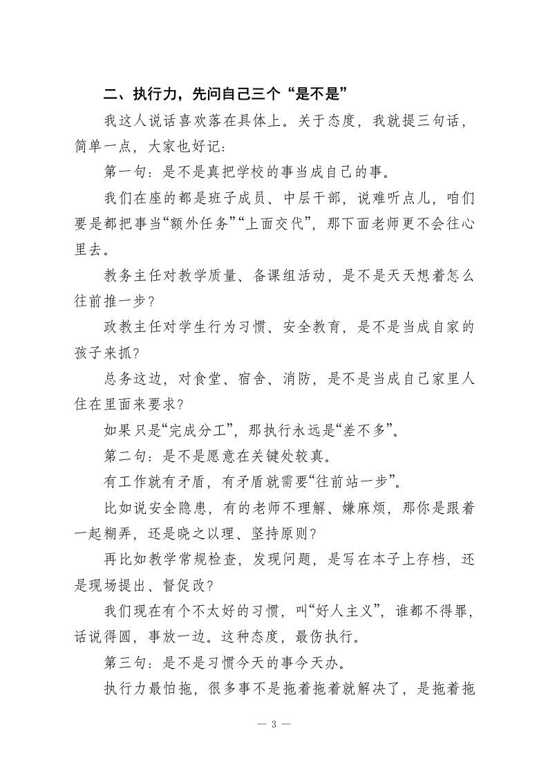校长在班子会上关于执行力的讲话:先把态度摆正,再谈工作落实!各位班子成员、各位中层:下午好!今天不谈大的规划,就聊一件事:执行。最近这一个多月,有三件小事,一直在我脑子里打转:第一,上次班子会上定了的“课堂教学月”方案,我们说好三天内各处室细化措施。结果,教务处当天就把安排发上来了,政教处拖了快一周,总务这边是我在走廊上又提醒了一句,第二天才交。事都在做,但是这个劲儿,一看就是不一样的。第二,前段时间县里安全大检查,点出了我们实验楼消防通道堆放杂物的问题。总务、政教、年级组都在整改名单上。整改通知下去第三天,七年级那一层清得干干净净,九年级那一层还有两堆桌椅靠在门边,我上去一看,年级主任说“正准备处理呢”。这四个字我听得太多了。第三,教导处印发的《本学期教学质量提升行动方案》,我在会上逐条讲过。有的年级根据方案调整了听评课、备课组活动,动作比较快;有的组,直到上周我去听课,老师还问我“那个方案主要是讲啥来着?”文件是签收了,态度是“放一边”。这三件事,能力问题不大,都是态度问题。说难听一点儿,就是把学校的事,当成了“领导的事”“文件的事”,而不是当成自己的事。所以,今天我想换个说法:1