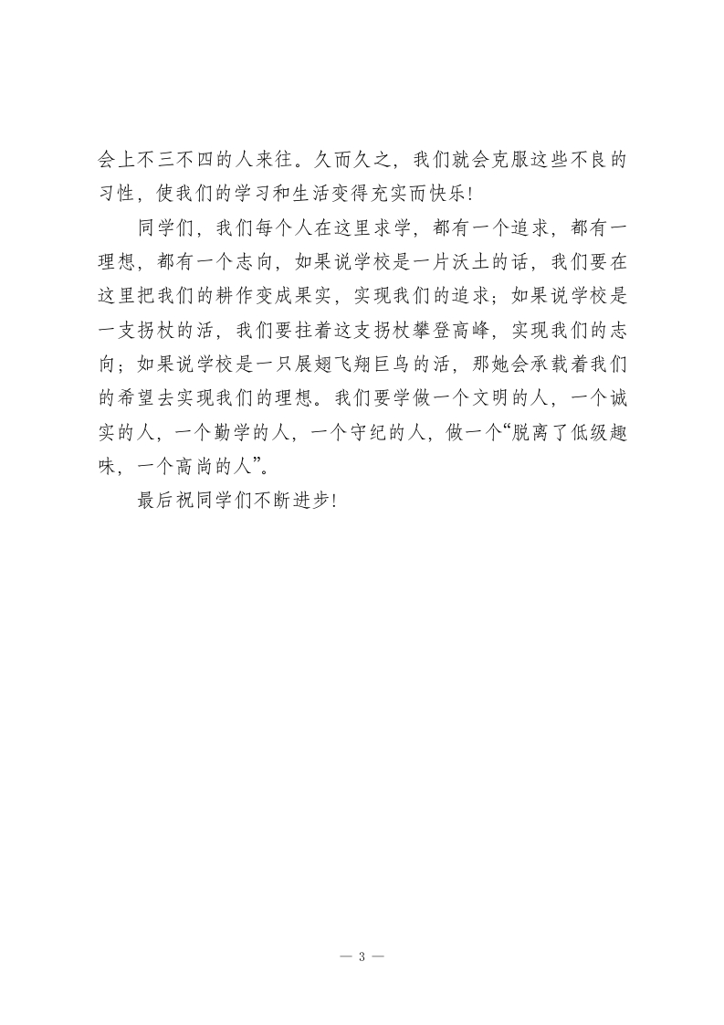 校长在国旗下讲话讲纪律:学校是一个和谐统一的集体,自然更需要铁的纪律!同学们,虽然,我们有着不同的生活习惯,但遵守纪律却是我们每一个人应该重视而牢记的。学校作为我们接受知识的平台,传授知识的神圣殿堂,应该是一个和谐统一的集体,自然更需要铁的纪律。那什么是纪律呢?从学校角度来讲,纪律是为了维护学校利益并保证学校教育教学工作正常进行而制定的要求,每个学生应当遵守的规章、条文。俗话说:“没有规矩,不成方圆。”国有国法、家有家规、校有校纪,一切活动和生活都必须有“规矩”,这个“规矩”就是纪律。一个纪律涣散的集体,不可能有好的学风,学习也就得不到保证。而好的环境,好的秩序,是靠健全的严明的规章制度和纪律来维持的,校规校纪是保证正常教学秩序的必要手段,前苏联教育家马卡连柯认为:“纪律能够创造集体的美。”纪律把分散的个人凝聚成为一个坚强有力、团结和谐的统一体,从而创造了集体的美、生活的美、人际关系的美。良好的纪律会使校园美丽如画,教室里窗明几净,书声朗朗,操场上龙腾虎跃,各项活动井然有序。在学校里,绝大部分同学遵规守纪,刻苦学习。但我们有一部分同学养成了一些不良的习惯,比如说有的同学经常迟到、无故旷课;有的个别同学曾带起了耳环染起了发;有两位同学在假山后吞云吐雾,有个别男女同学在综合楼有亲密行为;上1