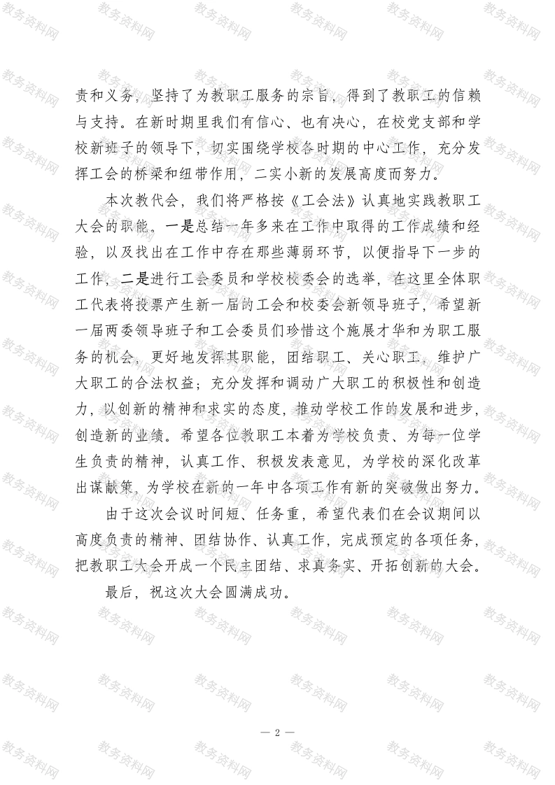 校长在教代会上讲话希望代表们在会议期间以高度负责的精神、团结协作、把教职工大会开成一个民主团结、求真务实、开拓创新的大会此内容为付费资源,请付费后查看