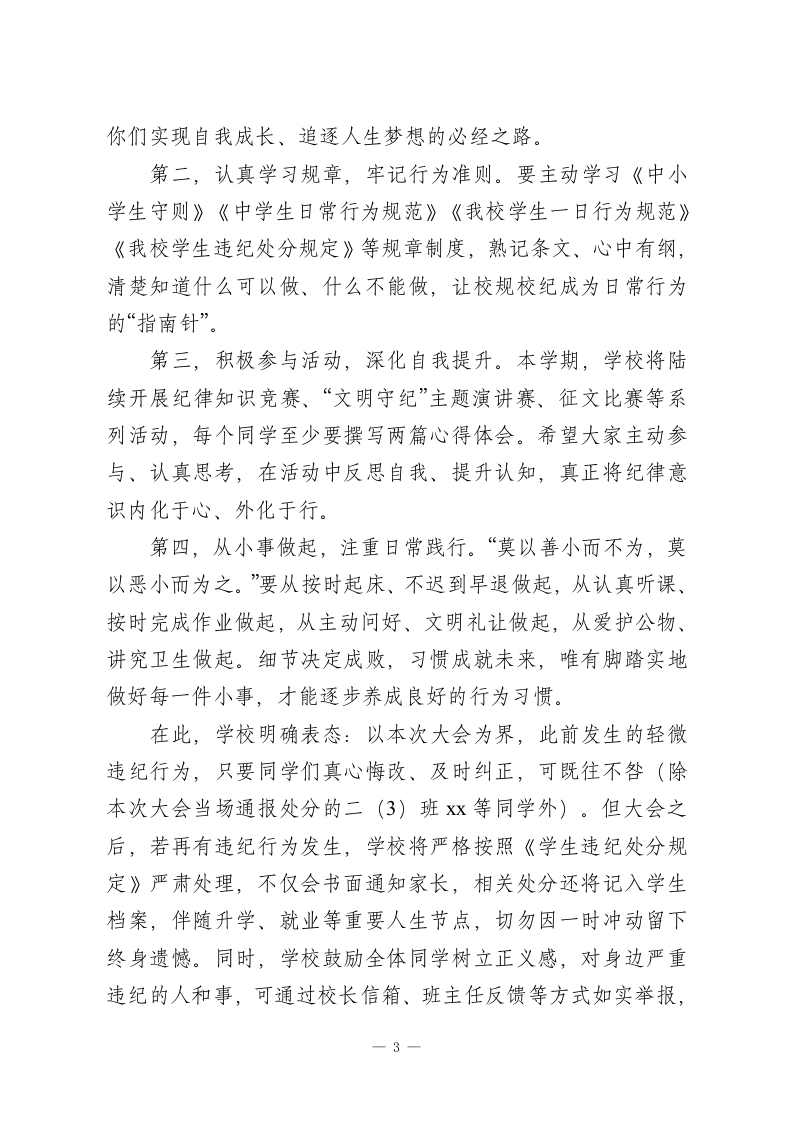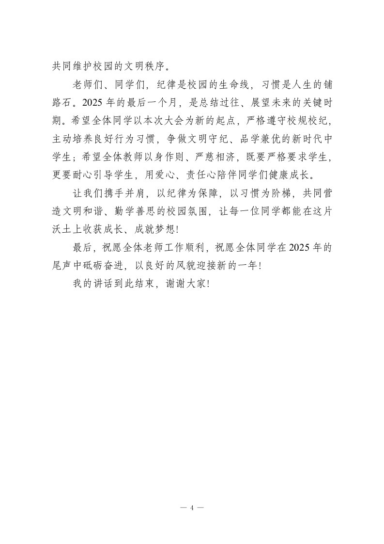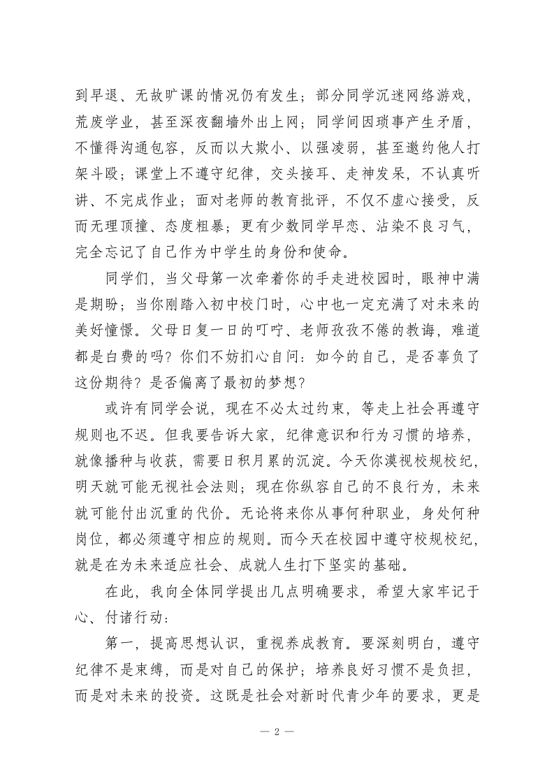 校长在秋季学期校规纪律教育大会讲话老师们、同学们:下午好!今天,我们齐聚一堂,召开校规纪律教育大会,这也正式拉开了我校本学期养成教育系列活动的序幕。纪律教育没有终点,行为养成贵在坚持,它将贯穿同学们在校学习生活的全过程,伴随大家成长的每一步。今天,我想和大家分享的主题是《培养良好行为习惯,争做文明守纪学子》。同学们都听过这样一句话:“无规矩不成方圆。”家庭有家风家训,国家有法律法规,社会各行业有职业准则,学校作为培育人才的主阵地,更离不开严明的校规校纪。洪水没有堤坝的约束,终将冲毁家园;车辆没有交通规则的指引,难免酿成惨剧;而学生若脱离纪律的规范,不仅会影响自身成长,更可能成为社会的隐患。就像高速行驶的汽车不能缺少方向盘,我们的思想和行为若不加约束,也必将偏离人生的正轨。校规校纪是保障同学们顺利完成学业、健康快乐成长的基石,是构建文明和谐校园的前提。试想,若课堂上随意喧哗、课后肆意打闹,考试中投机取巧、同学间恶语相向,这样的校园怎能让大家安心学习?这样的环境怎能培育出优秀的人才?初中阶段是人生价值观、行为习惯形成的关键时期,此时养成的纪律观念和良好习惯,将如同灯塔,指引我们未来的人生方向,成为终身受益的宝贵财富。然而,反观当前校园中的一些现象,却让我深感痛心。迟1