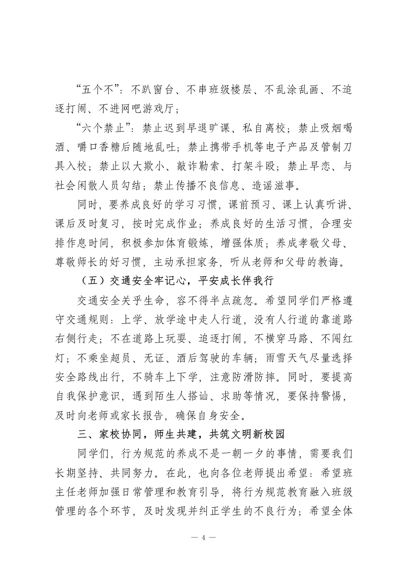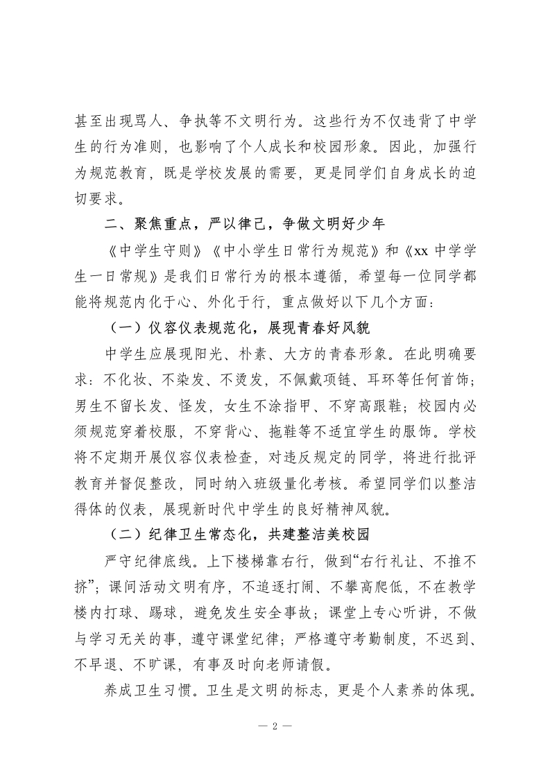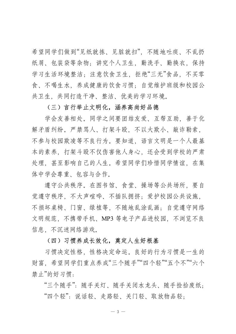 校长在秋季学期学生行为规范教育大会讲话各位老师、同学们:大家下午好!寒冬时节,暖意相聚。今天我们召开行为规范教育大会,既是对过往校园文明建设成果的总结,更是为了进一步明确行为准则、涵养优良校风,让每一位同学在规范中成长,在文明中进步。中学时代是人格塑造、习惯养成的关键时期,良好的行为规范不仅是校园有序运行的保障,更是同学们未来人生道路上最宝贵的财富。希望今天的讲话,能成为大家成长路上的一盏明灯,指引我们共同营造更加和谐、文明、向上的校园环境。一、肯定成效,正视不足,明确规范新起点本学期以来,在全体师生的共同努力下,我们持续加强校园行为规范管理,校园风气呈现出喜人的变化:多数同学能自觉遵守校规校纪,课堂纪律明显改善,校园卫生状况持续优化,文明礼让的场景随处可见,一批优秀班级和文明学生脱颖而出。这背后,离不开班主任老师的悉心教导,更离不开同学们的自觉践行。但我们也要清醒地看到,校园中仍存在一些不和谐的现象:少数同学仪容仪表不符合学生身份,染发、佩戴首饰、穿奇装异服的情况偶有发生;部分同学课间追逐打闹、喧哗吵闹,影响他人学习休息;还有些同学随手乱扔垃圾、破坏校园环境,1