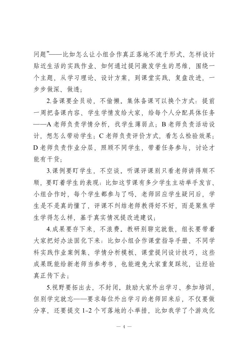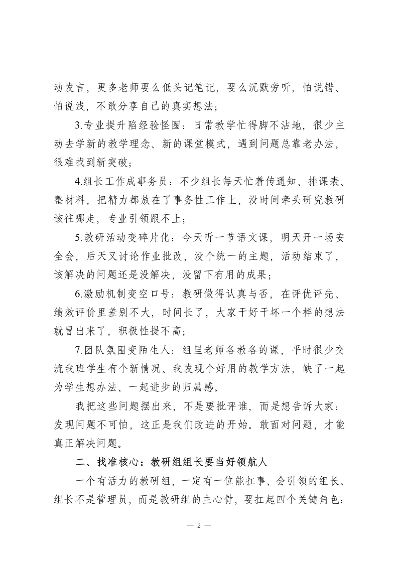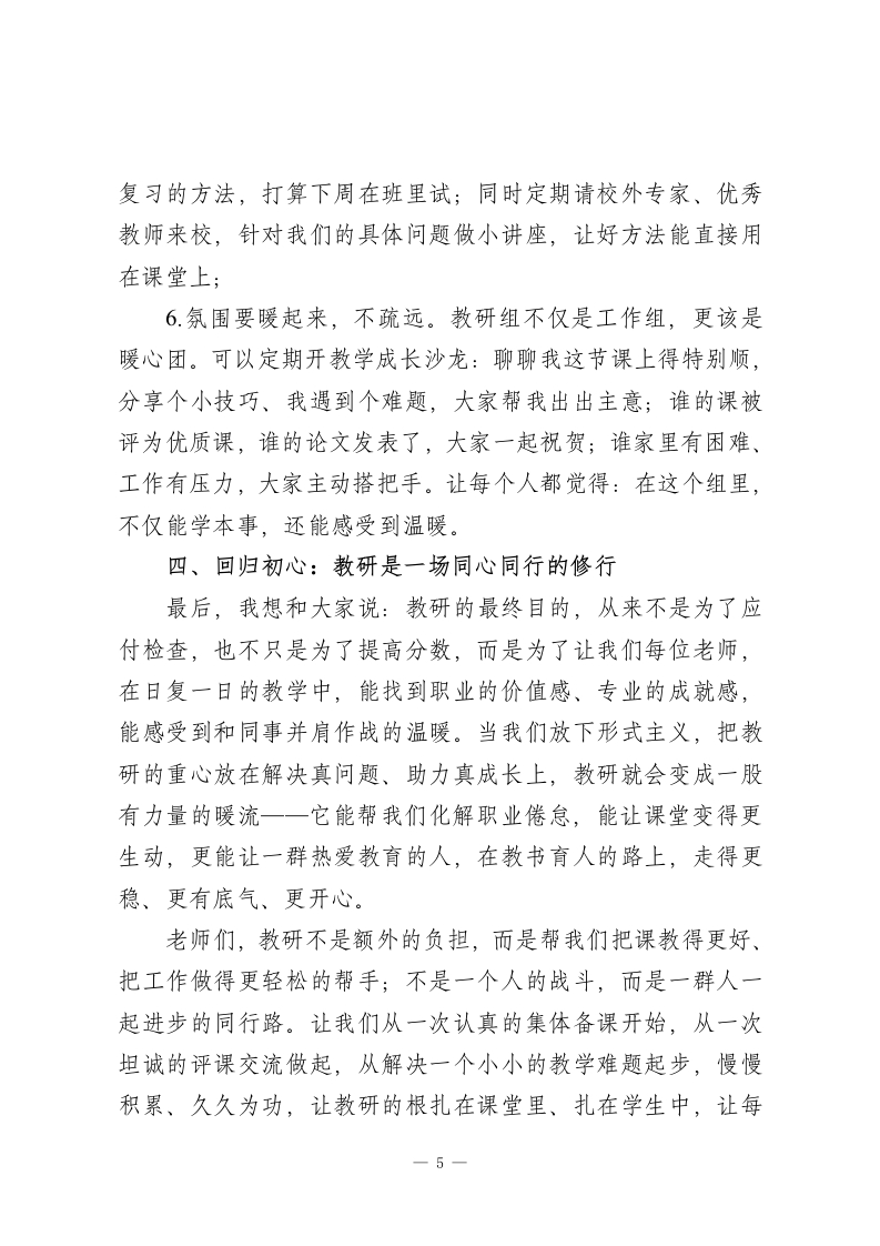校长在全校教研工作会议上的讲话:让教研真正成为教学的助推器各位老师:大家下午好!今天我们把时间留给教研,是想和大家聊一个既关乎学校教学质量,更关乎每位老师职业幸福感的核心话题一一如何让教研真正走出形式、落到实处,成为我们日常教学的得力帮手。作为校长,我一直有个感受:教研组是学校教学质量的压舱石,是我们老师突破职业瓶颈、实现专业成长的加油站。教研抓得实,课堂就有彩;团队拧得紧,教学就有劲儿。但我们也得承认,现在部分教研活动还存在走流程、缺实效的问题,今天不聊空话,就和大家推心置腹,说说怎么把教研做真、做细、做好。下面,我从四个方面和大家交流:一、直面问题:我们的教研还存在哪些堵点?要把教研做好,先得把问题找准。说实话,当前有些教研组的活动,还停留在看起来有动作,用起来没效果的层面,主要有这几类情况:1.集体备课变走过场:主备人提前写好教案,其他人到场随便聊两句,既不琢磨这节课怎么贴合学生学情,也不讨论难点怎么突破,参与度低、思维没碰撞;2.教研发言成独角戏:每次研讨,总有那么两三位老师主1