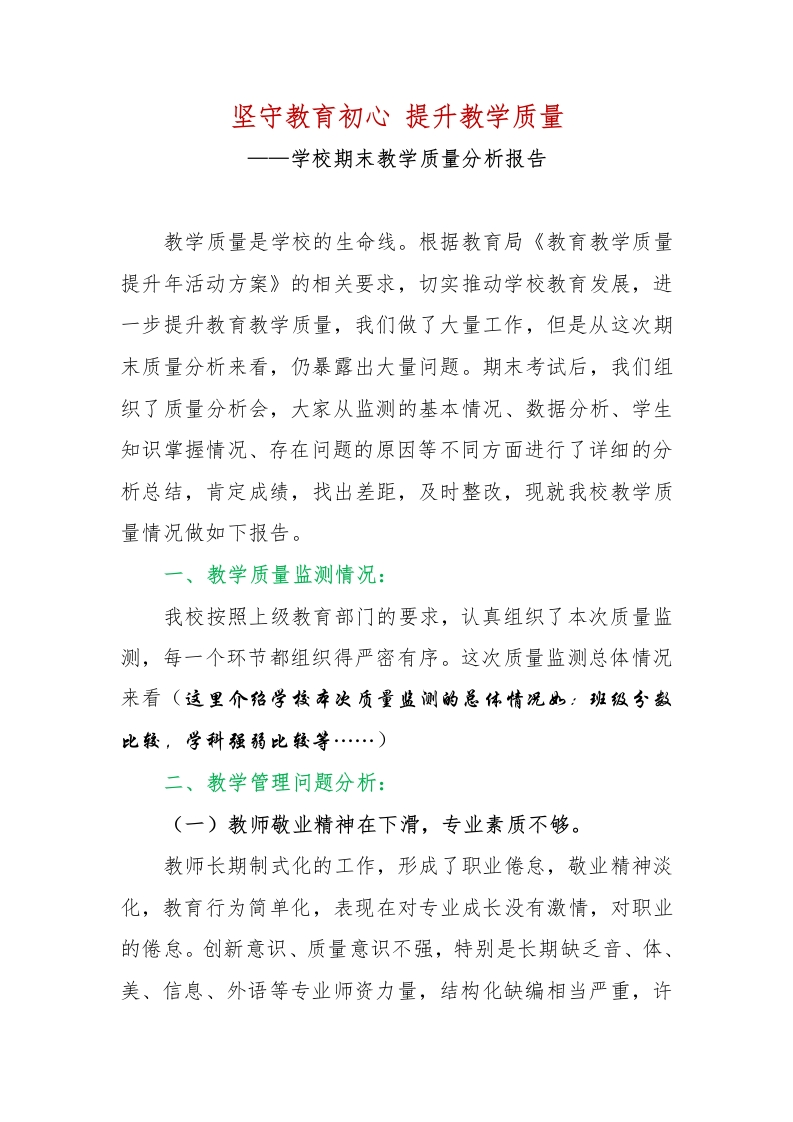 坚守教育初心提升教学质量一学校期末教学质量分析报告教学质量是学校的生命线。根据教育局《教育教学质量提升年活动方案》的相关要求,切实推动学校教育发展,进一步提升教育教学质量,我们做了大量工作,但是从这次期末质量分析来看,仍暴露出大量问题。期末考试后,我们组织了质量分析会,大家从监测的基本情况、数据分析、学生知识掌握情况、存在问题的原因等不同方面进行了详细的分析总结,肯定成绩,找出差距,及时整改,现就我校教学质量情况做如下报告。一、教学质量监测情况:我校按照上级教育部门的要求,认真组织了本次质量监测,每一个环节都组织得严密有序。这次质量监测总体情况来看(这里介貉学校本次质量监测的总体情况如:班级分数比轻,学科强弱比较等…)二、教学管理问题分析:(一)教师敬业精神在下滑,专业素质不够。教师长期制式化的工作,形成了职业倦怠,敬业精神淡化,教育行为简单化,表现在对专业成长没有激情,对职业的倦怠。创新意识、质量意识不强,特别是长期缺乏音、体、美、信息、外语等专业师资力量,结构化缺编相当严重,许