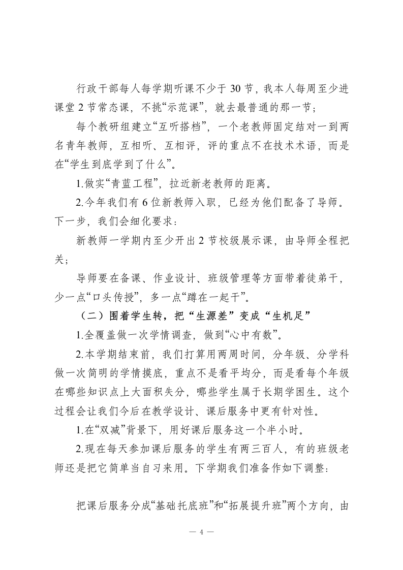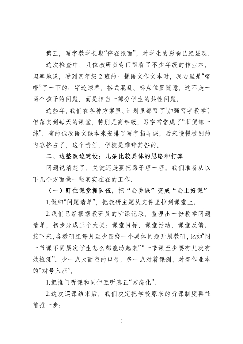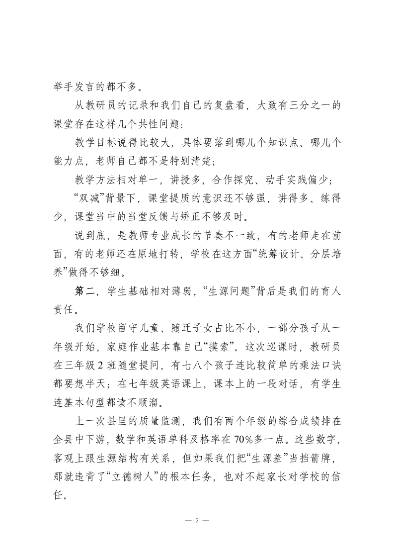 校长在县教研室巡课反馈会上的汇报讲话:把问题摊开,把路子理清!尊敬的县教研室各位领导、各位同仁:大家上午好!先说心里话,这次县教研室到我校做常态课巡查,对我们来说既是机会,也是压力。几位教研员这几天一间教室一间教室地推门听课,给我们做了一次比较全面的“教学体检”。听完刚才的反馈,我的第一反应是:挺准,挺扎心,但也确实说到了点子上。我们学校目前有30个教学班,在校学生1600多人,专任教师大概130人。说不上多么困难的学校,也算不上什么名校,就是一所普通的县域学校。这次巡查,一共听了四十多节常态课,覆盖了一到九年级的大部分学科,可以说把我们日常教学的真实状态原原本本呈现了出来。下面,我就围绕“看到了什么问题、准备怎么改”,谈几点情况,不一定全面,请各位领导批评指正。一、实事求是:三个问题比较突出,不容遮掩第一,教师队伍发展不够均衡,课堂质量忽高忽低。这次巡课,既有让人眼前一亮的课,也有让人坐在后面替老师“捏一把汗”的课。比如六年级语文,有的老师课堂设计很完整,提问有层次,学生参与度高;但也有的课,老师从铃声响起讲到下课,PPT一页接一页,学生几乎没动过笔,连主动1