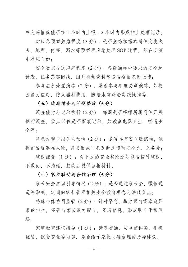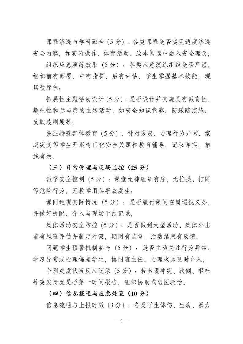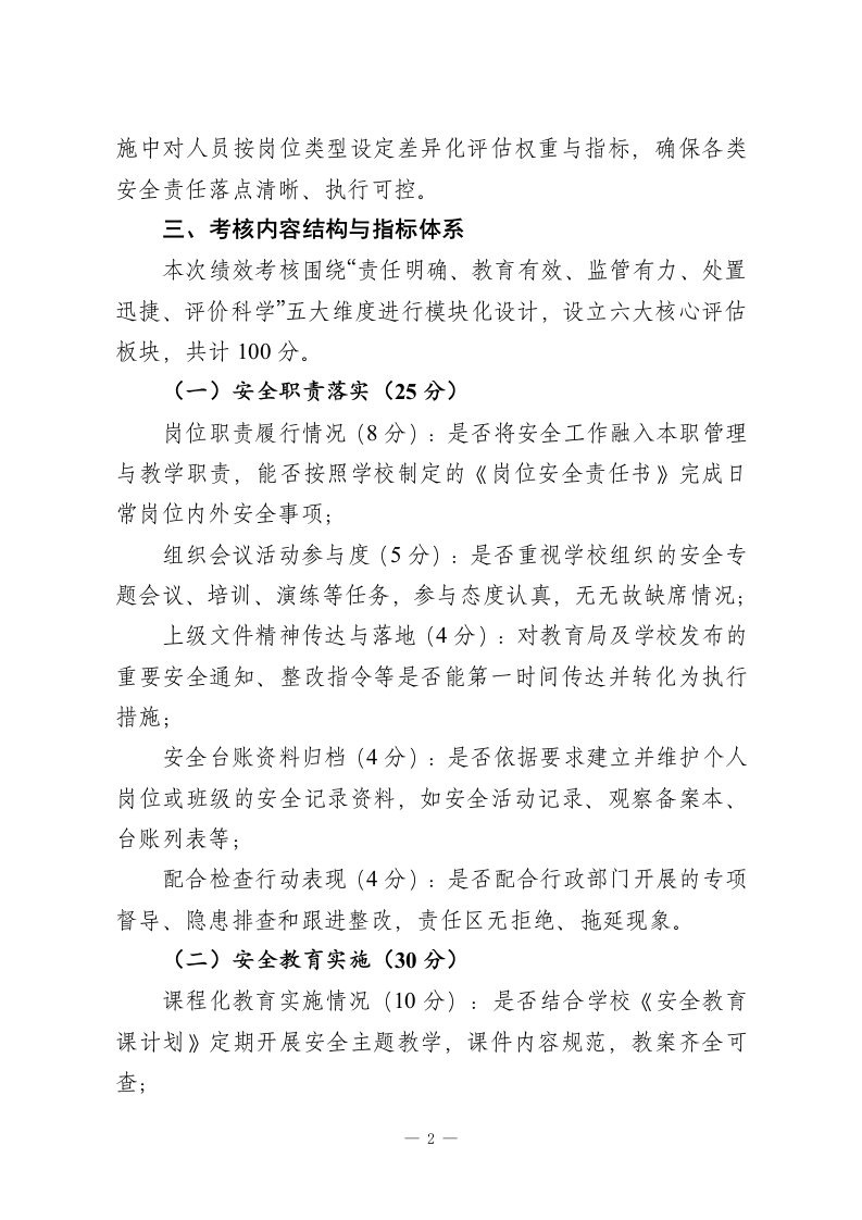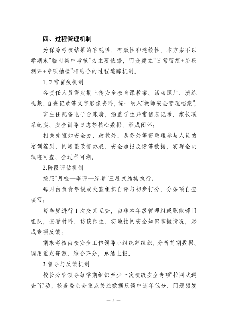 学校安全管理工作考核制度及考核办法(2025年修订)一、基本理念与目标定位为切实落实国家和教育行政部门关于加强中小学校园安全工作的系列部署,建立健全以责任落实为核心、以过程监管为抓手、以结果导向为标尺的教职工安全管理责任制,进一步提升全体教职员工参与校园安全治理的主动性和专业性,形成人人讲安全、师生同保平安的协同育人环境,学校研究制定本管理办法,旨在构建安全教育常态长效管理体系,有效保障校园教育教学秩序稳固开展,维护广大师生人身财产安全,筑牢校园安全工作防护线。本办法突出依法治校意识,强化底线思维,倡导人人尽责、事事规范、各项可查的管理机制,强调安全工作与教育教学同部署、同监督、同评价,进一步推动校园管理科学化、系统化和数据化水平的整体提升。二、适用范围与对象分类本管理办法适用于全体在编、在岗教职工,包括但不限于:各年级、班级的班主任;任教学科的科任教师;各处室、功能组的行政管理人员;食堂、保洁、维修、门卫等后勤服务岗位工作人员;与学校签约、承担协同任务的校外工作人员(受聘辅助岗)。依据岗位职责差异及安全工作参与情况,本办法在考核实1