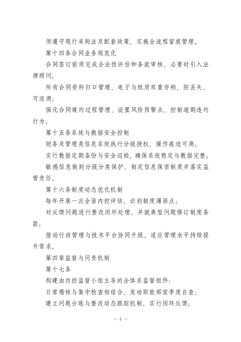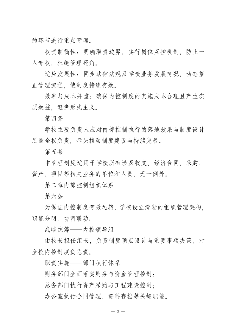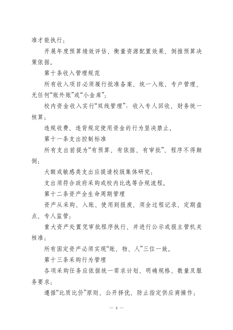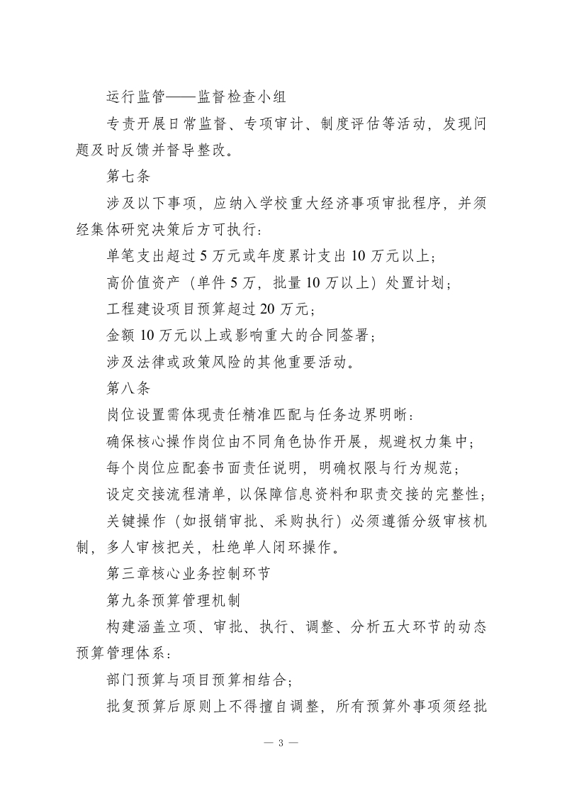 学校财务内部控制管理制度(2025年12月修订)第一章制度设立的背景与内涵第一条为实现学校财务活动的科学化、规范化与透明化,提升资金运作效率、防控经济风险,保障教育资源最大化服务于教学发展,特依照《会计法》《预算法》《中小学财务制度》《行政事业单位内部控制规范(试行)》等相关法规,根据学校工作实际,制定此项管理制度。第二条内部控制,是指学校通过搭建制度体系、执行规范流程、强化监督管理,以应对和调节财务及经济活动中可能出现的风险。其根本目的是:保障各类财务操作合法且合规;确保资产资源得到妥善使用与安全保管:提升信息的准确性和财政管理透明度;预防舞弊、遏制腐败;优化教育资源配置,提升公共服务成效。第三条本校的内部控制体系建设应遵循以下基本原则:系统整合性:控制手段覆盖各项财务行为及其涉及人员,实现决策、执行与监督全流程的贯通。聚焦关键点:资源集中于风险较高、操作频繁和金额重大1