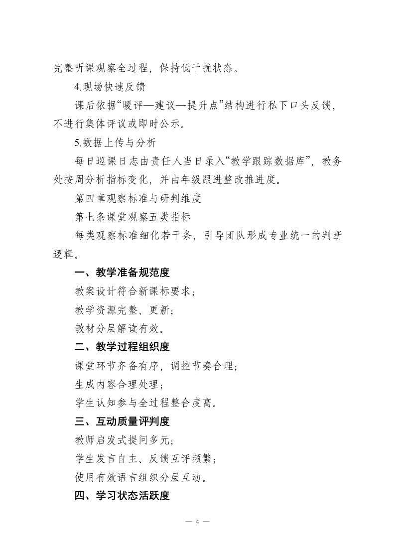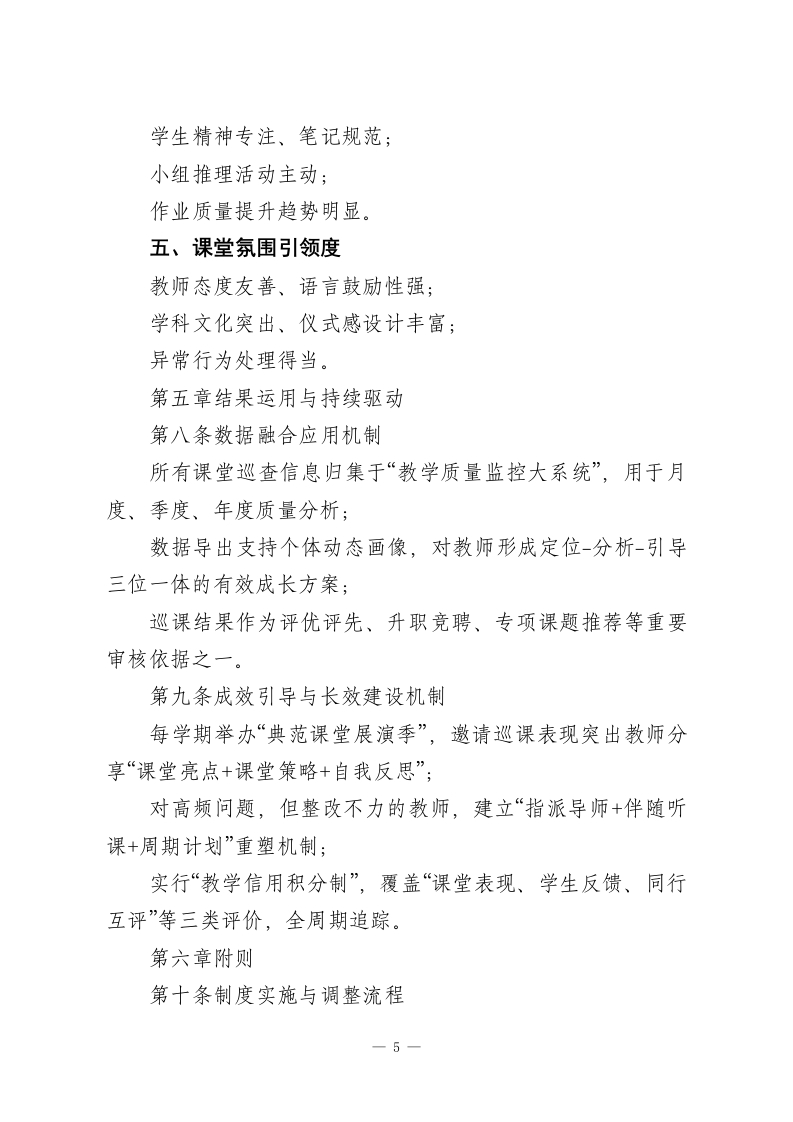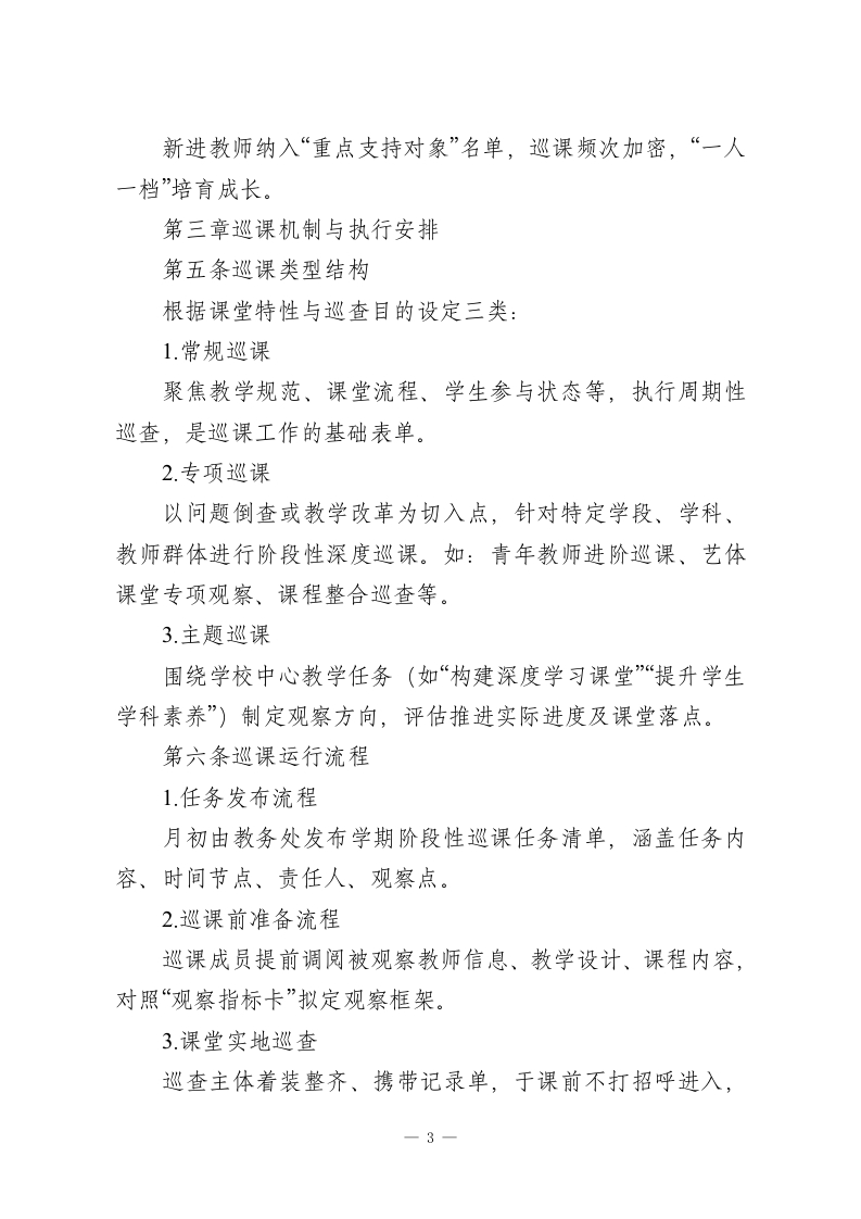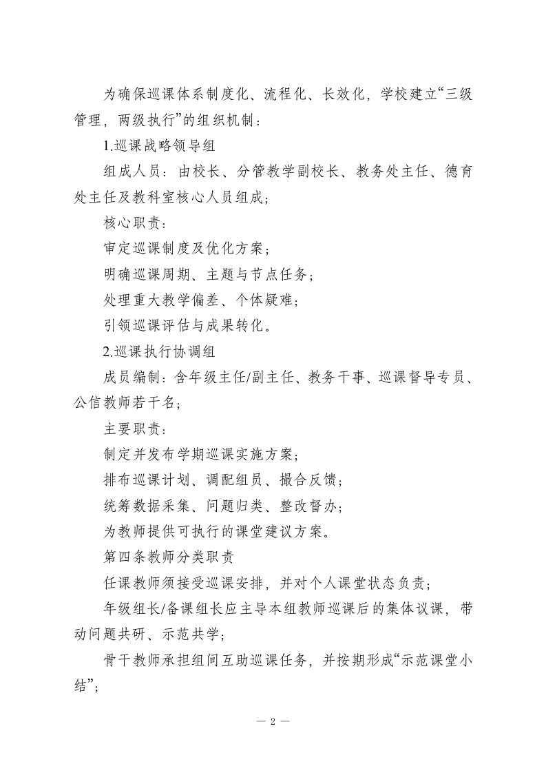 学校常态化巡课制度实施办法第一章宗旨与导向第一条制度出台背景在“双减”政策日益深化、新课程新教材背景下,课堂作为教学主战场,其结构设计、过程控制与反馈机制的效能已直接决定学校教学质量。面对新时代教育内核的转变,学校推广“以生为本、教评一体、系统提升”的教学策略,需要一套行之有效的过程监管与优化制度。因此,制定本巡课制度旨在:将校园教学过程管理由“事后评估”转向“过程跟踪”,由“静态评比”转向“动态改进”,真正实现课堂行为的有序规范、课堂内容的结构优化、课堂反思的常态推进,为教学质量提升提供抓手和路径。第二条制度制定目标优化教学生态:营造责任明确、风气正向、团队协同的教学生态系统;提升课堂品质:规范教学行为,固化优质课堂范式,推动“结构一表现一反馈”统一;引导教师成长:通过全程跟踪与反馈,推进教师教学反思与专业自主更新;保障育人成效:以课堂管理稳定促进学生学风转正和学习主动性的持续增强。第二章工作架构与职责体系第三条组织结构与职责划分一1