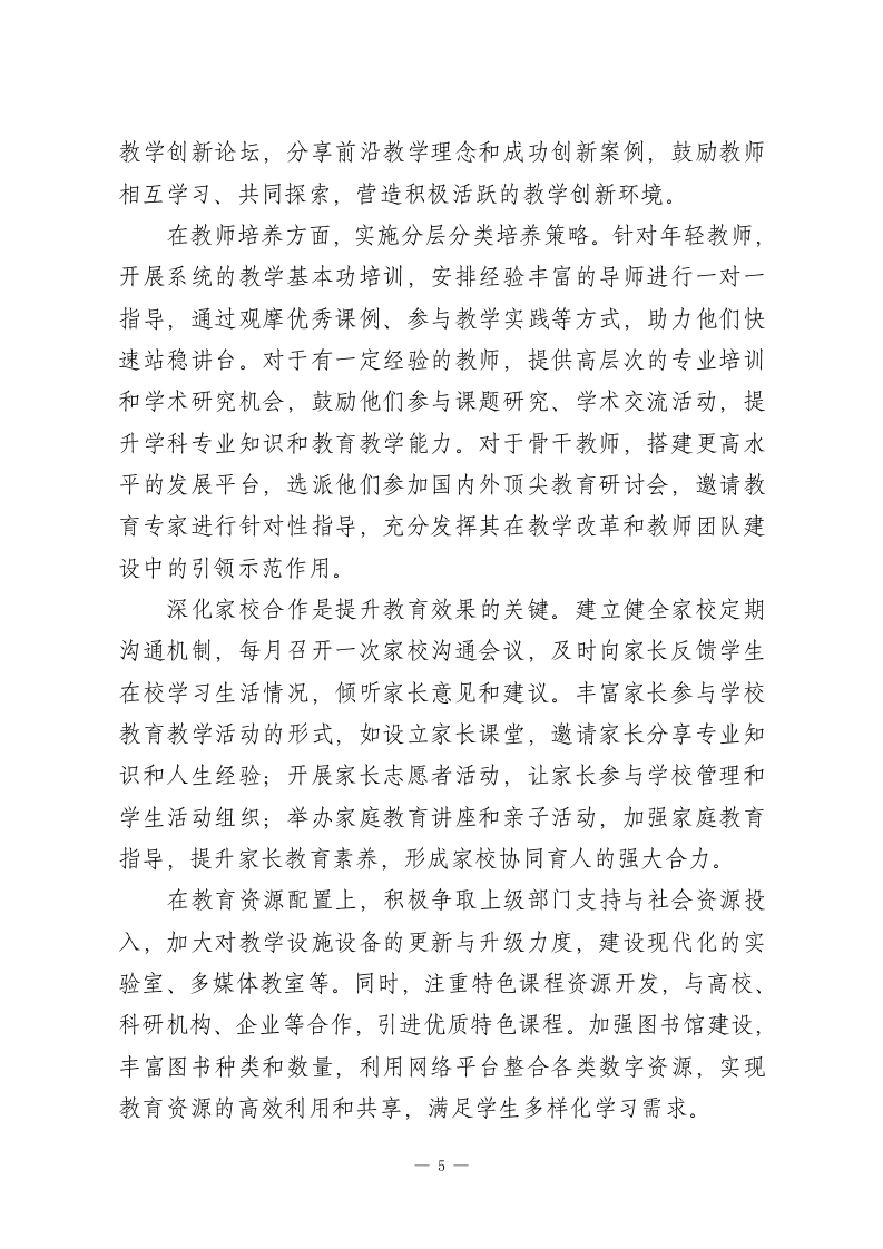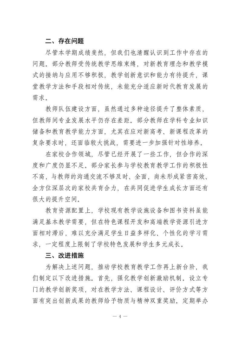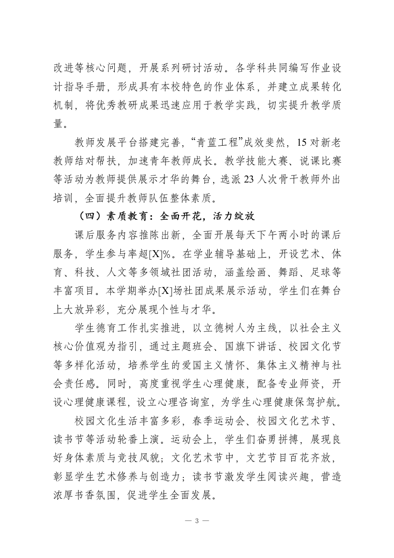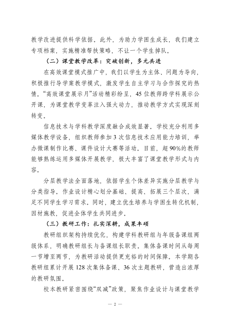 学校教育教学工作总结汇报:实实在在地提高教育质量,不断提升学校的办学水平在过去的这一学期,我校教育教学工作在上级教育主管部门的有力引领以及全体教职工的齐心协力下,圆满达成各项任务,教学质量稳步攀升,学校发展态势蒸蒸日上。在此,对本学期工作进行全面总结与展望。一、工作成效(一)教学常规管理:筑牢根基,规范有序在课程执行上,我校严格依照国家课程方案,构建起丰富多元的课程体系,致力于学生的全方位发展。为确保音体美、信息技术等特色课程顺利开展,我们巧妙整合师资力量,专职与兼职教师相互配合。同时,教务处携手年级组建立课程巡查机制,常态化监督课程执行,杜绝调课、占课现象,保障学生全面接受各类优质教育。教学过程管理方面,我们从备课、上课、作业、辅导、评价五个关键环节出发,精心制定《教学常规管理实施细则》,明确各环节质量标准。通过教案周查、作业月查、听课季度统计等制度,及时发现并整改问题。本学期开展四次教学常规检查,抽检三百二十多份教案,十二次作业批改检查,有力规范了教师教学行为,确保教学过程严谨有序。质量监控体系进一步完善,通过期中、期未两次大规模质量检测,搭建起年级、班级、学科三级质量分析架构。运用横向对比与纵向跟踪相结合的方式,精准把握教学质量动态,为一1