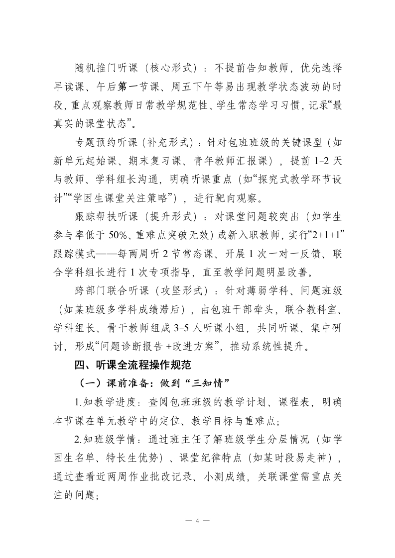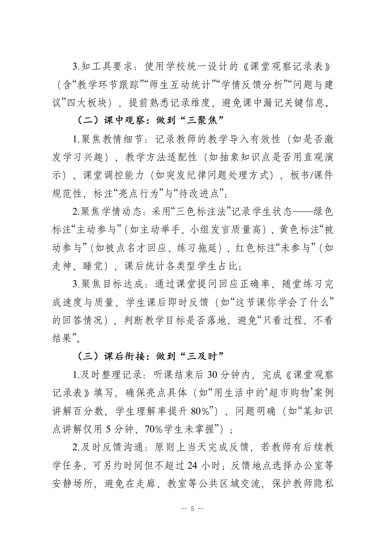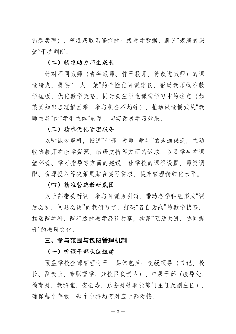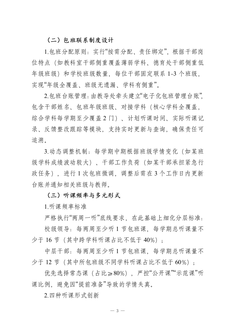 学校领导“两周一听”包班听课工作方案(2025修订版)为深度践行“教学为核、管理赋能”的办学理念,打破“管理与教学脱节”的壁垒,推动干部工作重心向课堂一线全面下沉,精准捕捉教育教学真实动态,高效响应师生成长需求,持续夯实学校教育教学质量根基,特修订完善本领导干部“两周一听”包班听课实施方案。一、指导思想以素质教育核心要求为根本遵循,锚定学校高质量发展目标,将“课堂”作为管理决策的“第一现场”与教研改进的“核心载体”。通过建立干部常态化听课机制,搭建“管理服务教学、教学反哺管理”的双向通道,培育“全员研课、全程重教”的校园教研生态,为教师专业成长提供精准支持,为学生学习体验优化注入动力,为学校科学决策提供实证依据,助力办学水平实现阶梯式提升。二、核心工作目标本方案聚焦“四个精准”,杜绝“检查式”听课,推动听课工作从“形式化走过场”向“实效化促发展”转变:(一)精准掌握教情学情干部深入未提前准备的常态课堂,全面观察教师的教学设计落地、课堂节奏把控、重难点突破、师生互动质量等教学行为,同步记录学生的课堂专注度、参与深度(如小组讨论贡献度、提问回应质量)、知识掌握即时效果(如课堂练习正确率、1