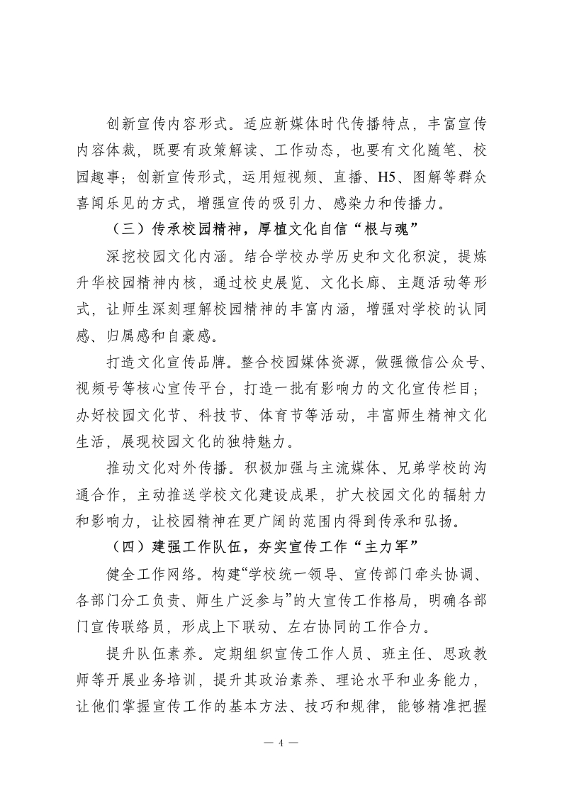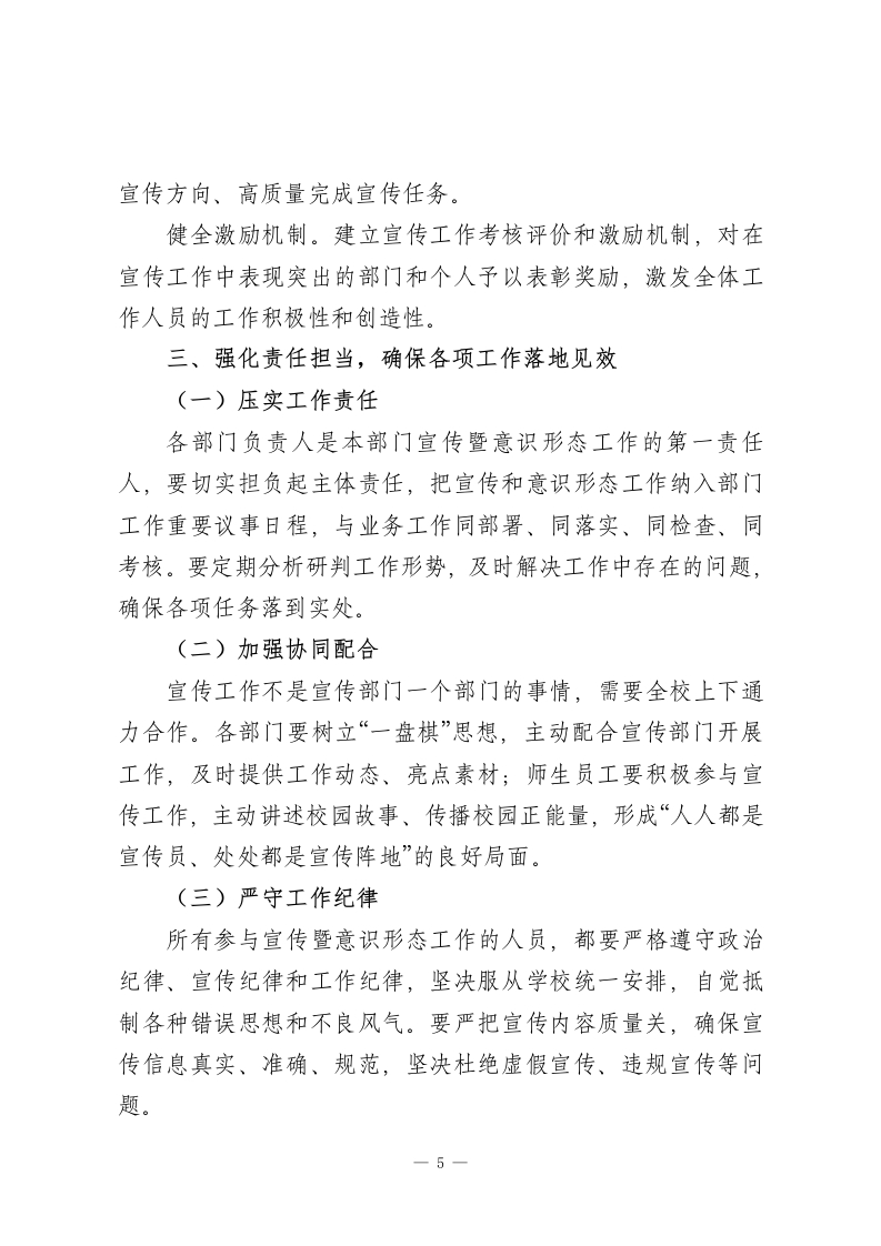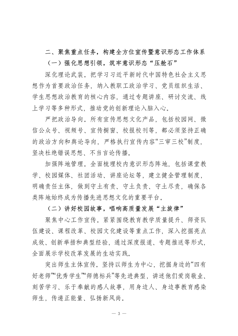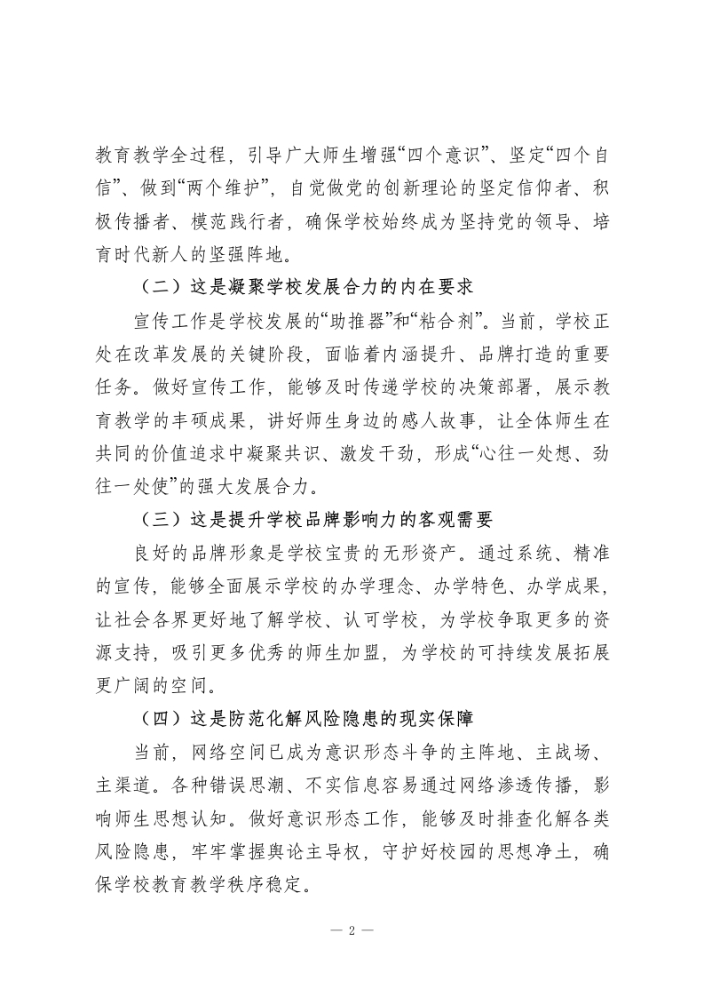 在2025年学校宜传暨意识形态工作推进会上的讲话同志们今天我们召开全校宣传暨意识形态工作推进会,主要任务是深入学习贯彻习近平总书记关于宣传思想工作、意识形态工作的重要论述,全面落实上级教育主管部门相关工作部署,结合学校2025年发展目标,分析当前工作形势,明确重点任务,凝聚工作合力,为学校高质量发展筑牢思想根基、营造良好氛围。意识形态工作是党的一项极端重要的工作,学校作为意识形态工作的前沿阵地,肩负着为党育人、为国育才的神圣使命。当前,新媒体技术快速发展,信息传播格局深刻变革,教育领域的思想交流、文化碰撞更加频繁,给学校宣传和意识形态工作带来了新的机遇,也提出了更高要求。作为致力于打造高品质教育品牌的学校,我们必须高度重视宣传和意识形态工作,把牢政治方向、强化责任担当,以“明者因时而变,知者随事而制”的智慧和担当,推动各项工作再上新台阶。一、提高政治站位,深刻把握宣传暨意识形态工作的核心意义(一)这是践行立德树人根本任务的政治责任学校宣传和意识形态工作的核心是铸魂育人。我们必须通过强有力的宣传引导和思想引领,把社会主义核心价值观融入1