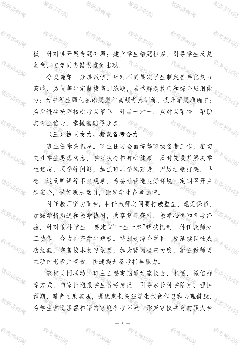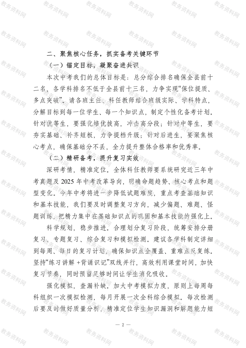 在2026届初中中考备考工作推进会议上校长讲话各位老师:大家下午好!时光飞逝,2026届中考已进入关键备考阶段。今天我们召开备考工作推进会,既是对前期复习情况的复盘总结,也是对后续冲刺工作的再部署、再鼓劲。教学质量是学校的生命线,中考成绩关乎学生未来、家长期盼和学校发展。希望全体九年级教师凝心聚力、精准发力,全力以赴打好这场关键战役。下面,结合近期学情检测和备考实际,我讲几点意见。一、客观分析学情,找准备考发力点本次学情检测严格按照中考标准组织实施,交叉监考、统一阅卷,成绩真实反映了当前教学成效与存在的问题。从整体数据来看,我们取得了一定进步:语文、英语学科平均分较去年中考高出10分左右,数学学科稳步提升,物理、道德与法治等学科与去年持平;总分平均分452分,较去年提高30分,400分以上学生达62人,整体态势向好。但我们也必须清醒看到差距:化学学科平均分与去年相比仍有7分左右的差距,部分班级学科间发展不均衡,班级总评极差达13分;个别学生基础薄弱,偏科现象突出,后进生转化仍需加大力度。这些问题既有学生基础、学情变化等客观因素,也有复习节奏、教学方法等主观原因。希望各位教师对照数据深挖根源,明确后续备考的重点和改进方向。一1