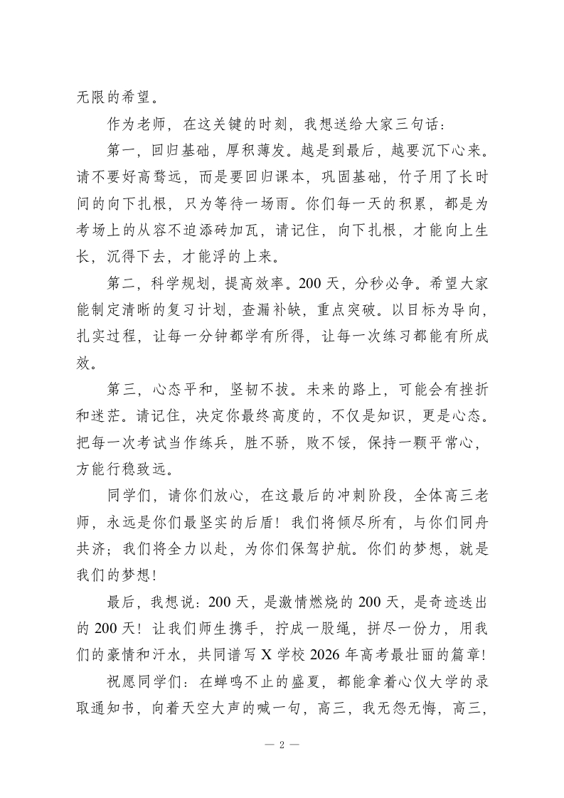 在高三期中表彰暨高考200天倒计时大会上的发言:为梦想冲刺,铸明日辉煌尊敬的各位领导、各位同事,家长们以及亲爱的同学们:大家下午好!很荣幸能作为教师代表站在这里。今天的大会,有着特别的意义。它既是对过往拼搏的喝彩,更是对未来征程的鸣枪!我们在这里,不仅为优秀的你们鼓掌,更要为最后200天的冲刺吹响号角!首先,请允许我代表X学校,向在百忙之中抽出宝贵时间来参加本次表彰大会的家长们表示衷心的欢迎,因为你们的支持,让家校共育之花开遍了X土地,让学生得以稳中有序的前进;其次请允许我代表全体高三教师,向在本次期中考试中取得优异成绩和显著进步的同学,表示最热烈的祝贺!你们的成绩,是汗水与智慧的交响,更是“天道酬勤”最生动的体现。刚才你们在灯光下领奖,我看的很感慨,你们用行动证明了:努力,终将让你发光。同时,我也要对每一位全力以赴、坚持到现在的同学道一声:你们辛苦了!高三的旅程,从来不是一个人的孤军奋战。我们看到的,是你们清晨6点钟诵读,是你们深夜10点多刷题时。这份坚持本身,就是一种了不起的胜利。同学们,200天,是一个数字,更是一个承诺,一次机遇。它意味着梦想触手可及,也意味着挑战近在眼前。这200天,将是你们学生时代最浓墨重彩的一笔。它不会是轻松的,但它注定是充实的,是热血的;它可能伴随着压力,但它更孕育着1