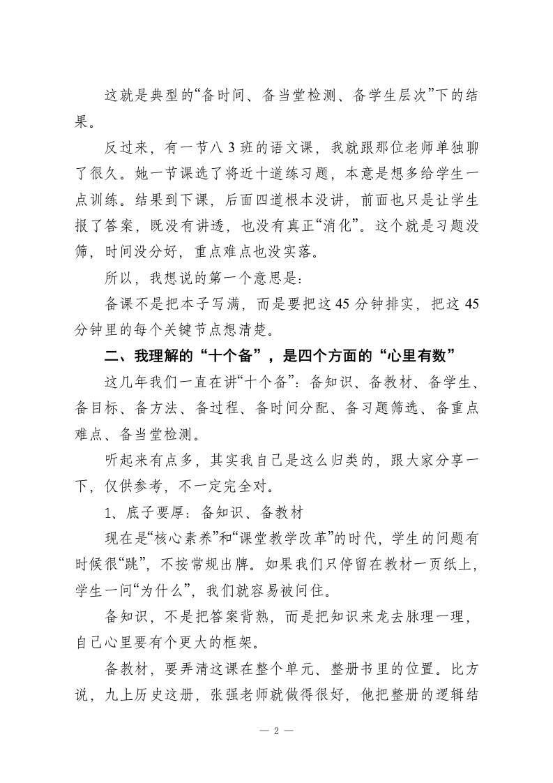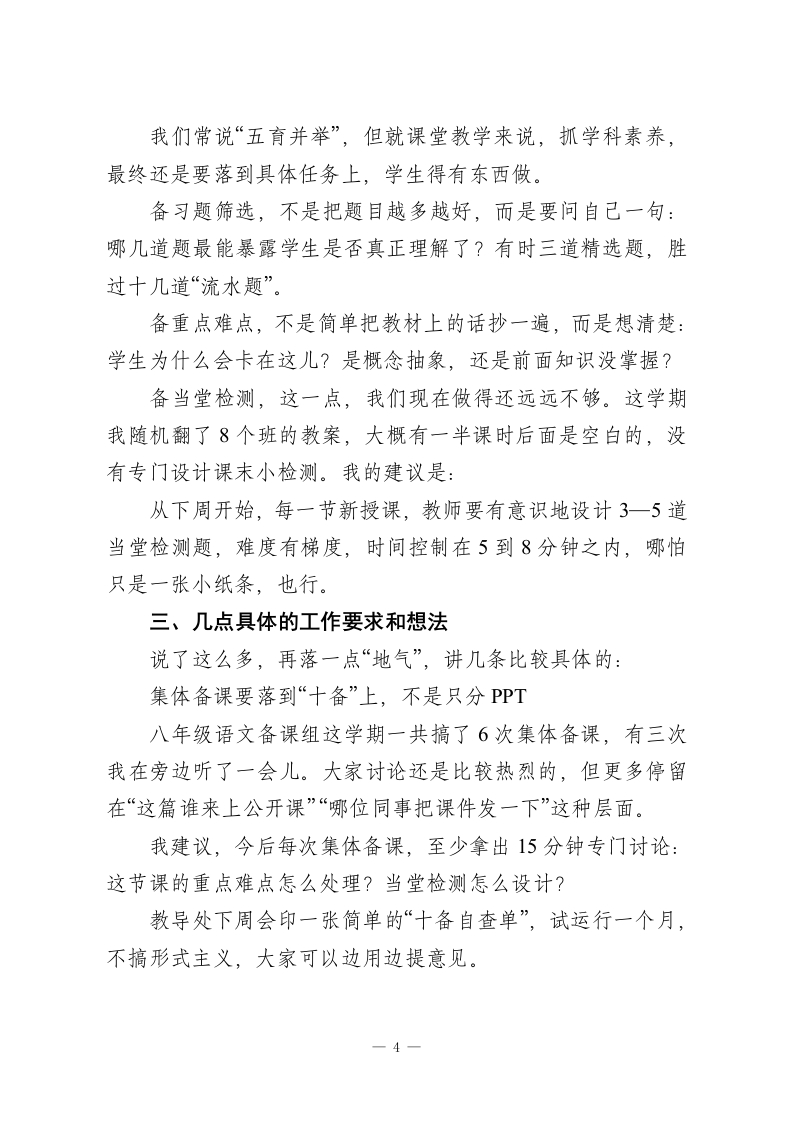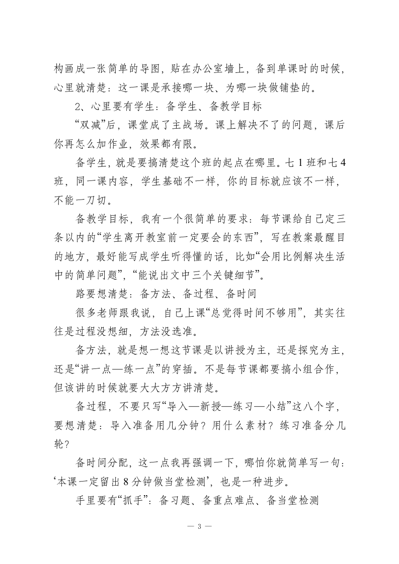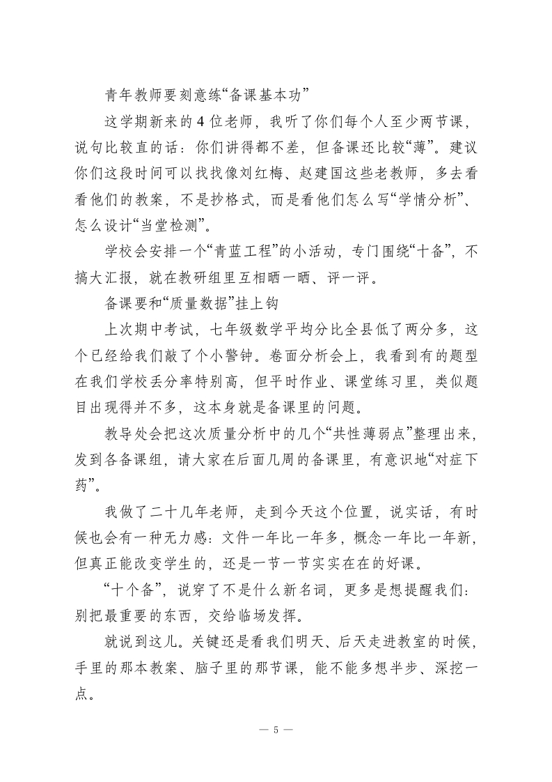 在课堂质量提升工作会上,校长讲话:把课备到教室里,而不是停在本子上!各位老师:今天我不想铺垫太多,就说一件事:备课。这段时间,教导处和我一起,断断续续推门听了大概一百二十多节课,七年级、八年级都涉及到。整体来看,大部分课是扎实的,学生也比较投入,这是肯定的。但也确实暴露出一些老问题:教案写得挺满,PPT做得挺花,真正到了课堂上,节奏乱了、重难点虚了、时间不够用了,有的老师明明备了很多内容,学生下课一问,记住的不多。所以,今天借这个会,我就想跟大家把“备课”这件事掰一掰(这个词我老爱说,其实就是想说清楚一点):怎么把课备到教室里,而不是停在本子上。一、先说几件这段时间看到的“小事”上周二还是周三,我去听了七2班王老师的一节数学课。她那节《整式的加减》,有几个地方让我印象挺深:她在教案上把45分钟简单分了个段:5分钟复习,10分钟新授例题,15分钟分层练习,10分钟当堂检测和小结。到下课铃响的时候,基本是按这个节奏走下来的,黑板右上角还留了一小块专门记“今天一定要会的三个点”。最后5分钟的当堂检测就四道题,难度从易到稍难,学生当堂订正。课后我随手翻了一下七2班的作业本,错误率明显比前两周同类题目少了很多。—1