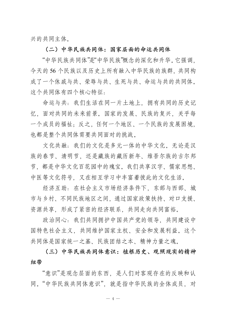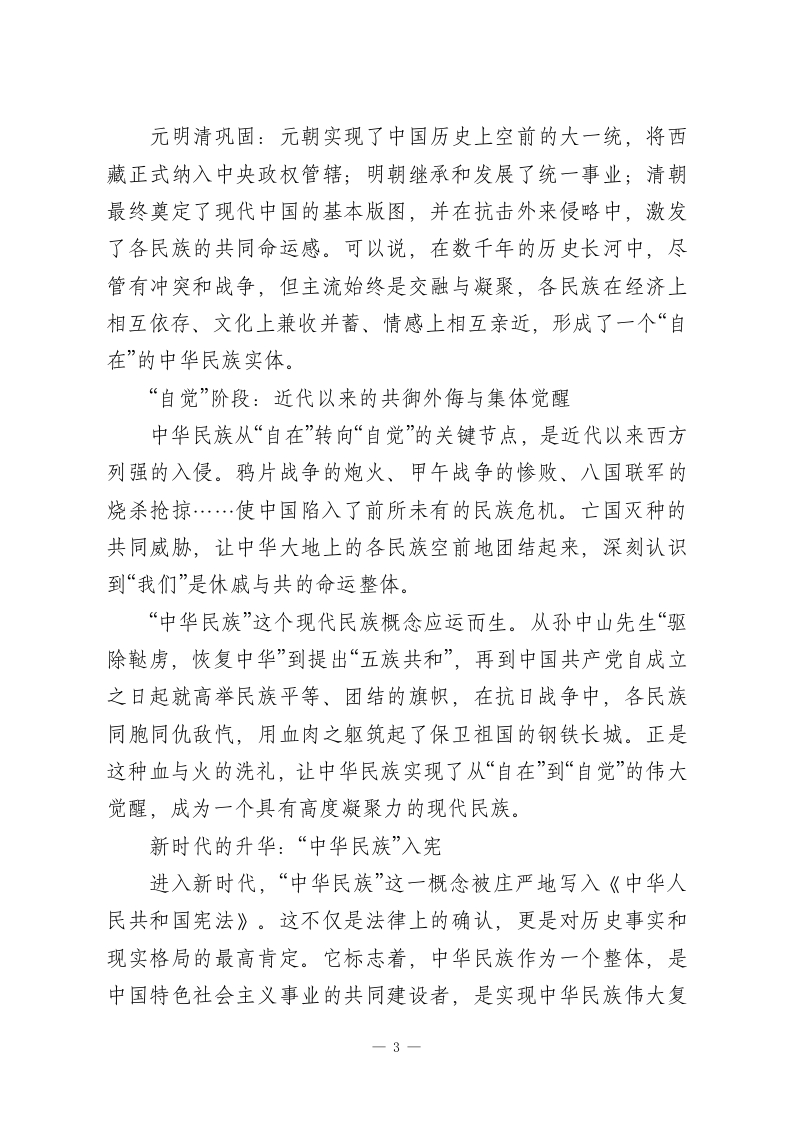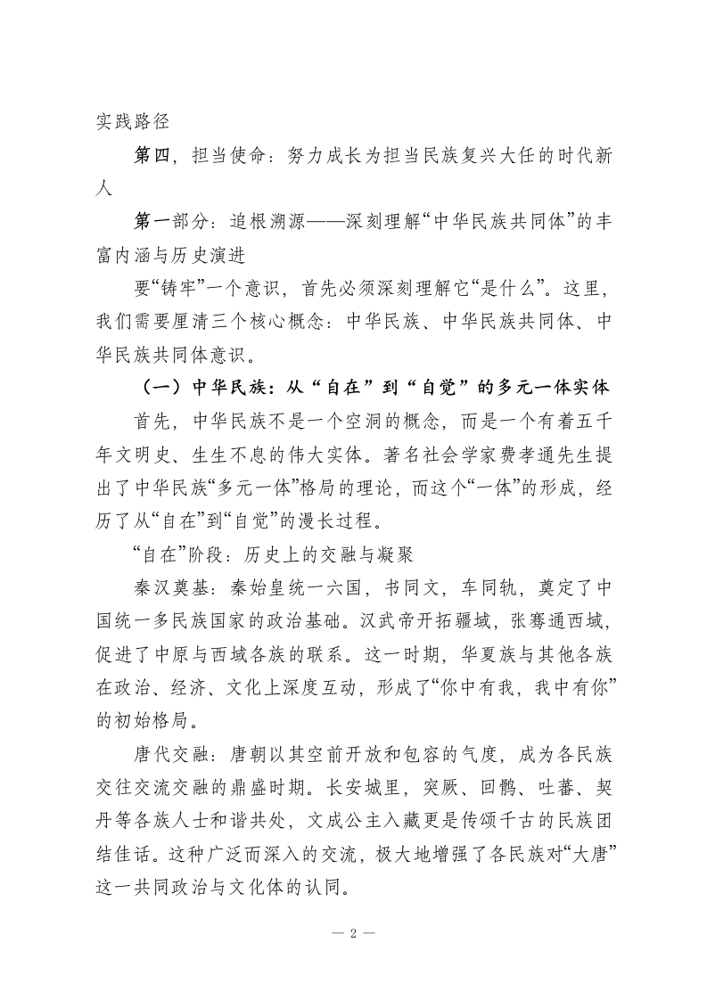 在市高中上关于铸牢中华民族共同体意识的思政课讲稿铸牢中华民族共同体意识担当民族复兴时代新人一在XX市高级中学思政课上的讲稿尊敬的各位领导、老师们,亲爱的同学们:大家好!今天,我们齐聚一堂,共同上一堂意义深远的思政课。这堂课的主题是:“铸牢中华民族共同体意识,担当民族复兴时代新人”。这个主题,宏大而深刻,它关乎我们国家的根基、民族的未来,更与在座的每一位同学的成长息息相关。或许有同学会问,这个听起来有些宏大的概念,和我们每天的学习生活有什么关系?我想告诉大家,它不仅有关系,而且是我们立身做人、成才报国的根本所在。它就像空气和阳光,滋养着我们,而我们每一个人,也都是构成这宏大叙事的一个鲜活细胞。今天,就让我们一同走进历史的长河,立足现实的土壤,展望未来的蓝图,深刻理解“中华民族共同体”的来龙去脉,共同思考我们青年一代的时代责任。我的讲稿将分为四个部分展开:第一,追根溯源:深刻理解“中华民族共同体”的丰富内涵与历史演进第二,时代必然:深刻认识“铸牢”这一意识的现实必要性与战略意义第三,知行合一:积极探索在校园与生活中“铸牢”意识的一1