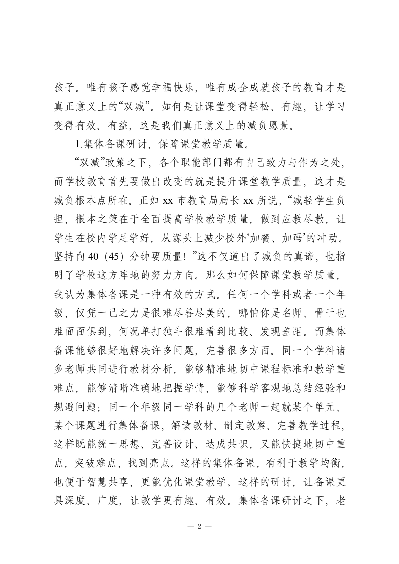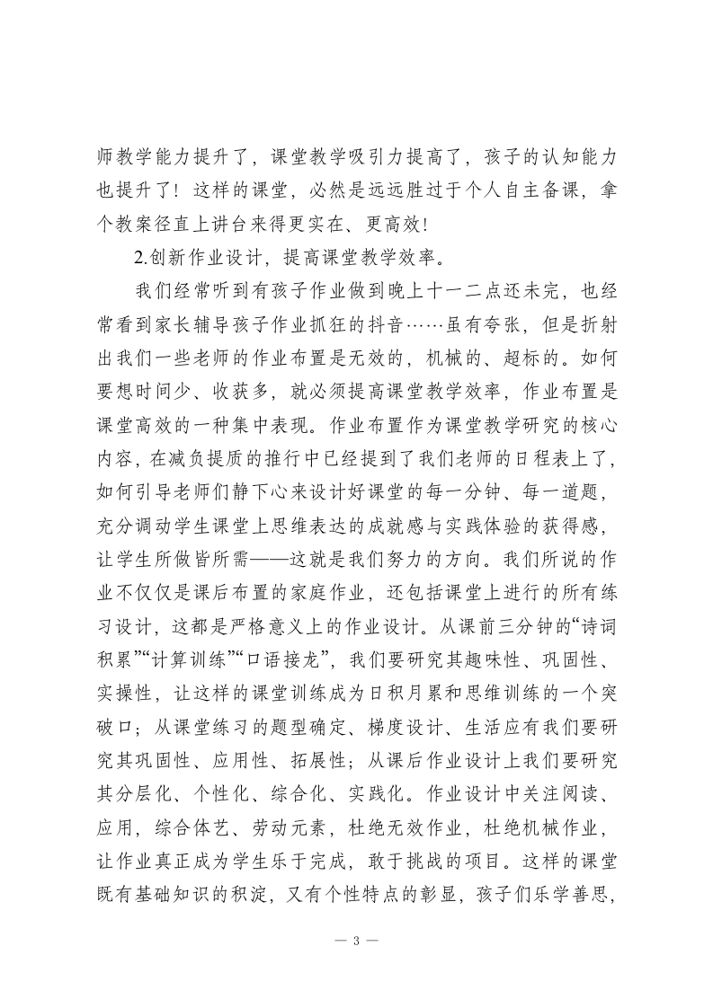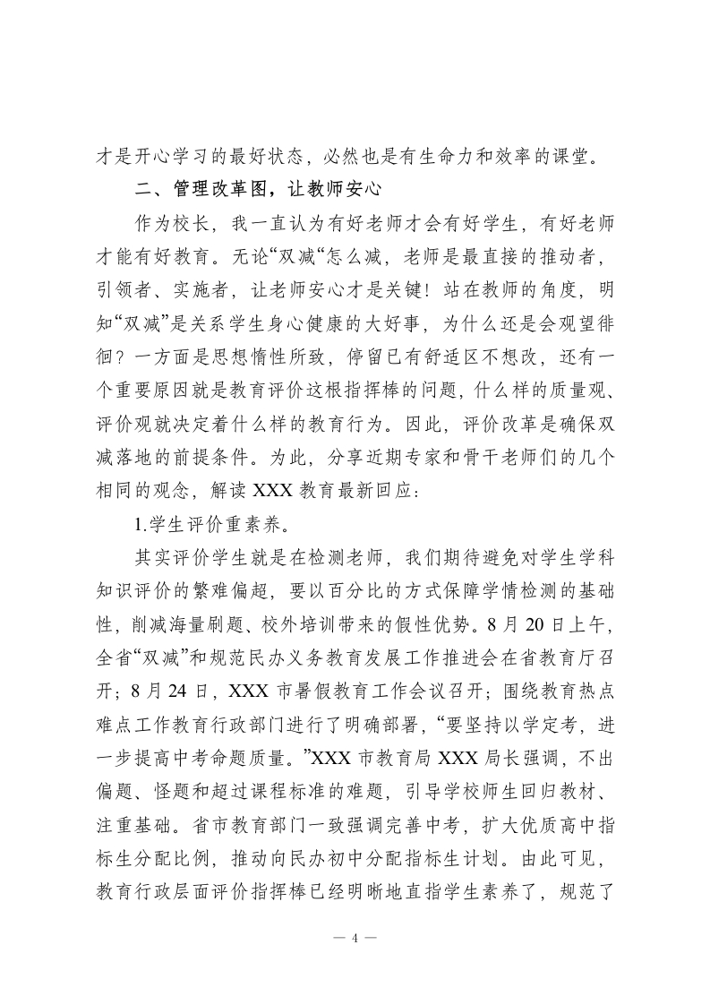在双减专题会上,校长精彩讲话,谈了3个愿景图各位老师:大家好」但凡与教育相关的人,近来必然绕不开“双减”二字!切实减轻学生作业负担和校外培训负担,正如一夜春风来,润泽的是我们孩子的童年与成长,挑战的是我们教育观念的大变革和教育格局的大调整!这是党之大计、国之大计,是推动学校教育和家庭教育回归本真的有力举措。它是新时代教育发展的必然趋势,是高质量教育体系的必然目标。新时代教育要求我们将“以人为本”开展各项工作,从关注学习结果到重视学习过程,从关注知识积累到重视精神成长,真正实现人的全面、健康、良性发展。“减负”如何减?减掉的是什么?“增效”如何增?增长的是什么?从这个意义上讲,“双减”是一项良心、走心、润心的工程,作为百年修业学校的老师们,我们必将于变局中开新局,执子之手与子同行,让每个孩子享受充实而丰盈的校园生活!下面我就“双减”意谈谈自己心中的愿景图。一、课堂提质图让学生开心“双减”推行首先呈现在我们眼前的应该是孩子们课堂上绽放的笑脸图,我们要站在学生的角度考虑问题,一切“减负”举措最终落脚点应该是解放我们的孩子,成就我们的1