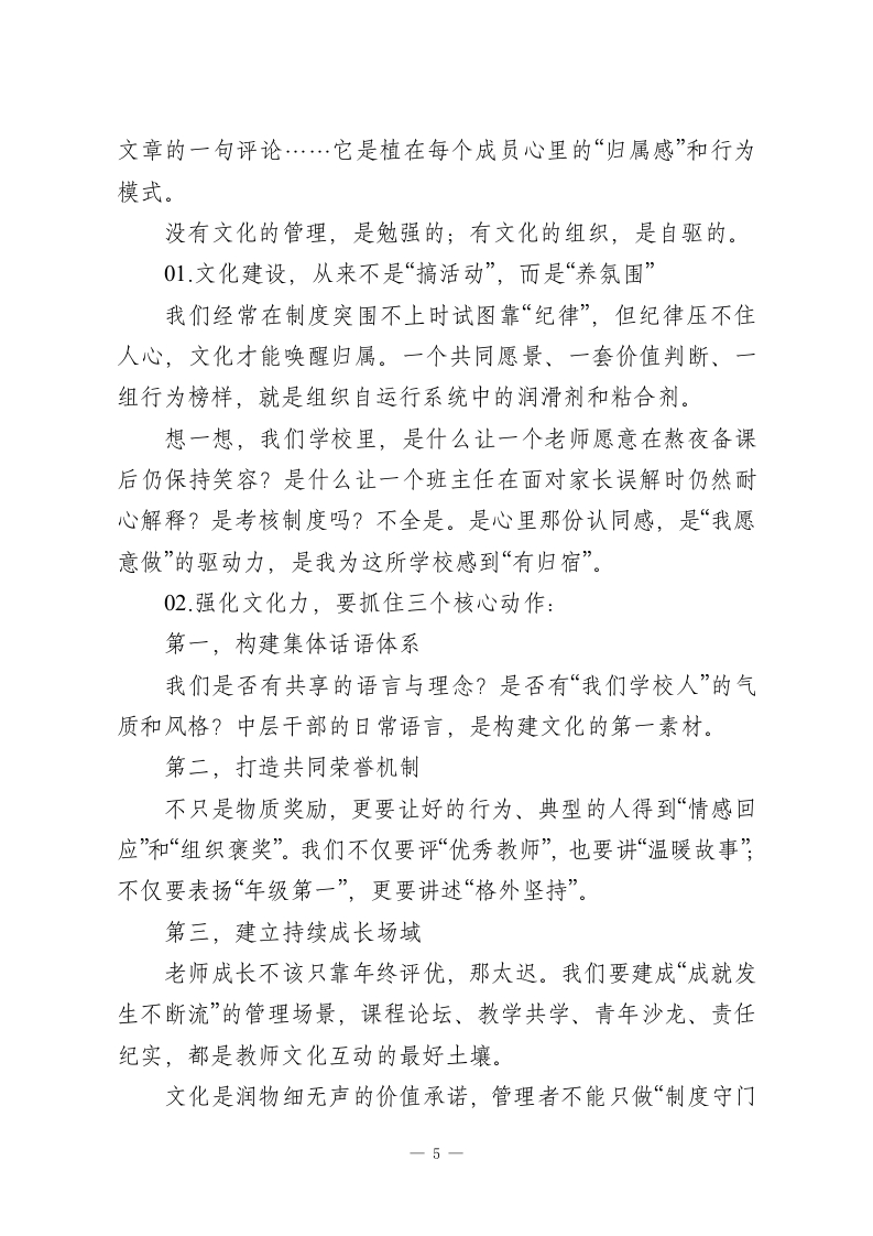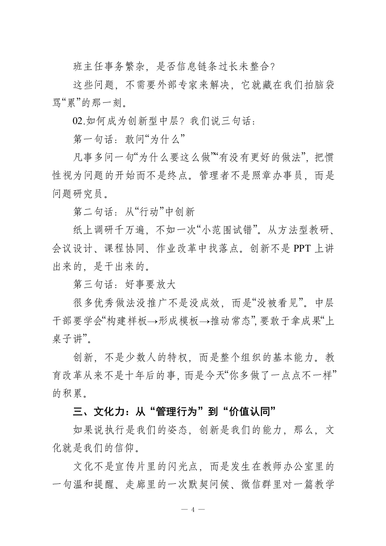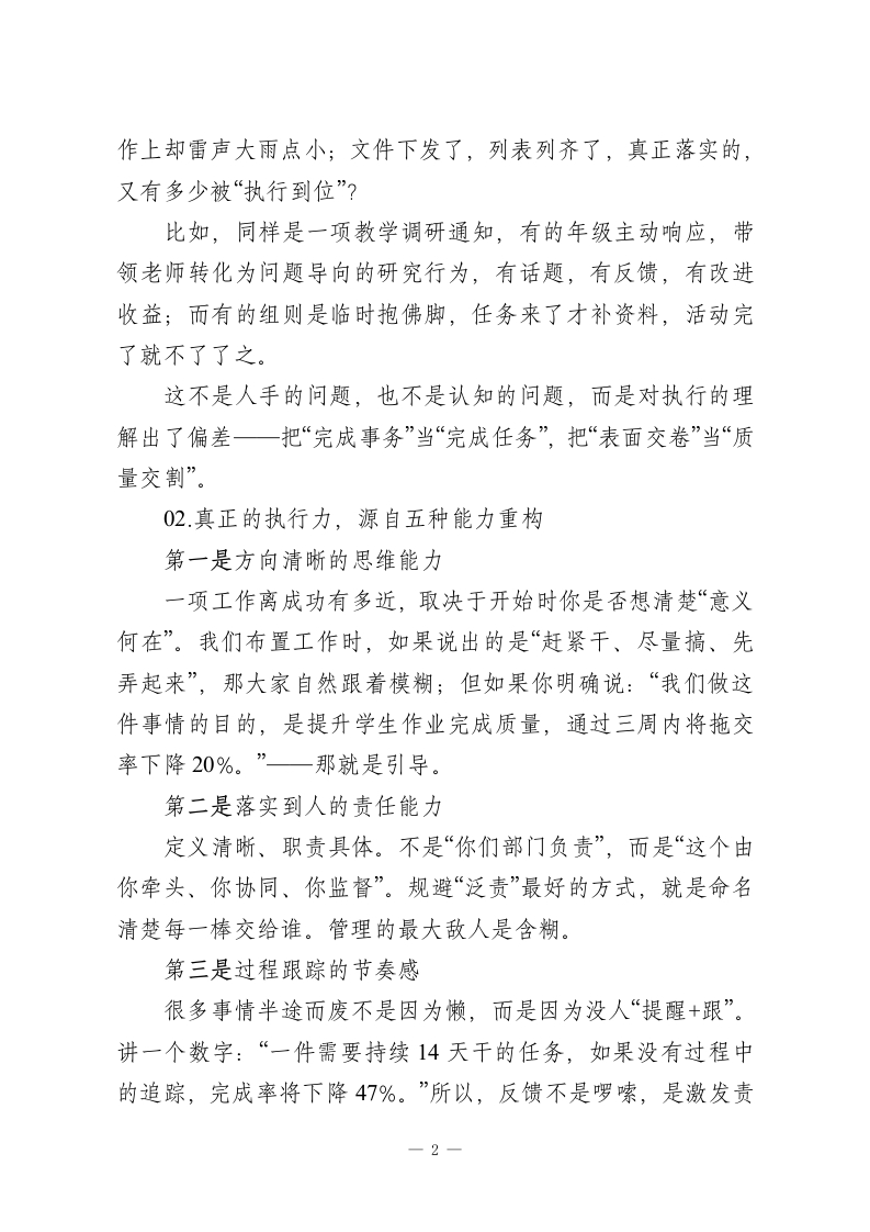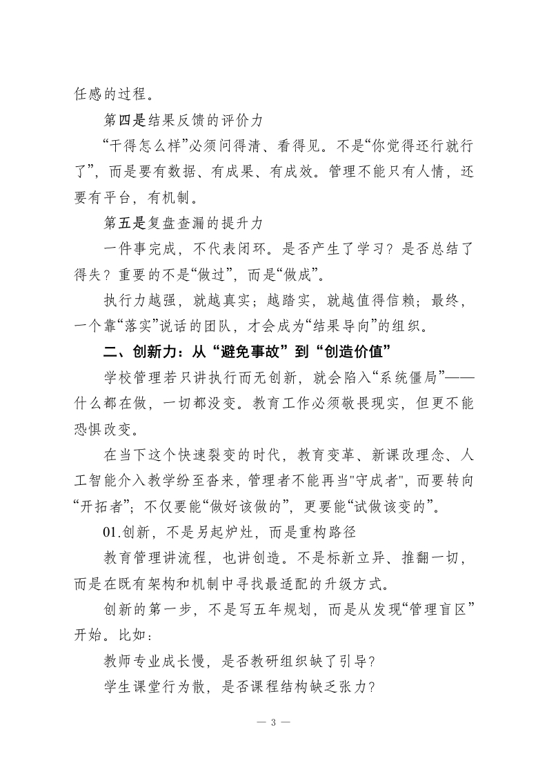 中层行政班子会上,校长讲话:权力的滋味比被爱更让人上头!尊敬的各位中层管理人员、亲爱的同仁们:大家好!感谢大家在百忙之中出席今天的会议。这不是一次例行事务沟通会,而是一次我们共同面对“如何带好队伍、管好学校、育好人”的思想交流会。我们在座的每一位,是学校组织系统的关键节点,是教学与管理一体化的核心推手,更是学校价值观的传播者与文化基因的建设者。开门见山地说,我今天和大家谈三个关键词:执行力、创新力、文化力。这不是哪一个人的口头禅,也不是挂在墙上的标语,而是贯穿一所学校组织生命力的基本内核。用好这三个核心元件,一个学校就能持续生长;一个团队就能不断走向卓越;一个干部,也才能真正完成从“管理者”到“引领者”的跃迁。一、执行力:从“完成任务”到“兑现承诺”“优秀的组织,执行力决定成败。”这是公认的组织管理共识,对学校而言更是如此。教育管理与工业化生产不同,它不以产量定输赢,而以“结果的质量”丈量成效。再完美的计划、再科学的制度,若无法落实到行动、落地在责任人身上,就如同空中楼阁,经不起现实检验。01.所谓执行,不是发发通知、写写总结那么简单我们日常管理中经常看到一种现象:安排得头头是道,动1