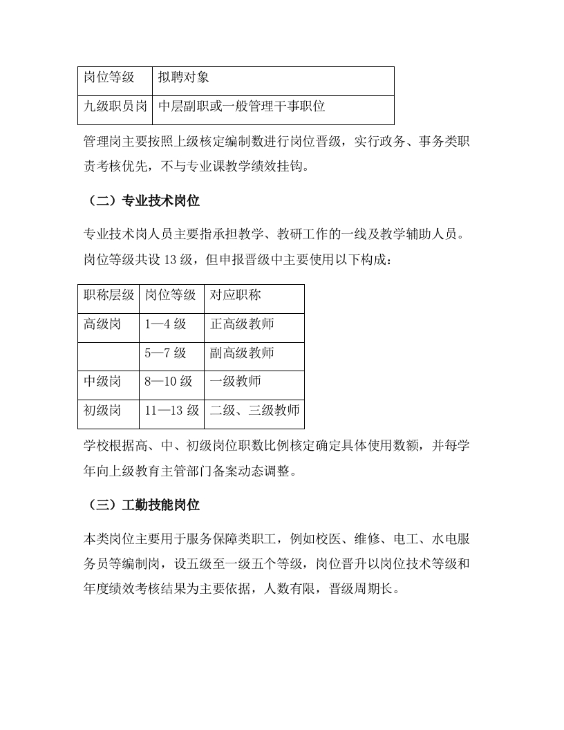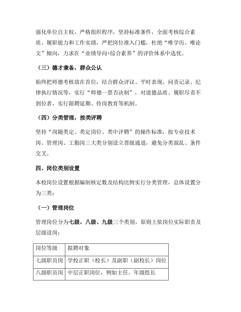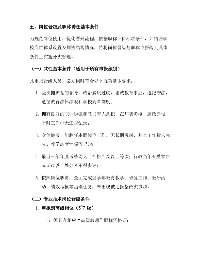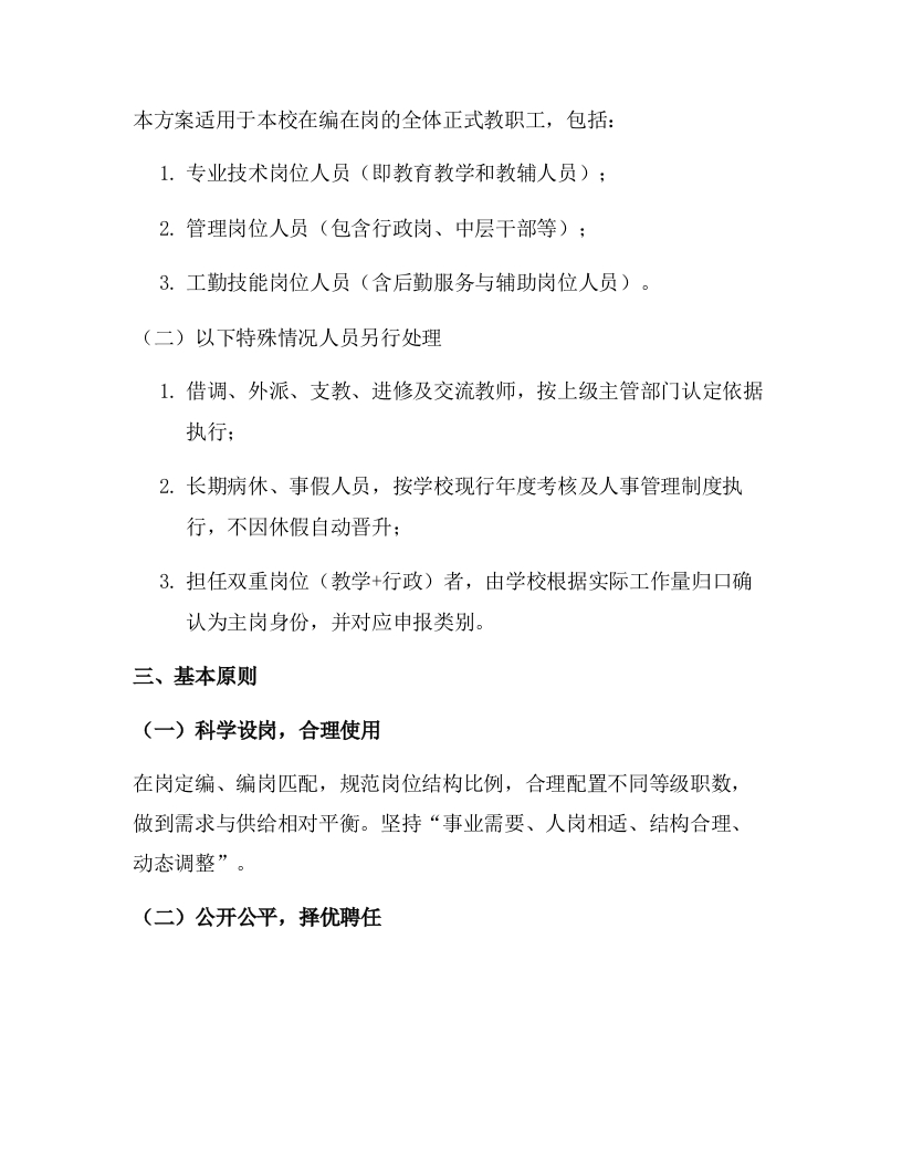 中学教师职称聘任及岗位晋级实施方案(2025年12月修订含附表)为全面贯彻落实新时代教育强国战略目标,进一步深化教育人事制度改革,规范学校教师职务聘任、岗位晋级工作流程,拓宽教师职业发展通道,切实发挥职称评聘和岗位管理在教师队伍建设中的导向作用,增强教师队伍建设的科学性、规范性及激励性,根据《事业单位岗位设置管理试行办法》《中小学教师职称制度改革指导意见》及省市相关文件精神,结合我校工作实际,特制定本实施方案。一、指导思想以习近平新时代中国特色社会主义思想为指导,以立德树人为根本任务,以加强教师队伍专业化能力建设为着力点,全面贯彻“德才兼备、以德为先、注重实绩、群众公认”的政策导向,建立体现岗位业绩、工作量贡献及教研能力为中心的中学教师职称聘任和岗位晋级机制。坚持问题导向与目标管理相结合,从严控制评聘程序、从实推动教师成长,真正发挥职称评聘在队伍建设中的“指挥棒”作用、在岗位晋升中的“风向标”作用,进一步促进教师专业发展和学校教育教学质量的不断提升。二、适用范围(一)实施对象