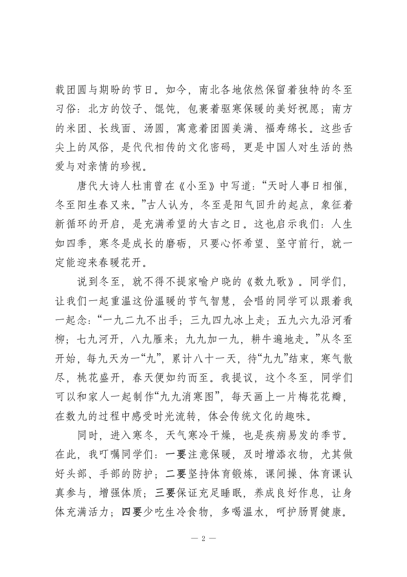 2025冬至快到了,校长在国旗下讲话:感知风俗,情暖冬至尊敬的各位老师,亲爱的同学们:大家早上好!今天,我们站在庄严的五星红旗下,共同迎接新一周的启程。再过六天,也就是12月21日(本周日),我们将迎来中国传统二十四节气中极具分量的节气一一冬至。今天,我讲话的主题正是《感知风俗情暖冬至》。同学们,冬至是二十四节气中最早被测定的节气,早在2500多年前的春秋时代,我们的祖先就精准测算出了它的时刻,这份古老的智慧,彰显着中华传统文化的深厚底蕴。它通常落在每年阳历12月21日至23日之间,而今年的冬至恰逢周日。这一天,北半球的白天最短、黑夜最长,过了冬至,白昼便会一天天变长,阳气渐生,仿佛在告诉我们:最冷的时节里,希望与生机已在悄然酝酿。古人云“阴极之至,阳气始生,日南至,日短之至,日影长之至”,这正是“冬至”名称的由来。它不仅是一个节气,更承载着祭祖敬先的传统,是维系家族情感、传承家风的重要载体;冬至过后,我们就进入了“数九寒天”,民间常说“冷在三九,热在三伏”,从冬至起,我们便开始数九迎春,感受季节交替的韵律。在古代,冬至有着“冬至大如年”的说法,这份重视源于汉代,盛于唐宋,流传至今。它不仅是一个节气,更像是一个承-1