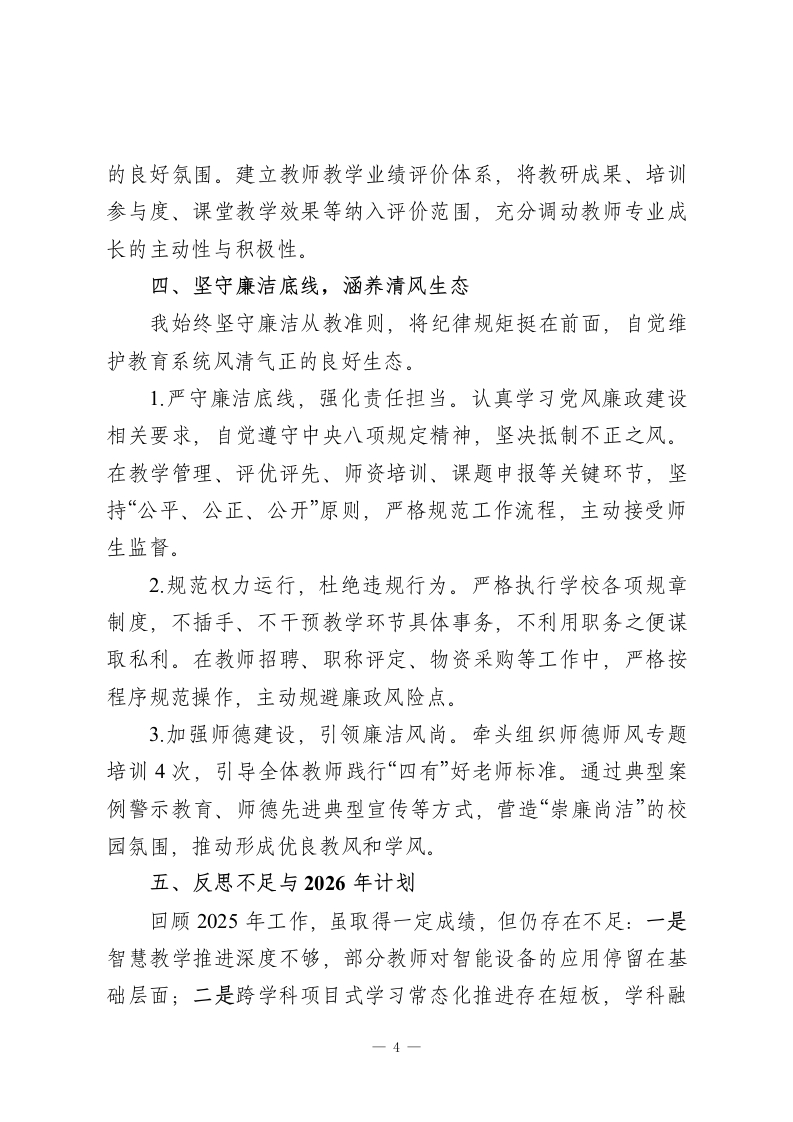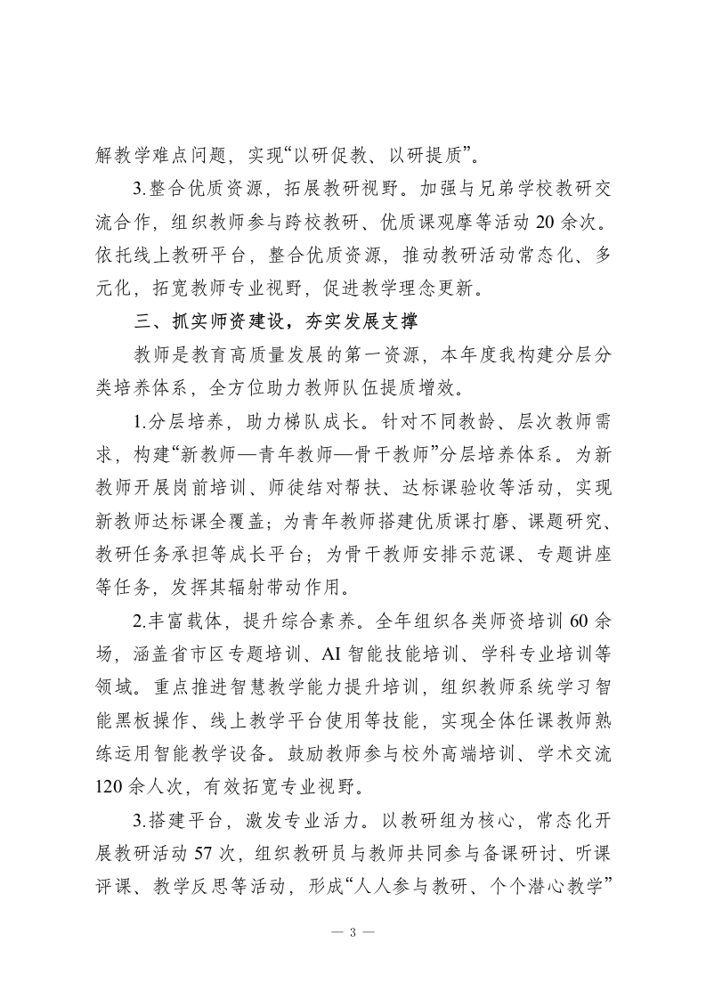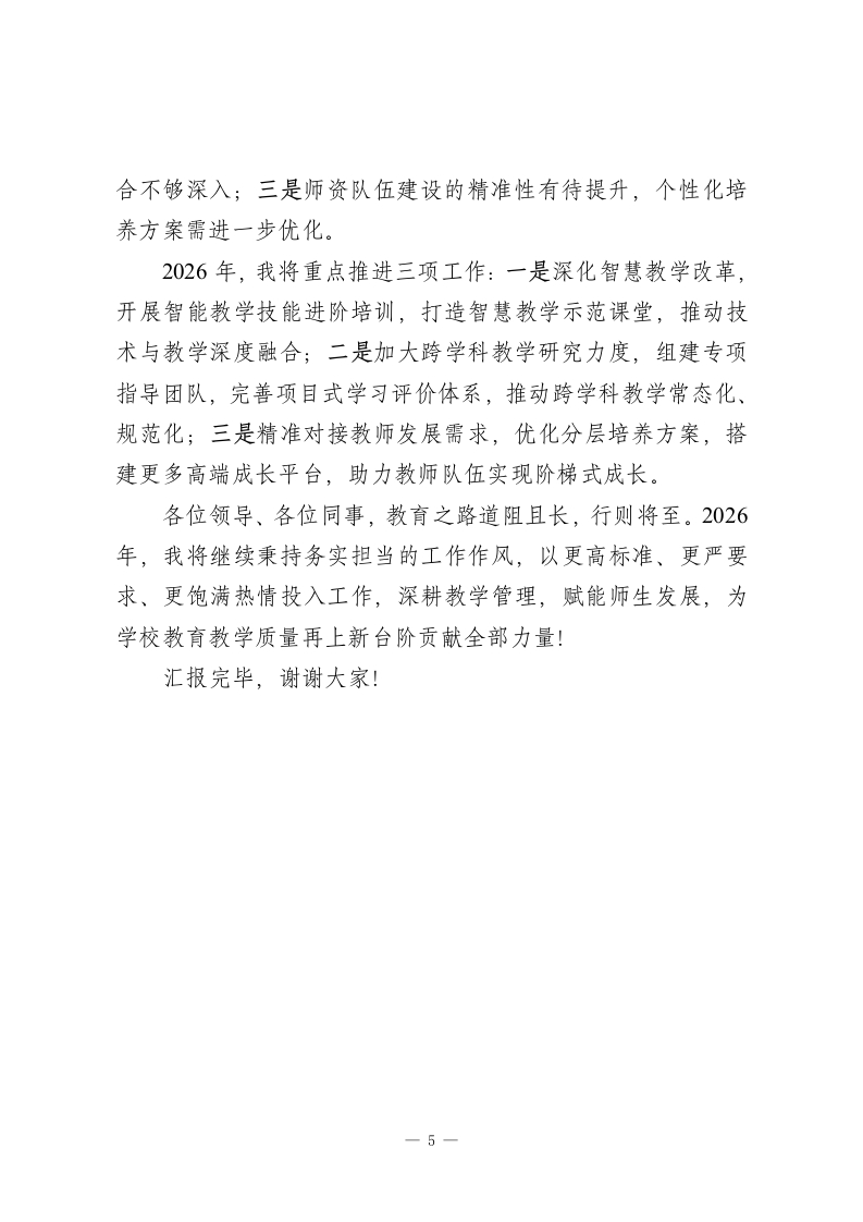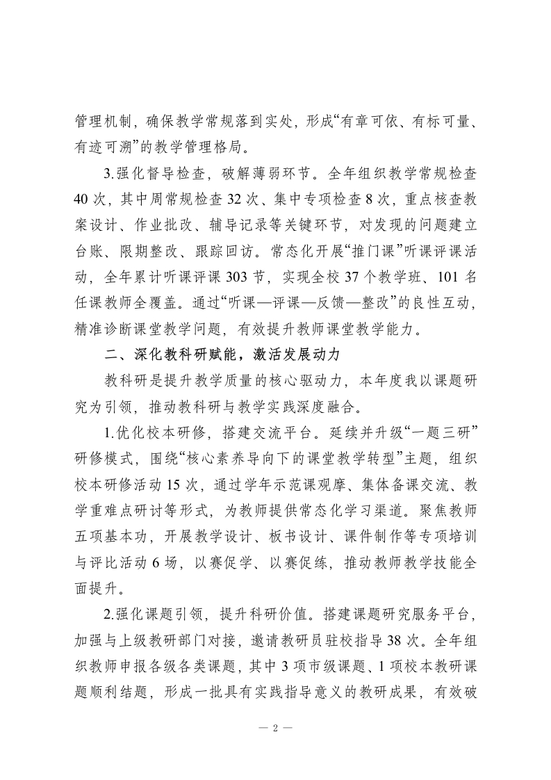 2025年度教学副校长工作汇报:以研促教强根基,以质立校谋发展尊敬的各位领导、各位同事:2025年,是教育高质量发展向纵深推进的关键一年,也是我校聚焦核心素养、深化教学改革的攻坚之年。在上级教育部门的正确指导下,在学校领导班子的团结协作与全体教职工的鼎力支持下,我始终锚定“立德树人”根本任务,以提升育人质量为核心,统筹推进教学管理、教科研、师资队伍建设等分管工作,推动各项教学工作从“规范提升”向“内涵发展”跨越,取得了阶段性成效。现将本年度履职情况汇报如下,恳请各位批评指正。一、精耕教学管理,筑牢质量根基教学管理是学校发展的核心引擎,本年度我以“全流程精细化管控”为抓手,推动教学管理提质增效。1.锚定课标导向,创新教学模式。以新课标核心理念为指引,牵头推进“思维型教学”改革与跨学科项目式学习落地。组建跨学科教学研讨小组,开展主题式教学设计评比、项目式学习成果展示等活动12场,打破学科壁垒,将核心素养培养融入教学全过程,激发学生主动思考与探究能力。2.完善制度体系,规范教学流程。牵头修订教学常规管理制度,细化“备、教、批、辅、考、析”全流程评价标准,明确各环节操作规范与质量要求。建立“制度+检查+整改+反馈”闭环1
