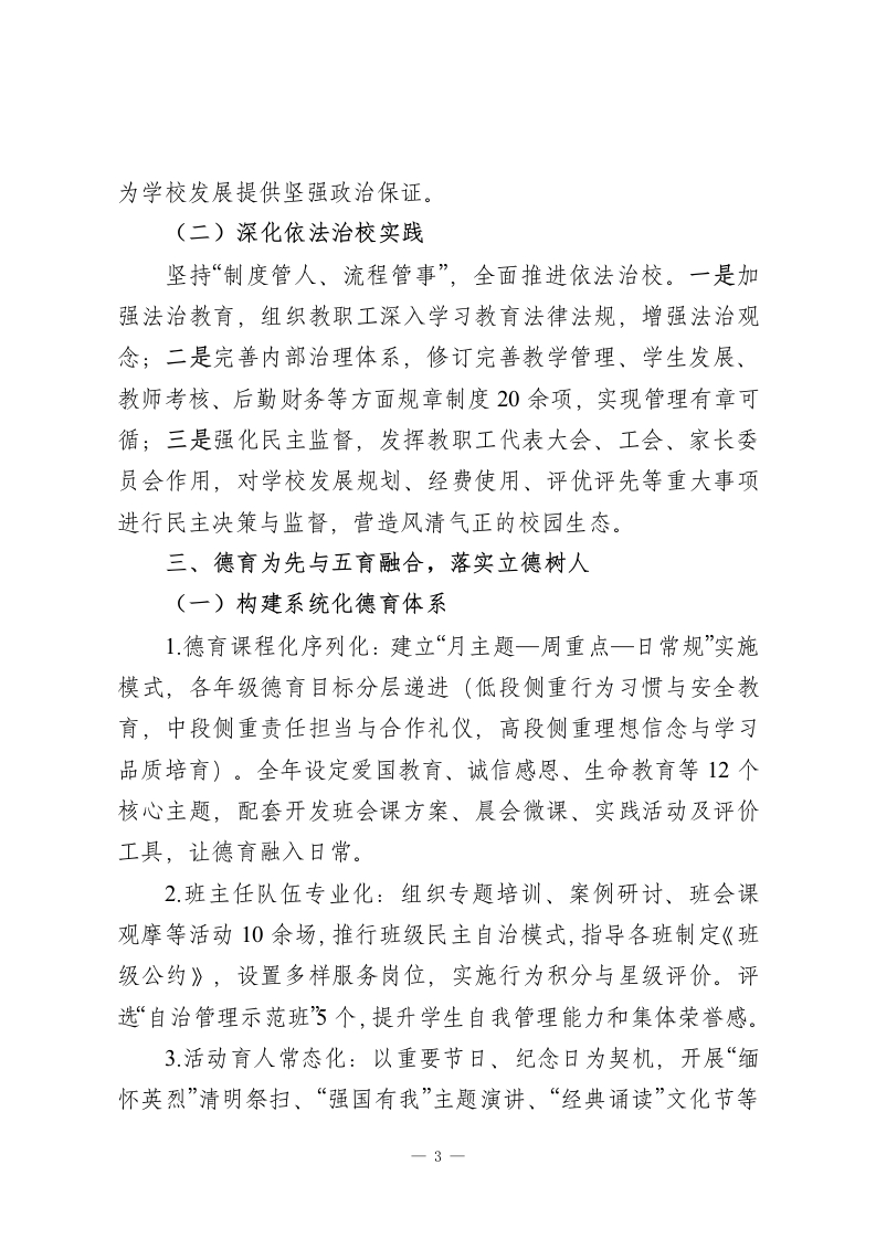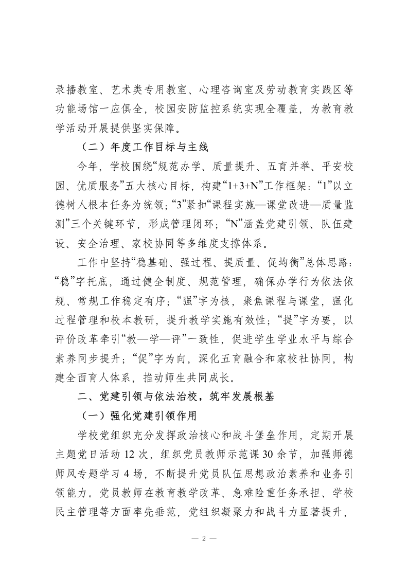 2025年学校迎检暨年度工作报告:守正创新提质效砥砺奋进谋新篇尊敬的各位领导、各位同仁:大家上午好!2025年,是教育高质量发展的深化之年,也是我校接受全面检验、蓄力再攀新高的关键一年。我们始终将上级督导评估视为办学治校的“全面体检”和“精准导航”,以高度的责任感和使命感,紧扣“立德树人”根本任务,立足“因材施教、全面发展、质量立校”办学理念,确立“守正创新,系统提质”年度主题,构建“一体两翼三驱动”战略框架(以“新时代立德树人育人体系”为主体,“治理能力现代化”和“评价改革深化”为两翼,“课堂与教研深度变革教师队伍赋能振兴“家校社协同攻坚”为驱动),通过“学期初战略研判一学期中过程督查一学期末成效复盘”的闭环管理,统筹推进各项工作落地见效。现将我校2025年度工作情况及自评结果汇报如下,恳请各位领导批评指正。一、学校基本情况与年度工作总体思路(一)学校概况我校是一所公办九年一贯制学校,现有教学班X个,在校学生X人,教职工X人,其中专任教师X人。教师队伍中,高级职称教师占X%,中级职称占X%,拥有市级骨干教师X人、区级学科带头人X人、校级骨干教师X人,师资结构合理、梯队分明。学校硬件设施完备,图书馆、实验室、计算机教室、1