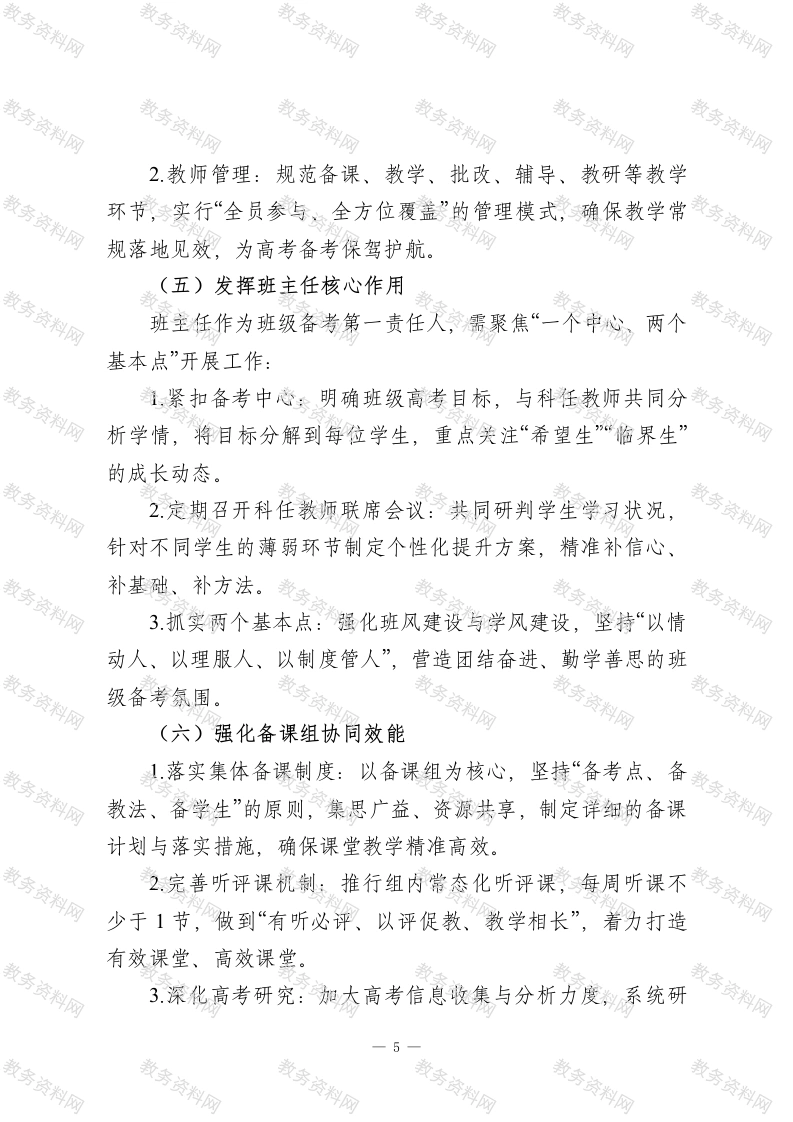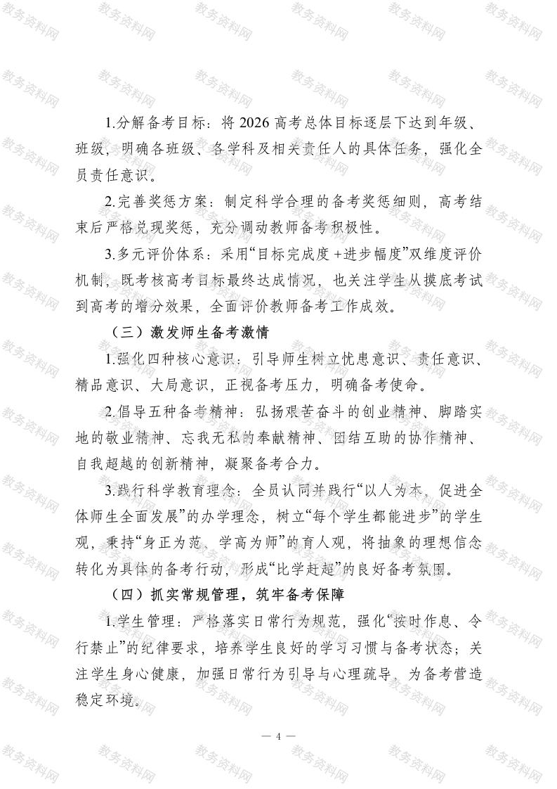 2026高考高三备考方案与措施一、现状简析本届高三学生规模达760余人,共设14个教学班,其中理科班8个、文科班6个,含理科重点班2个、文科重点班1个艺术班1个。相较于往届,本届学生人数有所增加,但整体基础相对薄弱,待提升学生群体占比较大,拔尖优等生数量偏少且优势不突出。基于这一学情,2026年高考备考面临较大压力,需精准施策、高效推进。二、指导思想以“做明白人,做勤快人,做能成事的人”为核心指引,紧扣高考考纲要求,立足教材根本,更新备考理念,创新教学方法。坚持“培优、辅中、转差”三位一体,兼顾文理学科均衡发展,重视音体美等特长领域培育,充分关注学生个性差异,践行因材施教、分类分层教学原则,让不同层次的学生均能实现个性化成长与突破性发展,助力师生共同达成备考目标。三、总体思路构建“一个核心团队”,抓实“两项关键建设”,聚焦“三个学生层次”。即打造一支同心同德、群策群力、攻坚克难的高效应考团队;重点推进班风学风建设与教风研风建设,筑牢备考根基;精准聚焦拔尖优等生的拔高培养、“临界生”的强化突破、特长生的专项保障,确保备考工作全覆盖、无遗漏,各环节精准发力。一1