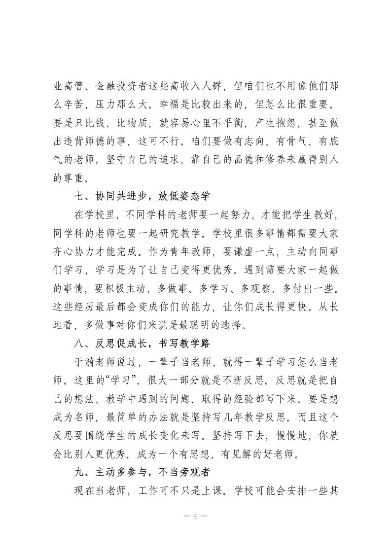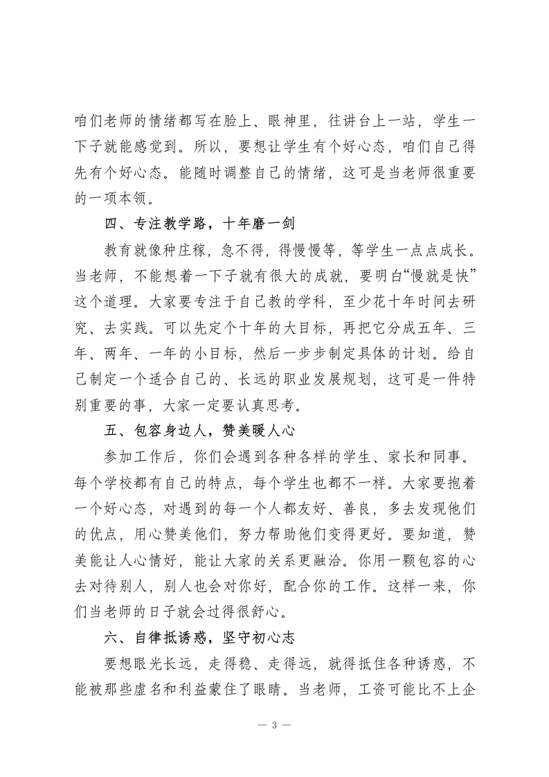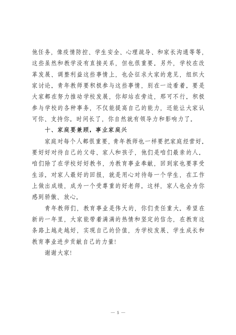 2026新年元旦青年教师座谈会上,校长精彩讲话:教育事业是伟大的,你们责任重大青年教师们:大家新年好!在这新年伊始,咱们聚在一起开这个青年教师座谈会,特别有意义。你们刚踏入教师这个岗位,未来的路还长着呢。既然选择了教师这份工作,就得好好琢磨琢磨,这一辈子当老师,咱得定个啥目标,保持哈样的状态,又该走出一条啥样的教育之路呢?咱们国家有个大计划,到2035年要基本实现社会主义现代化,教育得抢先实现现代化,建成教育强国;到本世纪中叶,要建成综合国力和国际影响力都领先的社会主义现代化强国。你们90后、00后的青年教师,从年龄上看,到2035年,正是在教育领域大展身手的“黄金一代”;到2050年,大部分人还在培育学生的岗位上呢。所以说,你们这一代青年教师可太幸运了,整个教书生涯都能陪着中华民族一步步实现伟大复兴。再看看咱们的学生,现在初中和高中的学生,到2035年就成了党和国家的顶梁柱;现在幼儿园和小学的孩子,到2050年也会成为重要的力量。这些学生肩负着民族复兴的重任,而你们青年教师责任重大,要培养出能担当大任的新一代。所以啊,大家一定要有远大志向,过一种不一样的教育生活。一1