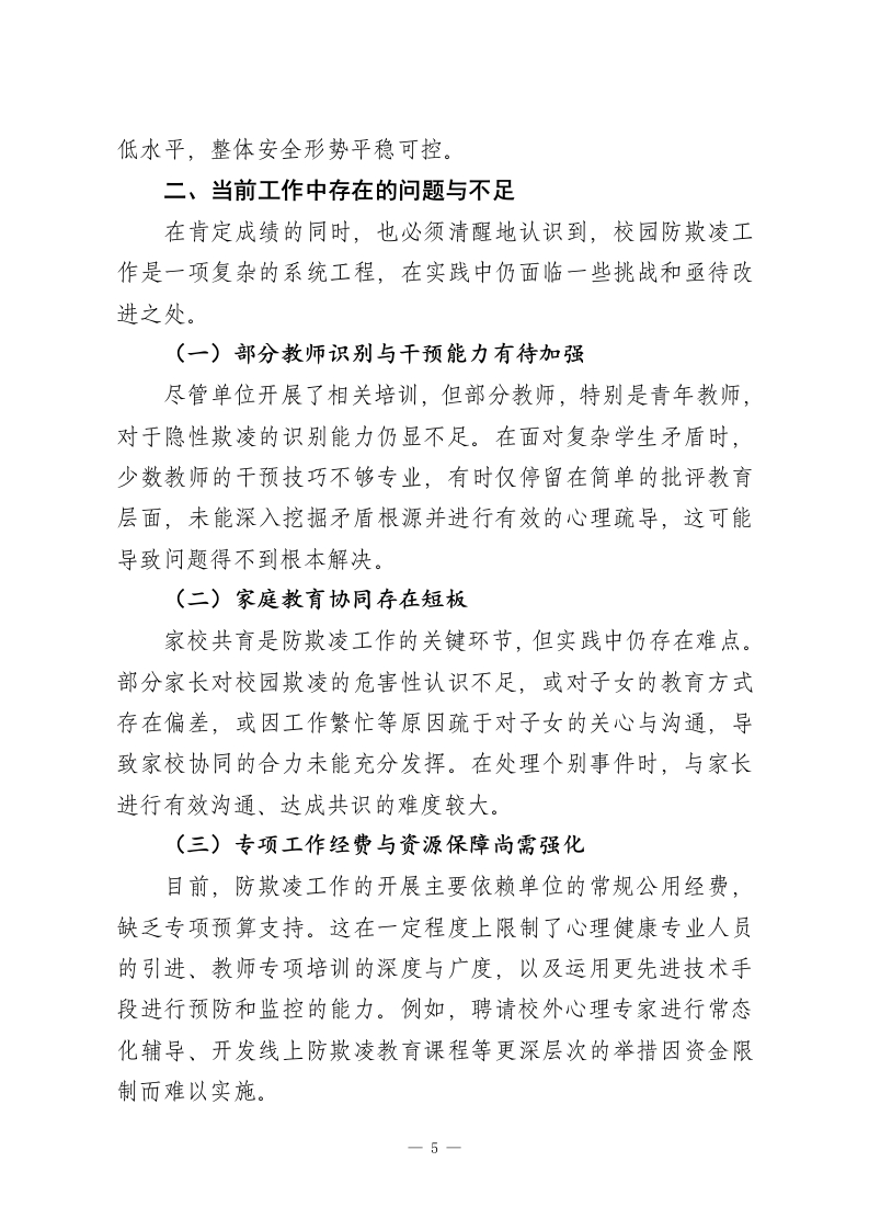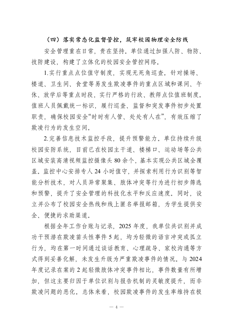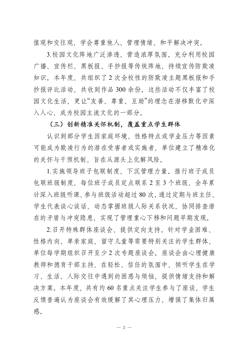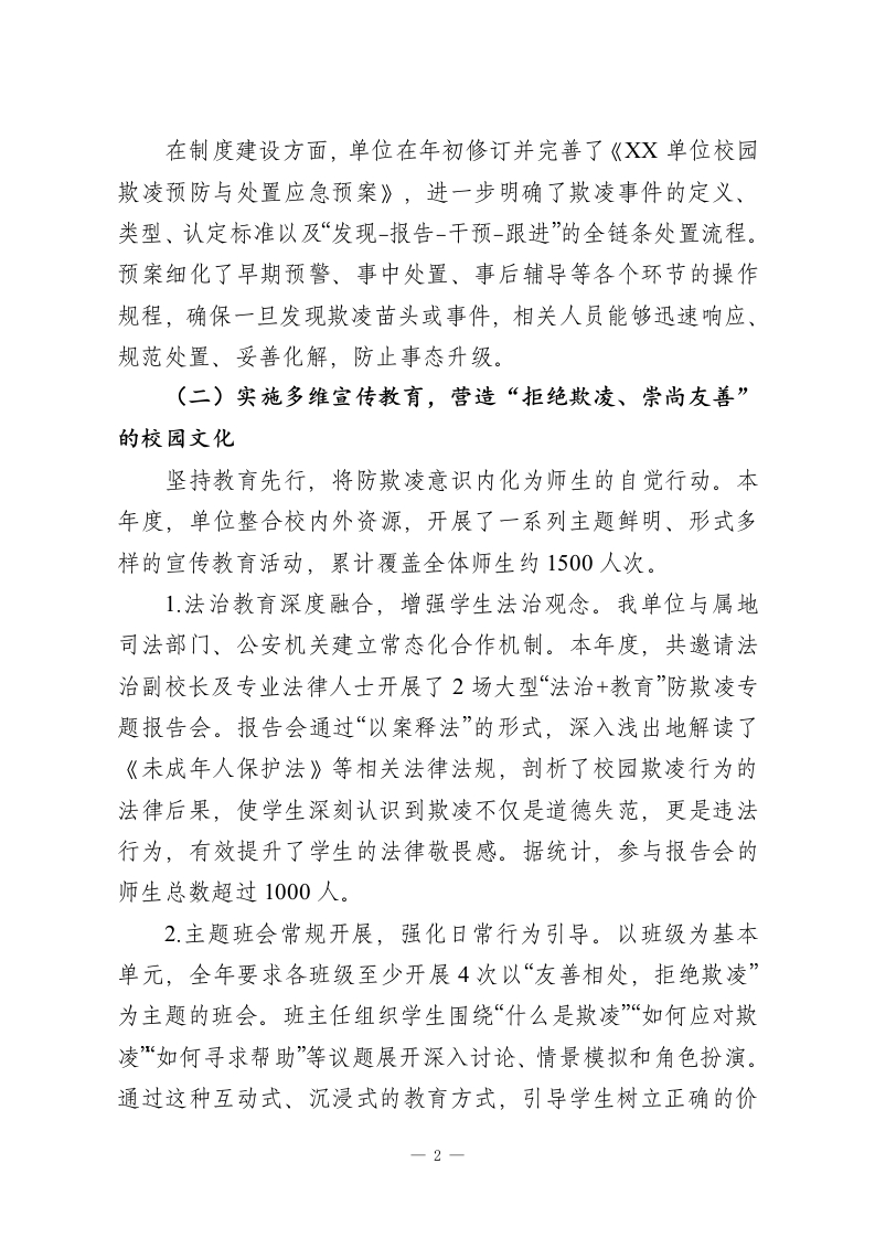 XX单位关于2025年度校园防欺凌专项工作的情况报告为切实维护校园安全与稳定,保障广大学生的身心健康与合法权益,营造和谐、友善、文明的育人环境,根据上级部门关于加强中小学安全管理工作的统一部署,我单位于2025年度将校园防欺凌工作作为安全建设的核心任务之一,坚持“预防为主、教育为先、法治为基、关爱为本”的原则,构建并深化了多维度、全覆盖的校园欺凌综合治理体系。一、年度工作基本情况与主要成效2025年,我单位紧密围绕校园安全的核心目标,将防欺凌工作全面融入教育教学、日常管理和家校社协同育人全过程,通过系统化、常态化、精细化的举措,织密了校园“安全网”,有效遏制了欺凌事件的发生,校园整体环境呈现出积极向上的良好态势。(一)强化组织领导与制度保障,构建权责明晰的治理架构为确保防欺凌工作落到实处,单位成立了由主要负责同志任组长,分管领导任副组长,各职能部门、年级组及班主任共同参与的校园欺凌综合治理工作领导小组,形成了“一级抓一级、层层抓落实”的责任体系。小组定期召开专题会议,研究部署工作任务,分析研判潜在风险。本年度,领导小组共召开4次专题会议,研究解决了包括重点学生心理疏导、家校矛盾调解等在内的多项具体问题。一1一