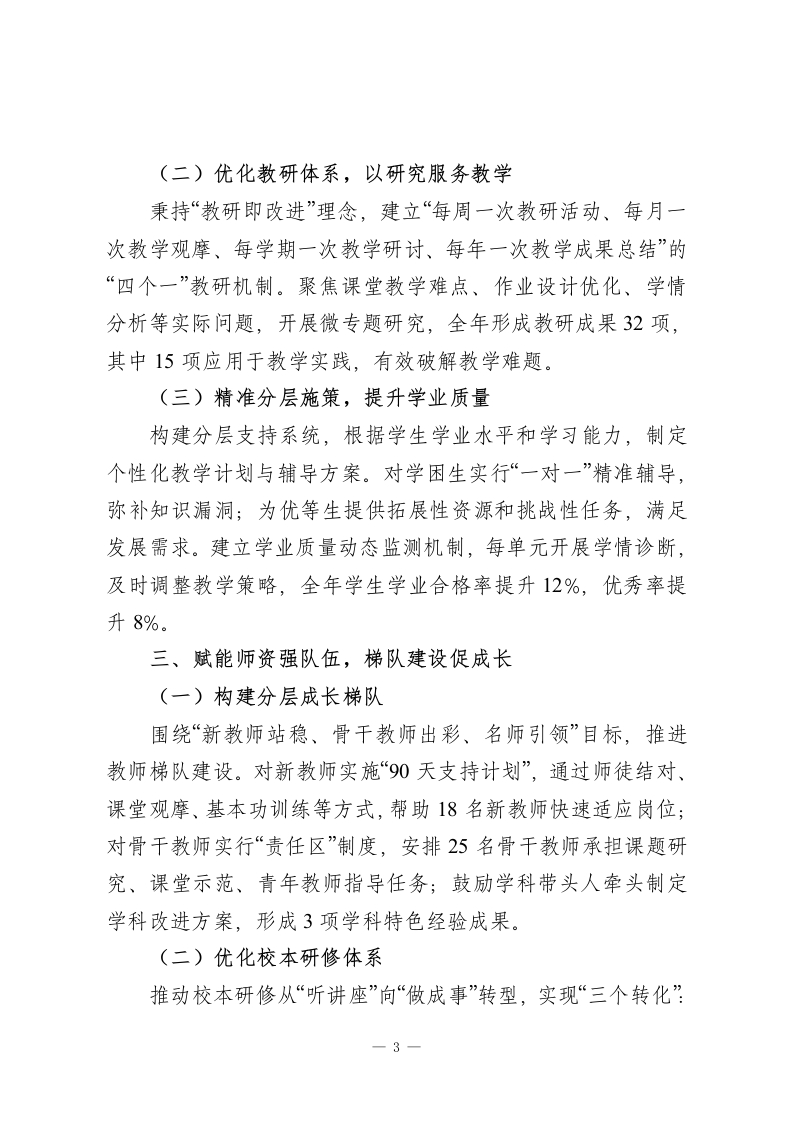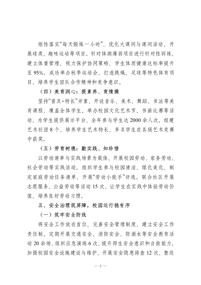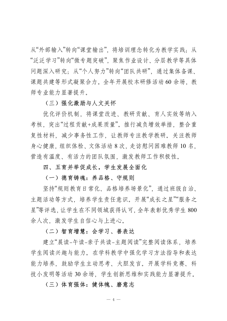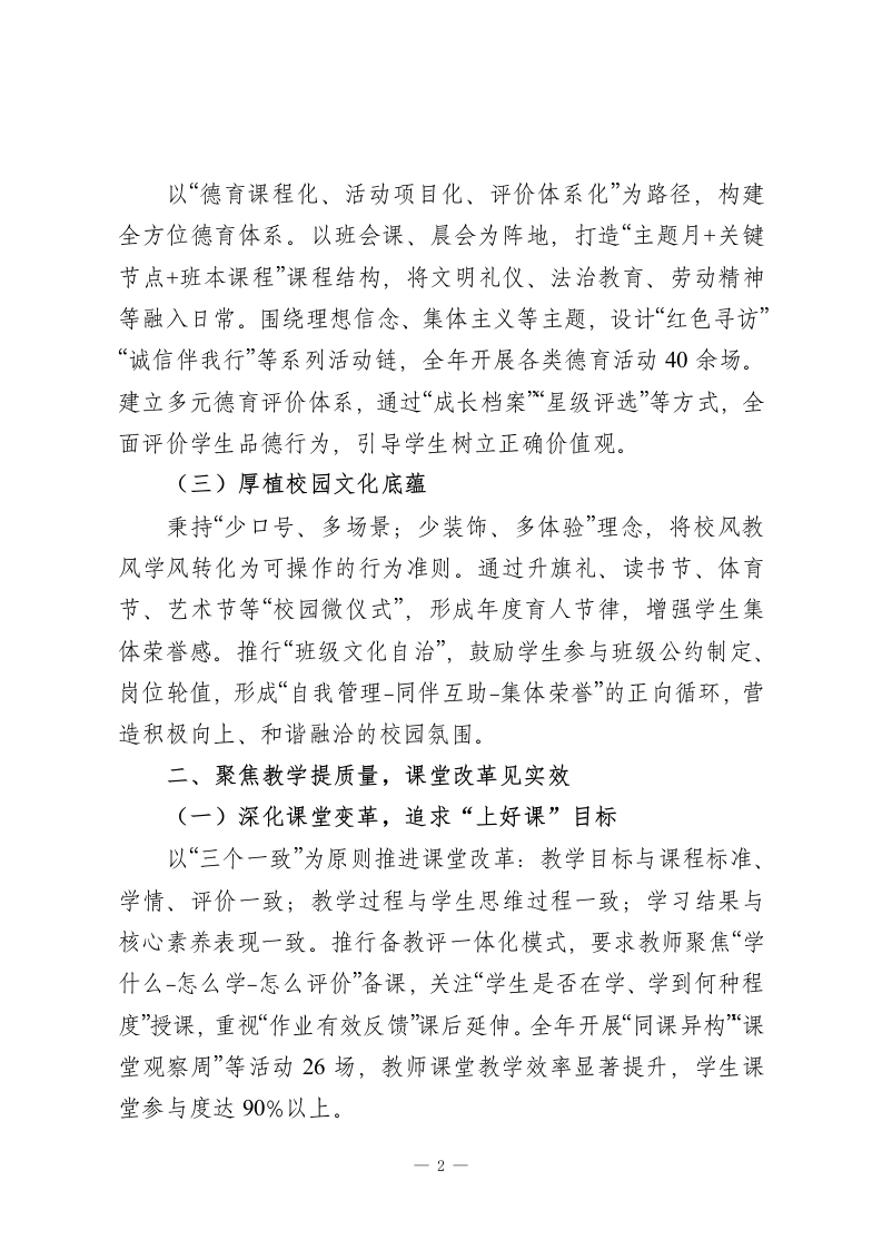 XX校长2025年度全面工作汇报:守正创新谋发展,提质赋能启新程2025年,是教育强国建设纵深推进的关键一年,也是我校锚定高质量发展、深耕教育教学改革的攻坚之年。这一年,新课标全面落地、“双减”政策持续深化、核心素养培育贯穿全程,教育变革的浪潮既带来了机遇,也提出了更高挑战。我校始终坚守“为党育人、为国育才”初心使命,秉持“为每一位学生的终身发展奠基”办学理念,以立德树人根本任务为核心,沿着“筑牢安全、提升质量、赋能师资、文化润心、协同奋进”五条主线,稳步推进各项工作。通过项目化推进、清单化落实、体系化评价的闭环管理,实现了教学质量稳步提升、教师队伍蓬勃发展、学生成长全面向好的良好局面。现将本年度工作情况汇报如下:一、党建引领强根基,育人方向不偏航(一)深化党建与办学融合坚持党建统领学校发展全局,将党的教育方针贯穿学校决策、教学管理、育人实践全过程。发挥党组织战斗堡垒作用和党员教师先锋模范作用,开展“党员示范岗“党员示范课”等活动,让党员教师在课堂教学、课题研究、学生帮扶中率先垂范。全年开展主题党日活动12次,党员教师带头承担急难险重任务30余项,形成“党建促教育、教育强党建”的良性循环。(二)推进德育一体化建设1