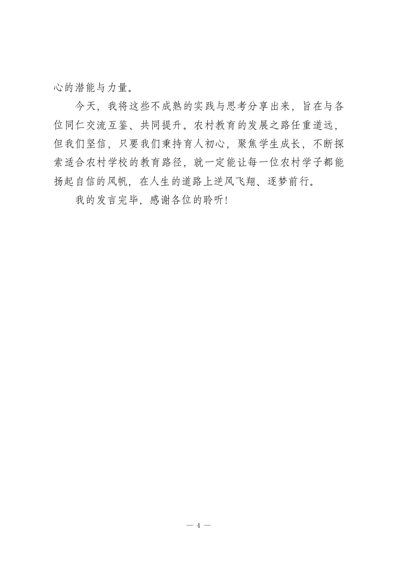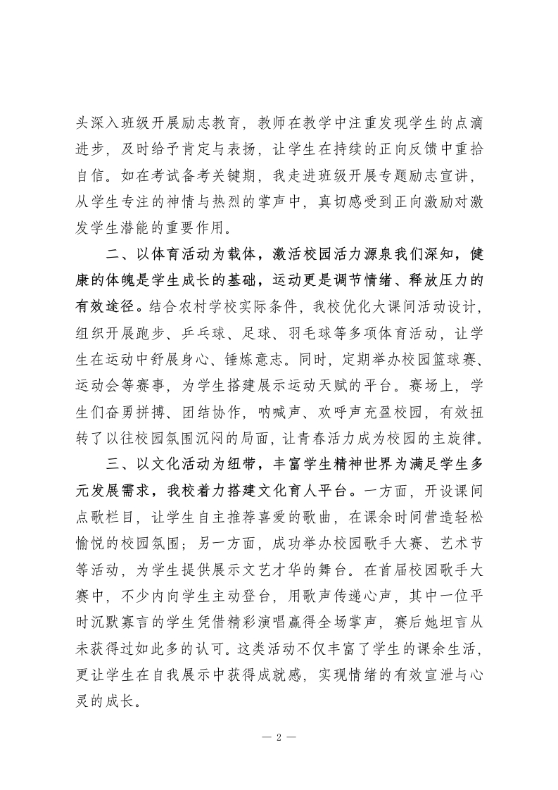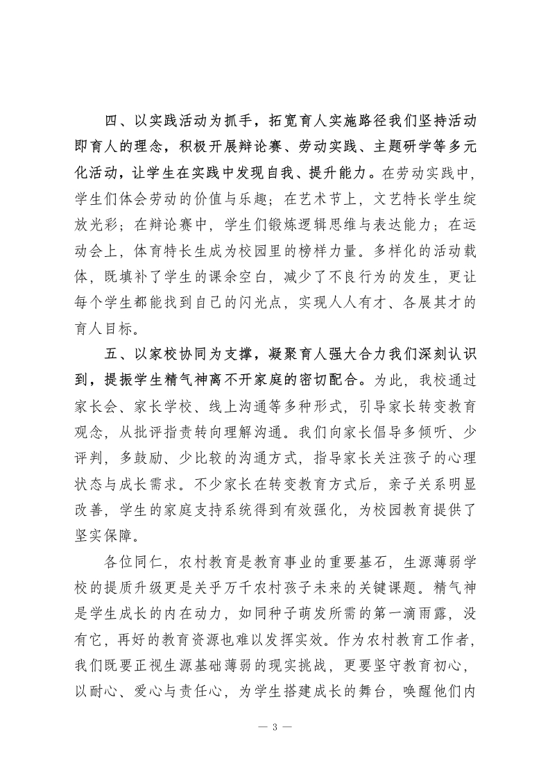 农村学校校长经验交流发言:“精气神”才是核心育人引擎各位同仁:大家好!今天,我们齐聚一堂,共同探讨农村生源薄弱学校的发展路径,交流育人实践经验。作为长期深耕农村教育一线的教育工作者,我深感责任重大。当前,部分农村学校面临生源基础薄弱、学生学习习惯欠佳、自信心不足等现实挑战,不少学生因长期学业受挫,被贴上后进生标签,逐渐陷入自我否定、消极懈怠的状态一一早读课堂缺乏专注、课堂学习精神萎靡、课余生活单调乏味,这些现象不仅影响学生个体成长,更制约着农村教育质量的提升。经过长期实践探索,我们深刻认识到:生源薄弱学校的提质转型,核心不在于急于弥补知识短板,而在于先唤醒学生的内在动力,提振其精气神。唯有撕掉失败者的负面标签,重塑学生的自信心与归属感,才能为后续的学业提升、全面发展筑牢根基。下面,我将本校在这方面的实践与思考,向各位作简要汇报:一、以正向激励为核心,筑牢学生自信根基我们始终坚持鼓励为主、多元评价的育人导向,从校领导到一线教师,统一教育理念,将正向激励贯穿教育教学全过程。在晨会宣讲、课堂教学、日常管理中,着力传递人人皆可成才、暂时落后不代表终身落后的价值导向,引导学生树立长远发展观。校领导带1