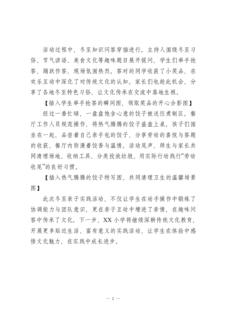 暖冬至·饺香浓·亲子携手传文化一一XX小学2025年冬至实践活动圆满落幕“冬至大如年,人间小团圆”,为传承中华节气文化,增进亲子温情与劳动体验,12月19日下午,XX小学餐厅一楼暖意融融,“暖冬至·饺香浓”亲子包饺子实践活动如期举行。100名学生与25名家长志愿者携手,在指尖翻飞间感受民俗魅力,在欢声笑语中共度美好时光。活动伊始,校长发表致辞,向师生与家长送上冬至祝福,阐释了冬至“阳生春来”的自然智慧与“吃饺御寒”的民俗渊源,强调了活动在文化传承、能力培养与情感联结中的重要意义,并叮嘱全体人员严守安全规范、践行文明实践。【插入校长致辞画面】家长志愿者示范“七步洗手法”,带领学生们做好手部清洁,为食品卫生筑牢第一道防线。【插入家长学生洗手照片】包饺子环节成为活动的核心亮点。25个小组分工明确,家长志愿者耐心示范擀皮、填馅、捏边技巧,手把手教孩子们制作“元宝形“月牙形”饺子。孩子们兴致盎然,有的专注练习擀皮,有的大胆尝试创意造型一一蔬菜汁染色的彩色饺子、憨态可掬的小动物饺子纷纷亮相,每一个饺子都承载着童真与巧思。【插入亲子协作包饺子的特写图,或创意饺子摆盘展示图】1