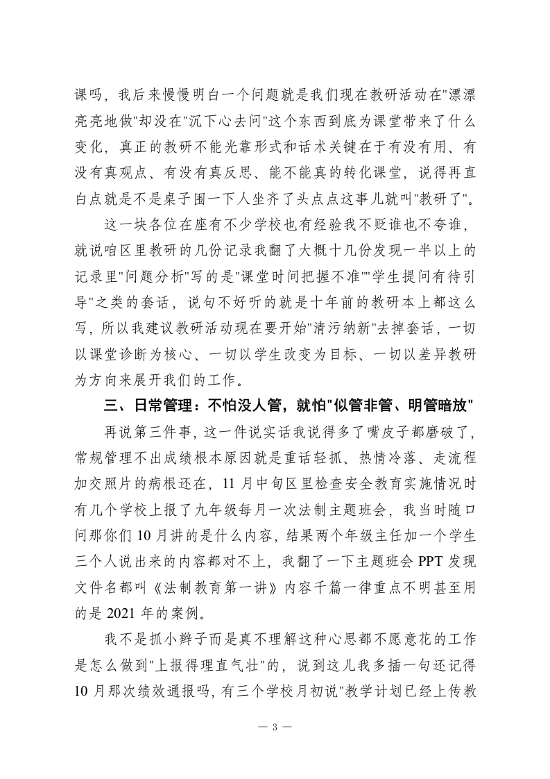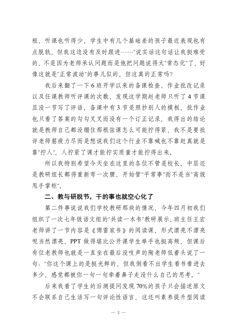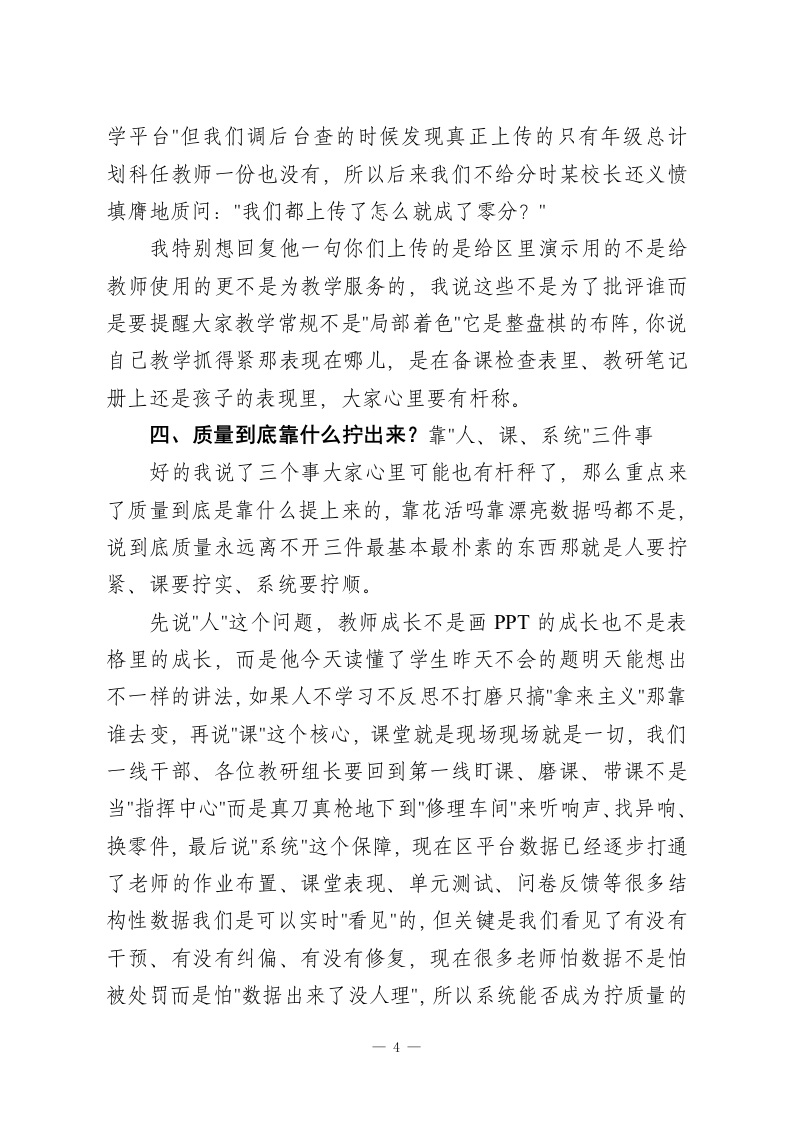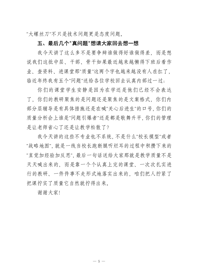 全区教学质量提升推进会上,校长讲话:把人拧紧了,把课拧实了,质量才拧得出!各位校长、各位教研组长、各位老师:大家上午好!先说个不是很客气的开场。我们天天开会讲质量,天天填表写总结、端数据报材料,我就想问一句:我们到底是在抓质量,还是在"演"质量,说句不太文雅的话就是三驾马车都还没套齐我们就喊着要提速,这是不是有点滑稽?今天我就想趁着这个会说几句不新鲜但非常扎心的话,不玩虚的也不谈玄的,就围绕一个核心问题来谈一咱们这个"质量"到底是怎么掉下来的,又该从哪儿拧上来,坦白讲这几年因为“双减”、因为"新课程”、因为"智慧校园",各种文件、试点、政策名词满天飞导致大家有时候真的是"忙得厉害、教得一般",甚至有老师真实地说了这样一句话:"你让我认真上课可以,但你别让我天天写材料、凑形式。"说到这儿我先不讲大道理,就跟大家讲三件我们学校去年发生的小事。一、"人松了"课就散了,质量根本拧不上来第一件事发生在2024年11月底,我们学校八年级6班在一次数学周测中班级平均分比7班低了近12分并且一下掉到了年级倒数第二,我第一时间找了这门课的赵老师谈话,他当时的原话我现在都还记得,他说:"这段时间教案我确实做得比较1