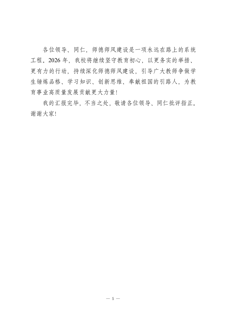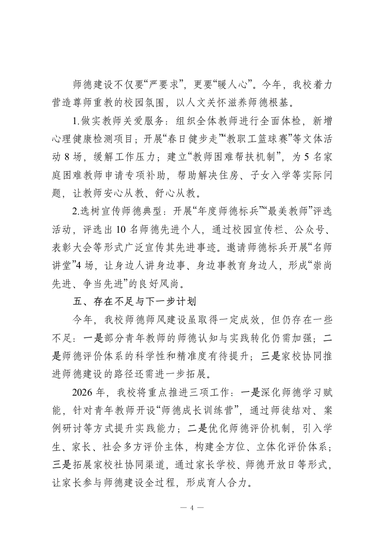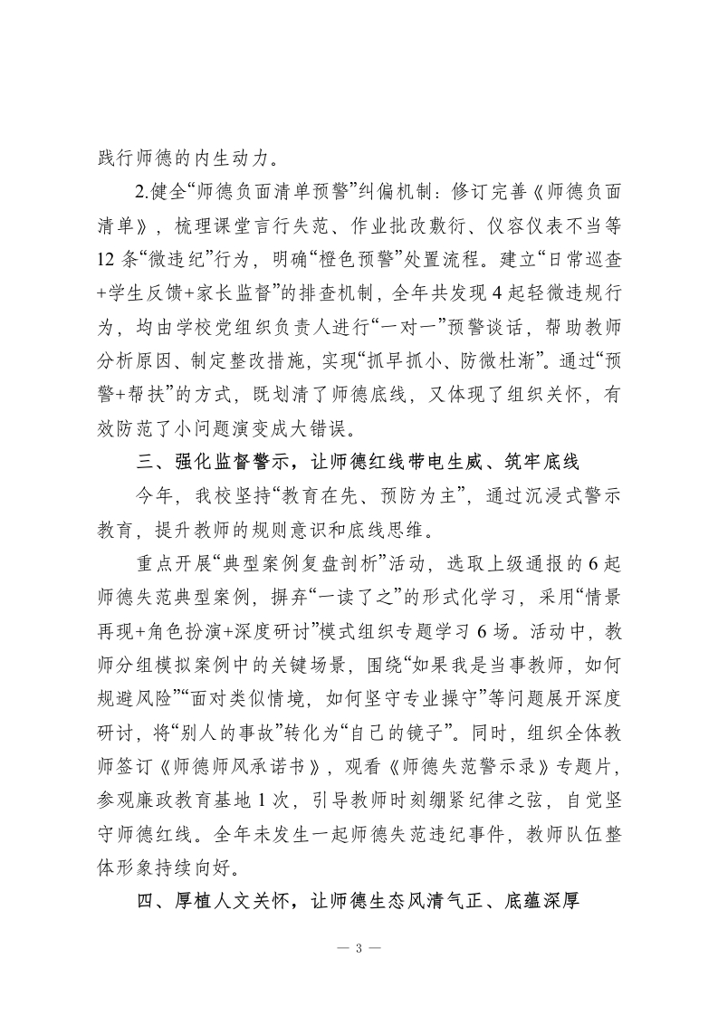 我校2025师德师风建设工作总结汇报:守教育初心育师德之花尊敬的各位领导、各位同仁:大家好!非常荣幸能在此次全区师德师风建设培训大会上,与各位交流分享我校今年度师德师风建设的实践探索与成效反思。师德师风是教育的灵魂所在,关乎学生成长、学校发展和教育事业的根基。今年,我校始终坚守“立德树人”根本任务,摒弃形式主义、力戒空谈浮躁,以“有温度、接地气、见实效”为核心导向,探索构建“思想引领、制度保障、监督警示、人文浸润”四位一体的建设体系,推动师德师风建设从“外在要求”转化为教师“内在自觉”,从“阶段性活动”升级为“常态化实践”。现将本年度工作情况汇报如下,恳请批评指正。一、创新学习载体,让师德理念入脑入心、扎根生长今年,我校打破传统“单向灌输”的学习模式,以“问题导向、情感共鸣”为核心,打造多元化学习平台,让师德学习真正活起来、实起来。1.“师德微论坛”嵌入教研日常:将师德学习与学科教研深度融合,在每周各教研组活动中固定设置15分钟“师德微论坛”。全年围绕“双减’背景下如何平衡作业质量与学生负担”“面对青春期学生叛逆,如何有效沟通引导”“家长过度焦虑时,如何做好家校协同”等18个一线真实教育场景设定主题,开展研讨461