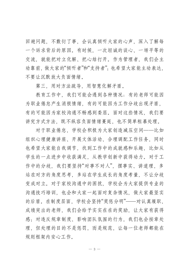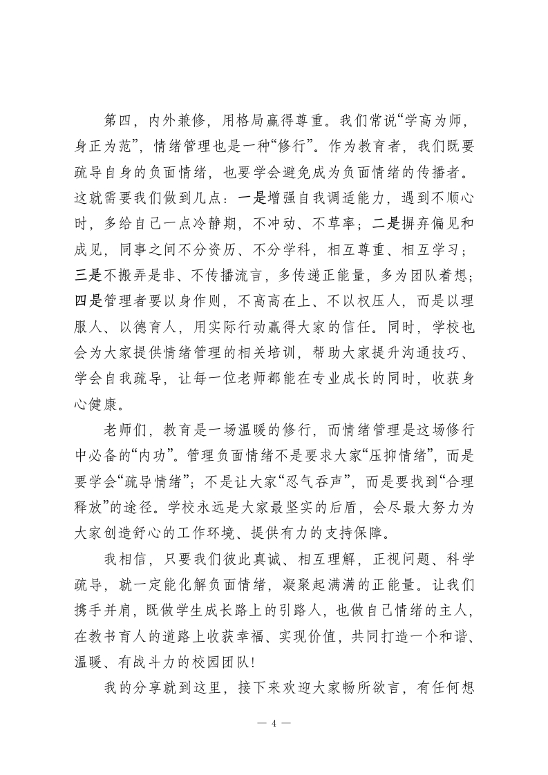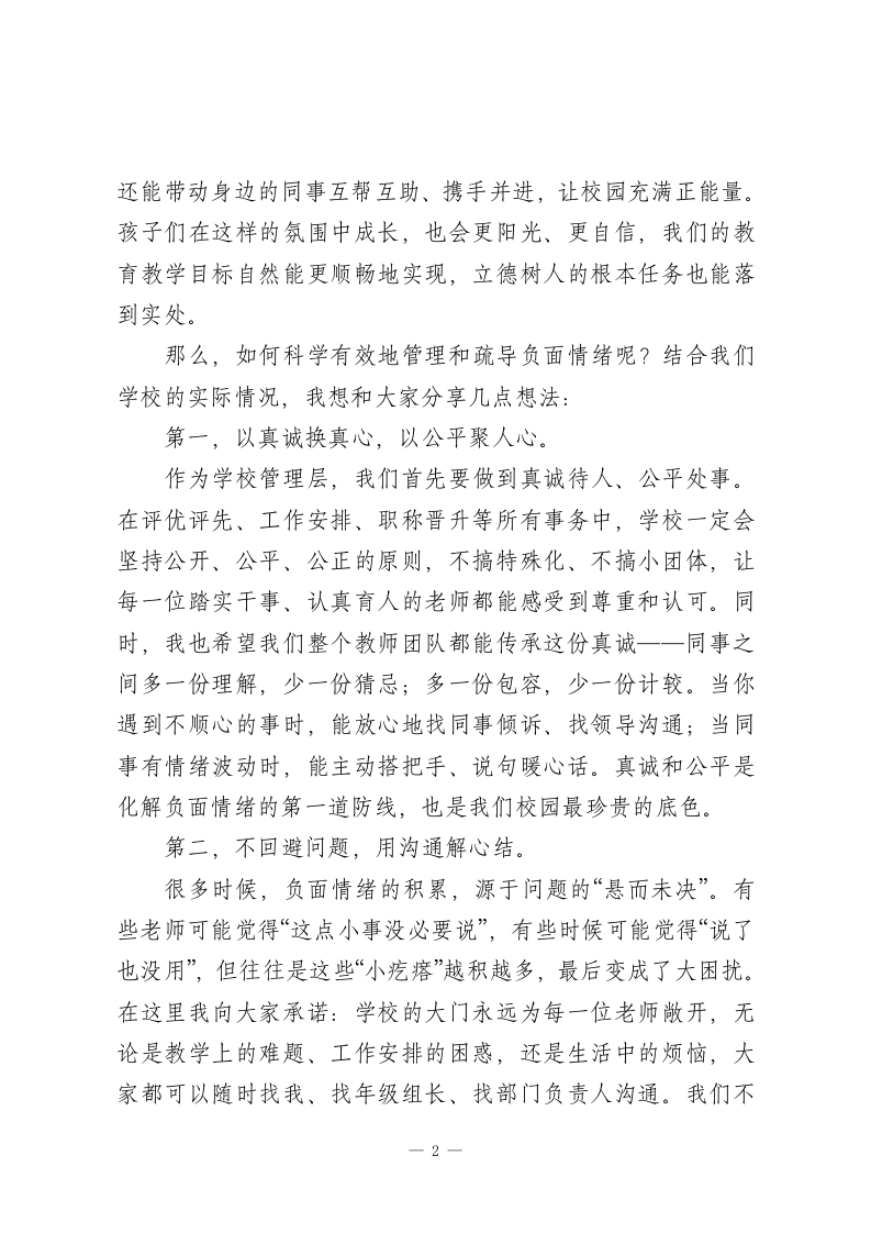 校长在全体教师会上讲话:正视情绪,争做身心健康的幸福教育人各位老师:大家下午好!今天把大家召集起来,想和大家谈一个特别重要的话题一教师的负面情绪管理。我们从事教育工作,每天面对几十个孩子的成长需求、繁杂的教学任务、家校沟通的责任,长期处在高压环境中,产生一些负面情绪是人之常情。但如何疏导这些情绪、不让它蔓延扩散,不仅关乎我们自身的身心健康,更影响着课堂教学的质量、学生的成长状态,以及整个校园的育人氛围。作为校长,我既是学校的管理者,更是大家的同行者、支持者,今天想和大家坦诚交流,聊聊我们该如何共同面对、妥善处理负面情绪。首先,我们要正视负面情绪的影响。就像我们教书育人讲究“润物细无声”,负面情绪的传播也有着类似的穿透力。如果我们的负面情绪得不到及时疏导,任由其积累扩散,不仅会让自己失去工作热情、产生职业倦怠,觉得身心疲惫;还可能影响与同事的协作,出现猜疑、抱怨、内耗的情况,破坏团队的凝聚力;更重要的是,我们的情绪会直接传递给学生,影响课堂的师生互动,甚至给孩子的心理健康带来隐性伤害。反过来想,如果我们能保持积极平和的心态,工作有干劲、育人有激情,不仅自己能在教育事业中收获成就感和幸福感,-1