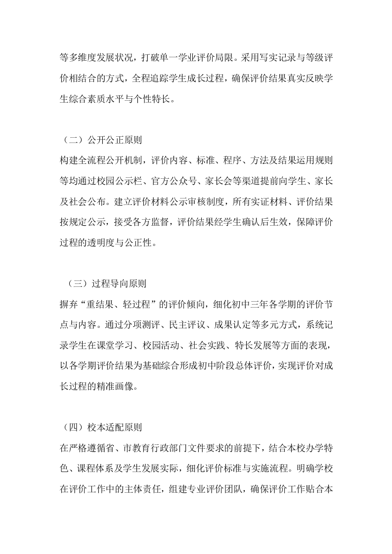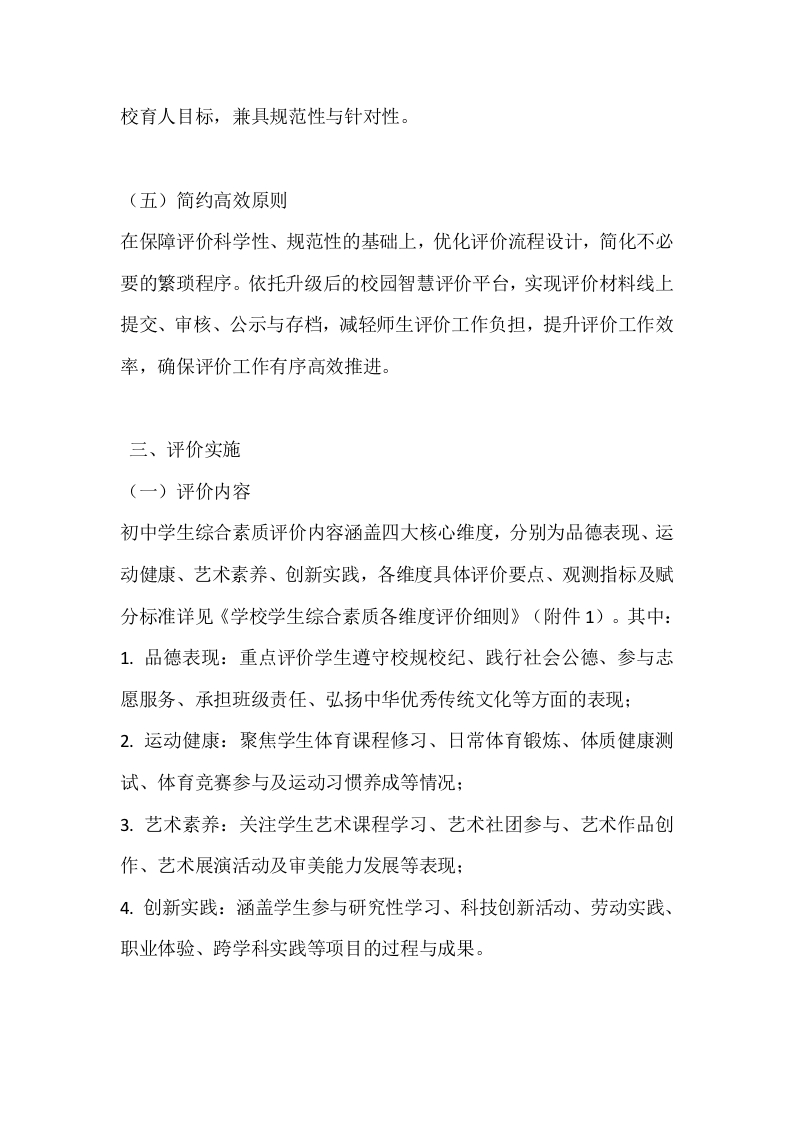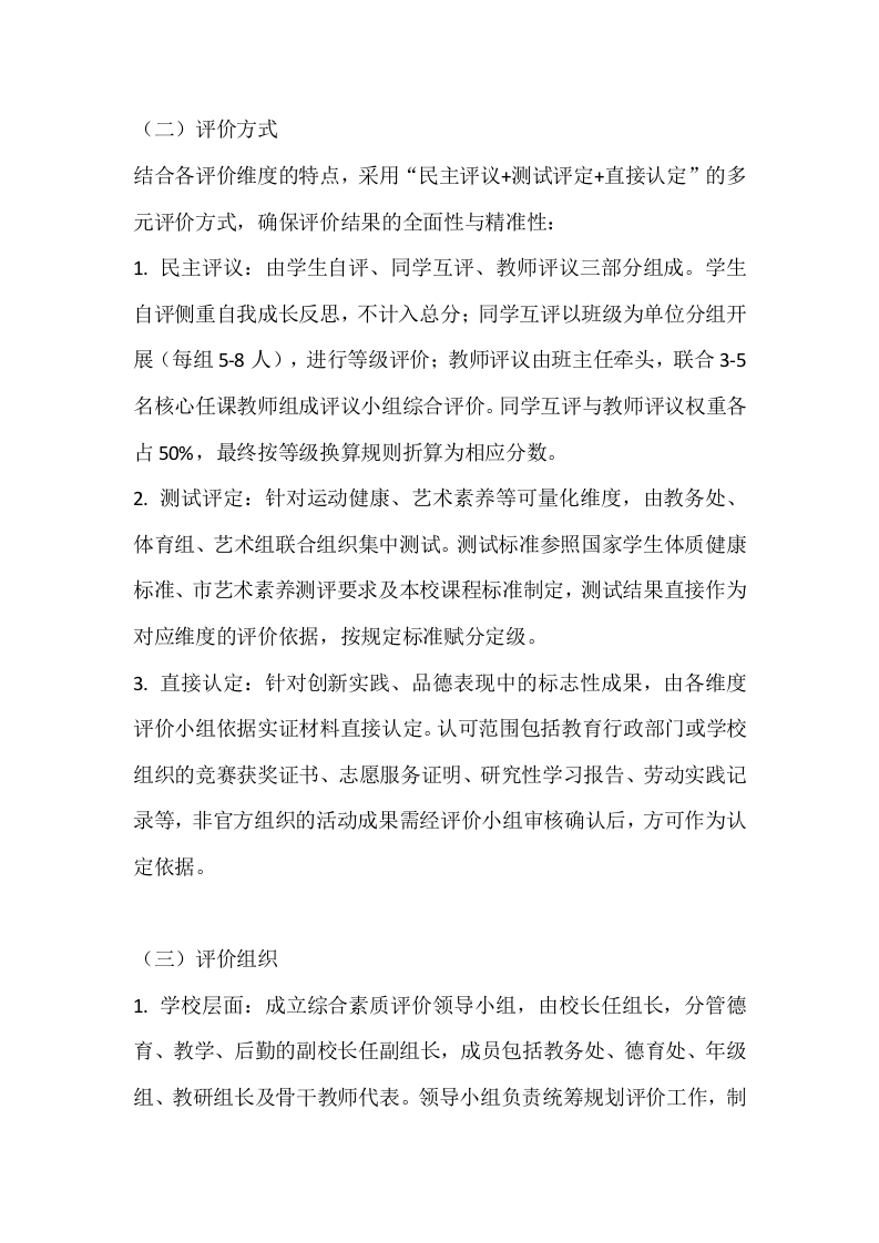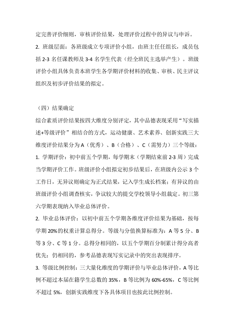 学生综合素质测评实施方案及细则(2026年修订版)为全面贯彻立德树人根本任务,客观精准反映学生综合素质发展水平与个性特长,构建科学规范、务实高效的综合素质评价体系,推动素质教育长效实施,依据省、市教育行政部门相关文件精神,结合本校办学实际与2025年实施经验,特修订本实施方案及细则,自2026年1月1日起正式施行。一、总体要求坚持以立德树人为核心导向,立足学生全面发展与终身成长,全面、全程、真实记录学生初中阶段成长轨迹。通过科学评价引导学校转变育人模式,激发学生主动发展意识,培养德智体美劳全面发展的社会主义建设者和接班人。本方案适用于2023级及以后全体初中学生,综合素质评价结果作为学生初中毕业的必备条件、高中招生的前置要求,并按规定折算分值纳入高中升学总分,建立评价结果与招生录取的紧密联动机制,充分发挥评价的育人导向与激励功能。二、基本原则(一)全面客观原则统筹兼顾学生道德品行、学业发展、身心素养、艺术修养、实践创新