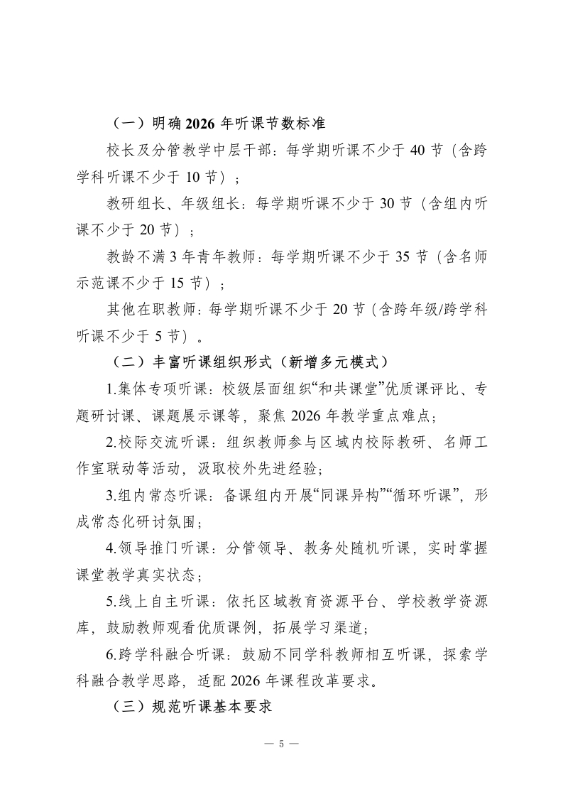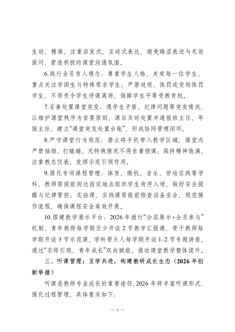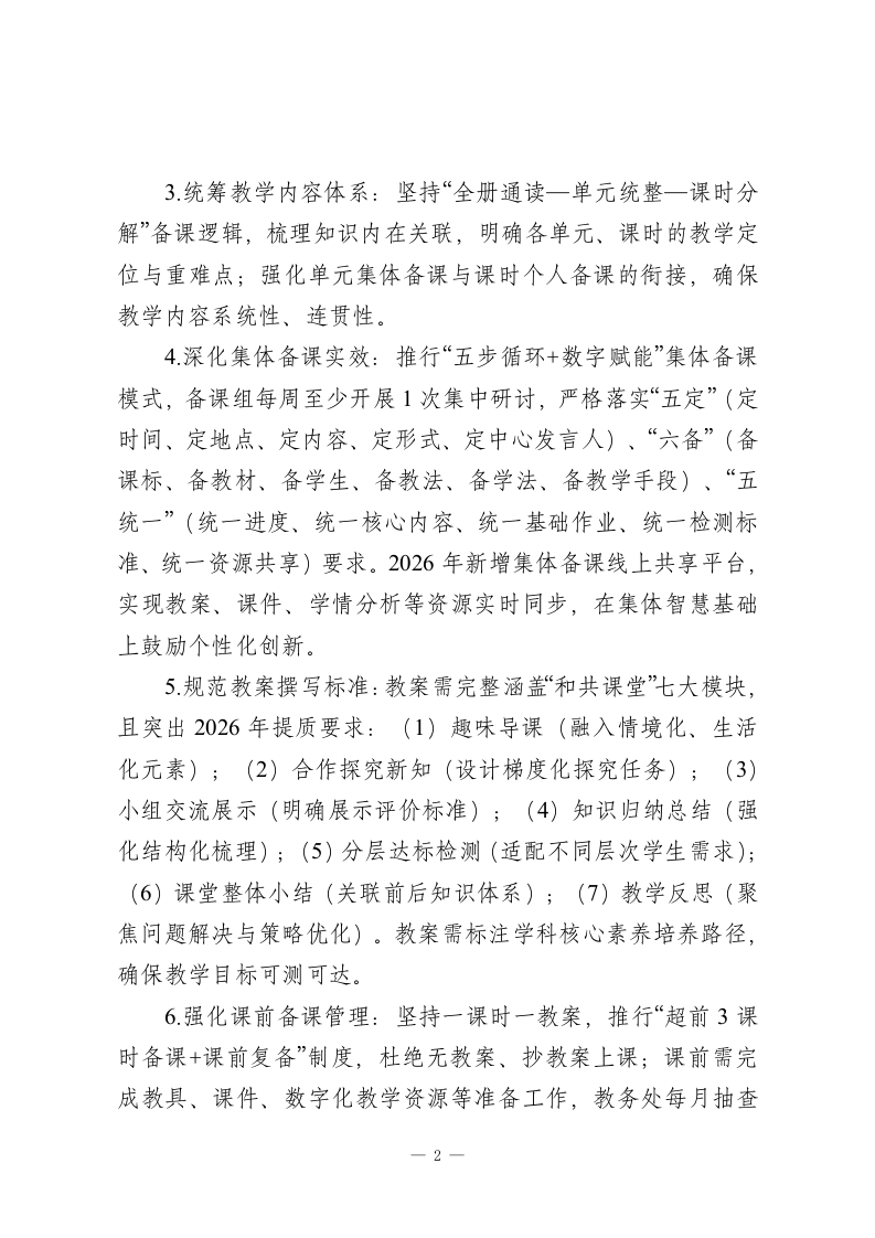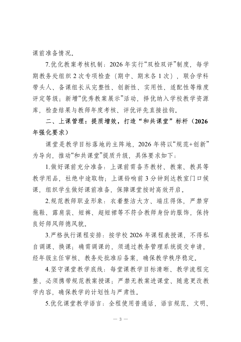 学校备课、上课、听课、评课精细化管理制度(2026修订版)为深入贯彻党的教育方针,落实立德树人根本任务,进一步规范2026年教师教学行为,深化“和共课堂”教学模式迭代升级,搭建教师专业成长长效平台,促进学科优势互补与协同共进,推动学校教育教学工作科学化、规范化、高品质发展,助力学生德智体美劳全面发展,特修订本管理制度,作为2026年全校教学核心管理依据。一、备课管理:精准赋能,筑牢课堂教学根基(2026年重点优化)备课是践行“和共课堂”理念、保障教学质量的前置核心环节,2026年将聚焦“精准化、协同化、个性化”提升,具体要求如下:1.坚守备课核心准则:严格落实“五有”标准,即脑中有“纲”(精准对标2026年新课标要求)、胸中有“本”(深度整合教材与校本资源)、目中有“人”(依托学情数据库精准画像)、心中有“数”(明晰学生认知差异与成长需求)、手中有“法”(创新适配“和共课堂”的教学方法),确保备课兼具科学性与实操性。2.夯实备课理论支撑:组织教师全员参与2026年新课标专题培训,结合学科核心素养要求深入解读教材;通过课堂观察、作业分析、学情问卷等多元方式,建立动态更新的学生学情档案,为精准备课提供数据支撑。1