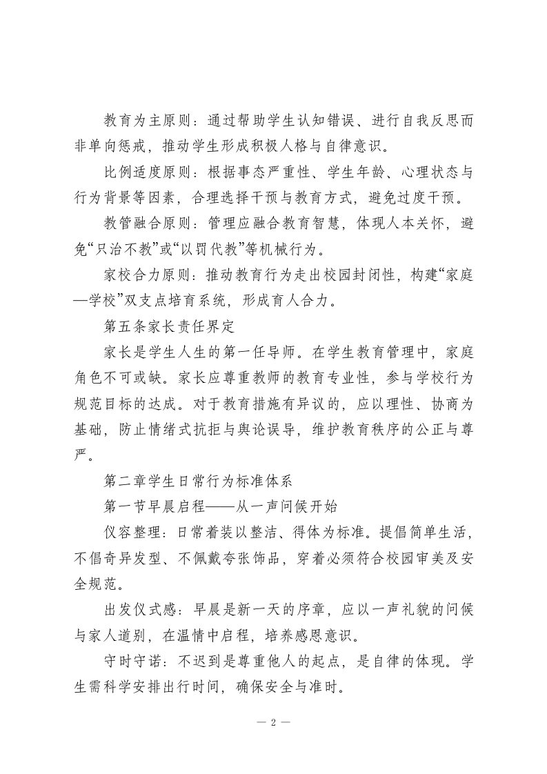 学校行为准则测与教育管理实施办法(2026年试行)第一章教育理念与管理原则第一条教育的本质:唤醒责任与人格的成长在新时代背景下,学校教育不应仅着眼于知识的传授,而应升华为一种促进人格养成与社会责任担当的全过程实践。本校以“育人为本、立德为先”为根本宗旨,致力于打造有温度、有原则、有质量的育人环境,通过科学规范的教育管理活动,协助学生在规则中求发展,在责任中见成长。第二条管理导向:支持成长的力量,而非约束的枷锁我们坚信,教育管理并非单纯的纪律管控,更不是惩戒手段的功能性执行,而是为未成年人成长搭起的安全框架与价值纽带。校内一切教育与管理行为,均以学生综合素养提升为导向,以促进理解、矫正行为、培养规范认知为落脚点。第三条适用范围:适用于全体教职员工在承担育人职责中所实施的所有教育引导行为,包括但不限于课堂管理、课外辅导、行为辅正、心理辅导、习惯养成、德育指导等教育管理实践。第四条教育管理五项核心原则合法性原则:所有教育管理行为必须基于真实发生的不当行为,具有事实依据,实施程序符合法规与校规,不得以任何理由进行体罚或变相体罚。一1