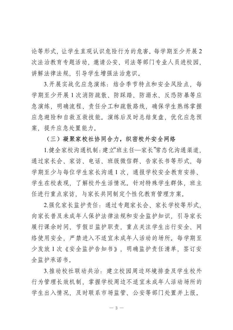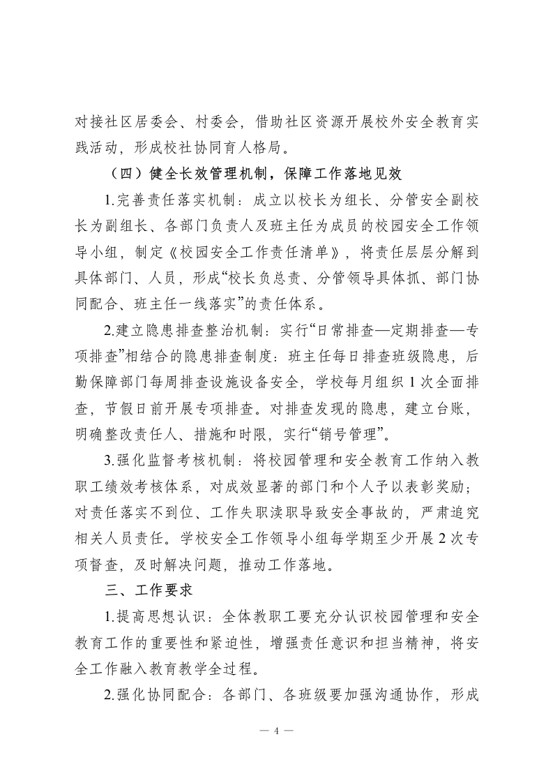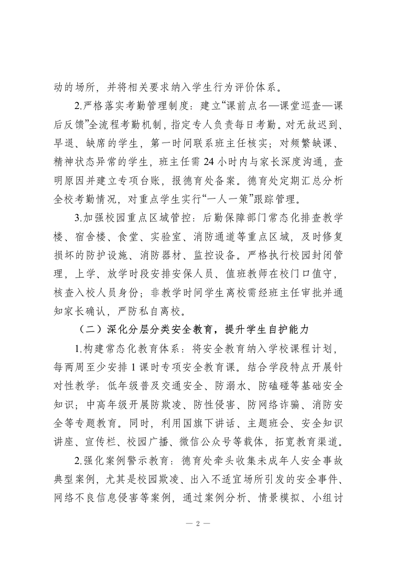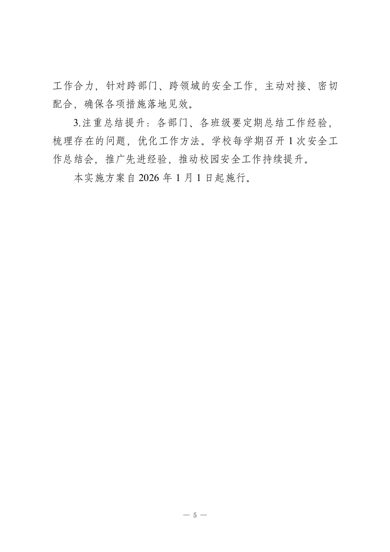 学校加强校园管理与安全教育工作实施方案(2026修订版)为深入贯彻国家关于未成年人保护与校园安全工作的系列指示精神,切实筑牢校园安全防线,保障未成年学生身心健康与生命安全,营造平安、和谐、有序的育人环境,结合我校2025年安全工作实践及2026年新形势、新要求,特修订本实施方案,适用于全校各年级、各班级及全体教职工,请严格遵照执行。一、总体要求坚持以习近平新时代中国特色社会主义思想为指导,牢固树立“安全第一、预防为主、综合治理”核心理念,始终把学生生命安全和身心健康放在首位。以压实安全责任为核心,以健全制度体系为保障,以强化教育引导为基础,以家校社协同联动为支撑,全面排查整治校园及周边安全隐患,精准防控各类安全风险,构建全链条、全方位、全覆盖的校园安全管理体系,为学生全面健康成长保驾护航。二、重点任务及实施措施(一)强化校园全流程管理,筑牢校内安全防线1.规范学生日常行为管理:各班级结合学段特点,修订《班级学生日常行为规范细则》,明确课堂、课间、上下学等关键环节行为要求。严禁学生携带管制刀具、易燃易爆等危险物品入校,严禁校园内追逐打闹、攀爬翻越等危险行为;明确告知学生禁止出入台球室、酒吧、网吧、KTV等不适宜未成年人活1