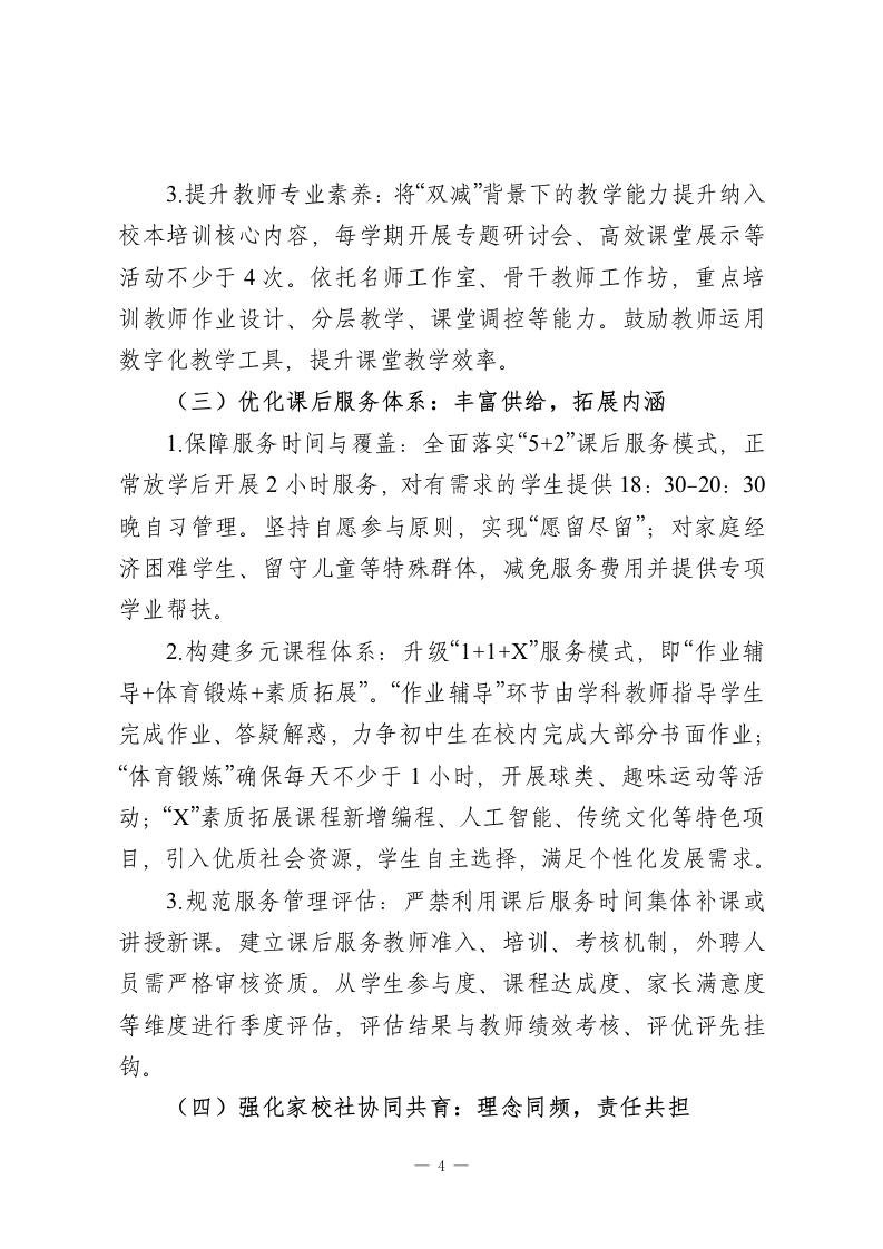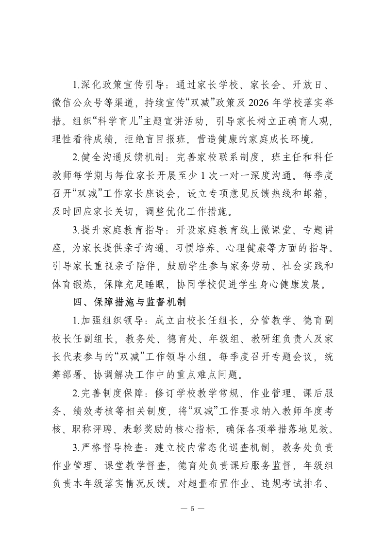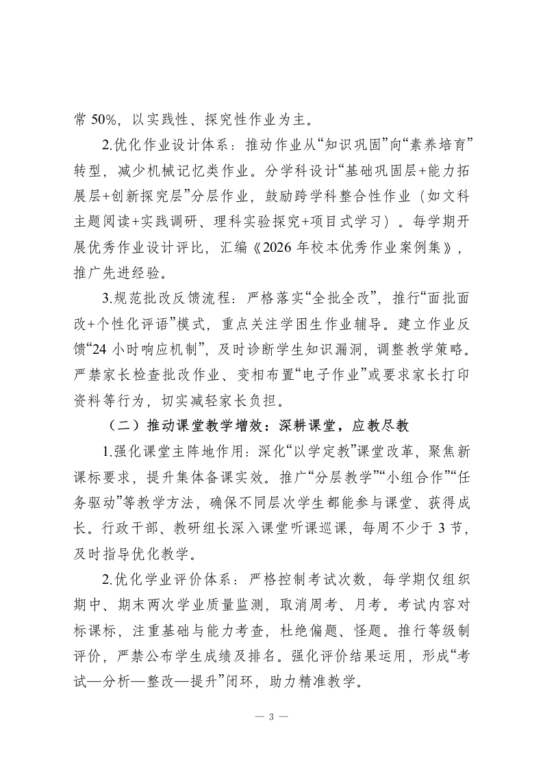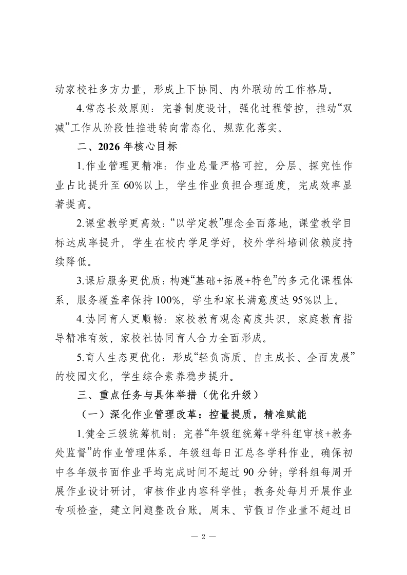学校深化“双减”政策实施工作方案(2026修订版)为深入贯彻国家“双减”政策最新部署,全面落实立德树人根本任务,结合我校“为每一位学生的终身发展奠基”的办学理念与政策落实成效,特修订本方案。旨在通过系统优化作业管理、课堂教学、课后服务与家校协同机制,持续构建高质量校园教育生态,切实促进学生全面发展、健康成长,为“双减”工作提质增效明确路径。一、指导思想与工作原则(一)指导思想以学生全面发展和健康成长为核心,坚守学校教育主阵地,深化“双减”工作内涵。通过观念更新、机制创新、服务升级,推动“双减”从“减负担”向“提质量“育素养”转型,让教育回归本真,努力办人民满意的教育。(二)工作原则1.学生为本原则:遵循教育规律与学生成长规律,聚焦学生身心健康与核心素养培育,让“双减”成果真正惠及每一位学生。2.提质增效原则:将“减负”与“提质”深度绑定,以课堂教学改革为核心,以作业优化、课后服务升级为支撑,实现“减量不减质”。3.统筹协同原则:统筹校内教学、作业、服务等环节,联-1