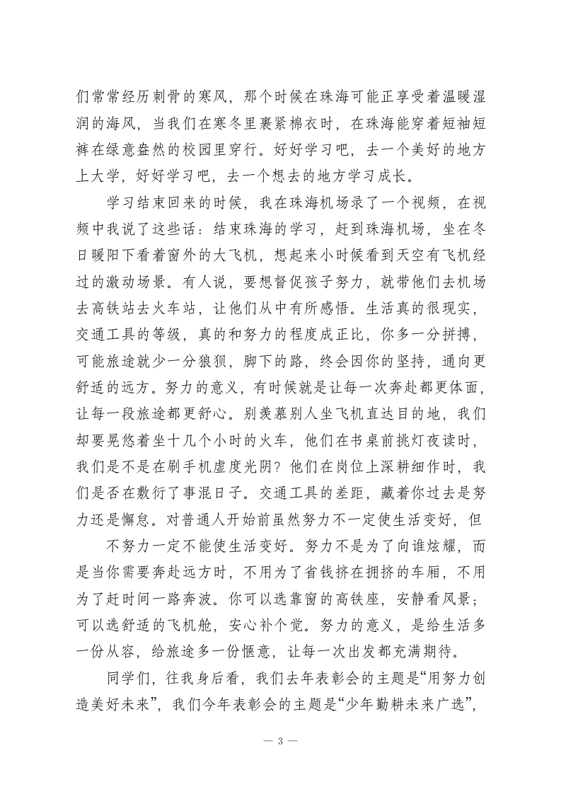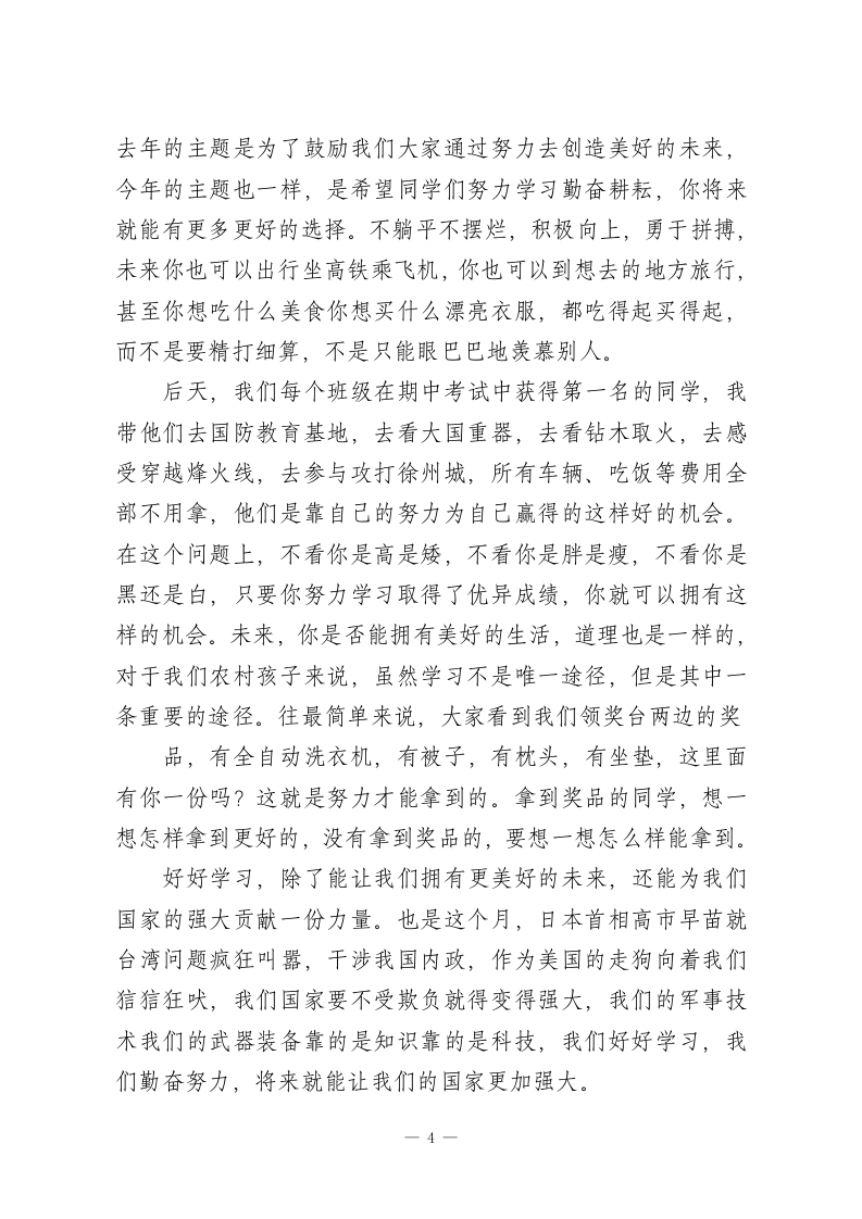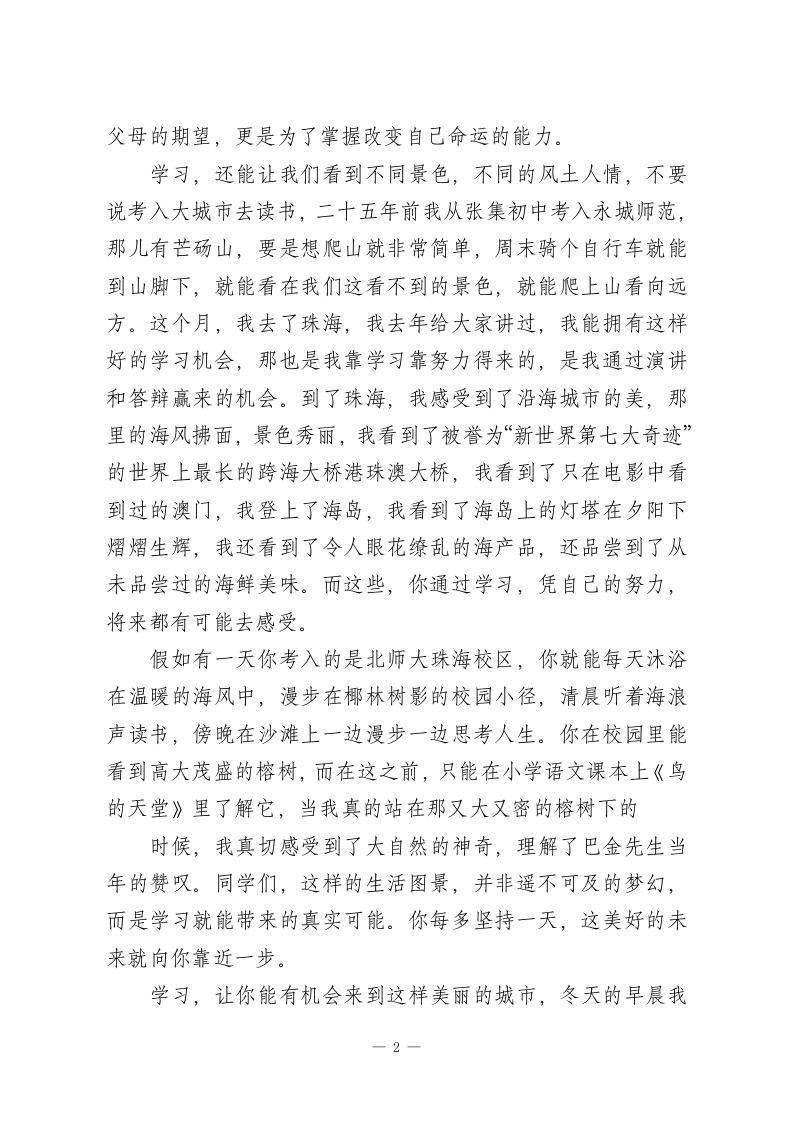 在2025期中表彰会上的发言各位家长、各位老师、同学们:大家下午好!今天,我们召开2025年秋季的期中表彰大会,我刚从X回来,两次外出学习去的都是北师大,上一次是X校区,这一次是X校区。从X校区学习回来,我给同学们分享了我学习期间的见闻及感受,今天我想给同学们再次分享今年学习期间的见闻和感受,一共分两个部分吧。第一,我们为了什么学习?同学们,今天我所讲的学习,是我们在学校的学习。我们学习的路是漫长的,不说幼儿园,小学六年,初中三年,高中三年,本科四年,这就已经是十六年了,如果再考研读博,那就得二十年之多,如此漫长且辛苦,这是为什么呢?我记得我小时候,听得最多的是家长的唠叨,要好好学习,将来考大学找个好工作,就不用面朝黄土背朝天了。意思就是说,学习是为了将来生活得更好,我们常说知识改变命运,我告诉大家,这是事实。只说我们农村,无数人通过学习走出了农村改变了命运。他们靠知识摆脱了贫困,进入了城市,有了体面的职业和稳定的生活。学习,赋予了我们的未来有更多的机会与可能。今天,我们坐在教室里,每一页书、每一堂课,都是在为未来铺路。学习的过程虽苦,但这份苦背后承载的是希望,都是对更好生活的追求。我们努力,不仅是为了不辜负1