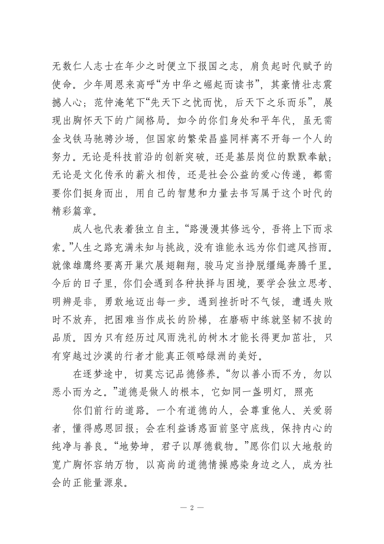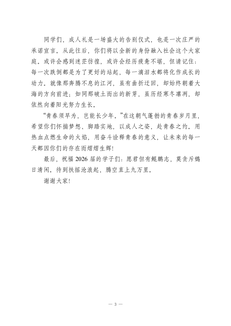 在2026届学子成人仪式上的致辞:以成人之姿赴青春之约亲爱的同学们、尊敬的家长们、各位老师:大家好!在这沉淀着耕耘印记、孕育着崭新希望的美好时节,我们齐聚一堂,共同见证你们人生中极具分量的时刻一一成人礼。从此刻起,你们将告别青涩懵懂的少年时代,正式迈向成熟担当的青年征程。站在这里,看着你们眼中闪烁的朝气与坚定,我心中满是感慨,更涌动着对你们的殷切期望与美好祝福。回首往昔,那些挑灯夜读的时光宛如繁星点点,镶嵌在记忆的长河之中。恰如古人云:“宝剑锋从磨砺出,梅花香自苦寒来。”你们在知识的海洋里奋力遨游,用汗水浇灌理想的花朵。课堂上专注的眼神、笔记本上密密麻麻的字迹、考场中沉着应战的身影…每一帧画面都是你们为梦想拼搏的见证。而如今,站在十八岁的门槛上,你们已不再是懵懂孩童,当以成人的姿态审视自己走过的路,更要坚定地望向未来的远方。“冠者,礼之始也。”成人礼是流传千年的古老仪式,它承载着中华文脉的传承,也寄托着家族与时代的期许。古时弱冠之年行冠礼,意味着从此肩负起成年人的责任与义务,要以“修身齐家治国平天下”的胸怀立身行事。如今,时代浪潮奔涌向前,但这一仪式所蕴含的“成长即担当”的精神内核,从未改变。成人意味着责任担当。“天下兴亡,匹夫有责。”古往今来,一1